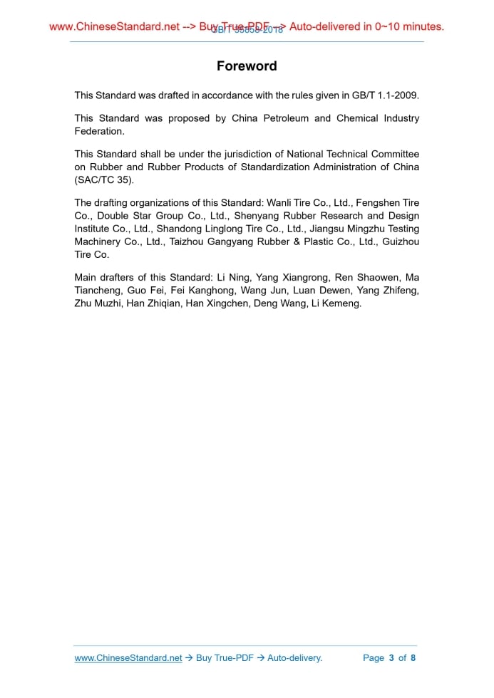 Similar standardsGB/T 35858-2018: Rubber, vulcanized -- Test method of salt mist aging---This is an excerpt. Full copy of true-PDF in English version (including equations, symbols, images, flow-chart, tables, and figures etc.), auto-downloaded/delivered in 9 seconds, can be purchased online: https://www.ChineseStandard.net/PDF.aspx/GBT35858-2018GB NATIONAL STANDARD OF THE PEOPLE’S REPUBLIC OF CHINA ICS 83.060 G 40 Rubber, vulcanized - Test method of salt mist aging Issued on: FEBRUARY 06, 2018 Implemented on: SEPTEMBER 01, 2018 Issued by. General Administration of Quality Supervision, Inspection and Quarantine; Standardization Administration of the People's Republic of China. Table of ContentsForeword ... 3 1 Scope ... 4 2 Normative references ... 4 3 Method summary ... 4 4 Test devices ... 5 5 Test material and reagents ... 5 6 Sample ... 5 7 Test conditions ... 5 8 Test steps ... 6 9 Expression of test result ... 7 10 Test report ... 7ForewordThis Standard was drafted in accordance with the rules given in GB/T 1.1-2009. This Standard was proposed by China Petroleum and Chemical Industry Federation. This Standard shall be under the jurisdiction of National Technical Committee on Rubber and Rubber Products of Standardization Administration of China (SAC/TC 35). The drafting organizations of this Standard. Wanli Tire Co., Ltd., Fengshen Tire Co., Double Star Group Co., Ltd., Shenyang Rubber Research and Design Institute Co., Ltd., Shandong Linglong Tire Co., Ltd., Jiangsu Mingzhu Testing Machinery Co., Ltd., Taizhou Gangyang Rubber & Plastic Co., Ltd., Guizhou Tire Co. Main drafters of this Standard. Li Ning, Yang Xiangrong, Ren Shaowen, Ma Tiancheng, Guo Fei, Fei Kanghong, Wang Jun, Luan Dewen, Yang Zhifeng, Zhu Muzhi, Han Zhiqian, Han Xingchen, Deng Wang, Li Kemeng. Rubber, vulcanized - Test method of salt mist aging WARNING. Personnel using this Standard shall have hands-on experience in formal laboratory work. This Standard does not address all possible safety issues, and the user is responsible for taking appropriate safety and health measures and ensuring compliance with the relevant national regulations. Attention. Some of the operations covered by this Standard may use, produce, or generate waste and have a pollution impact on the local environment. Appropriate documentation for disposal of these materials shall be developed.1 ScopeThis Standard specifies the test method for determining the change of appearance and physical properties of vulcanized rubber after it is aged in salt mist environment. This Standard is applicable to the evaluation of the resistance of vulcanized rubber to salt mist aging.2 Normative referencesThe following referenced documents are indispensable for the application of this document. For dated references, only the edition cited applies. For undated references, the latest edition of the referenced document (including any amendments) applies. GB/T 2941, Rubber - General procedures for preparing and conditioning test pieces for physical test methods GB/T 6682, Water for analytical laboratory use - Specification and test methods GB/T 10587, Specifications for salt mist testing chambers3 Method summaryExpose a vulcanized rubber sample to a salt mist environment. Under the action of hot air and salt solution, the performance of the sample before and after aging is tested after a specified time so as to evaluate the salt mist aging resistance d) Salt mist settling rate. 1.0 mL/(h·80cm2) ~ 2.0 mL/(h·80cm2). 7.2 The test period can be determined according to actual needs or consultations of relevant parties. The following test cycles are recommended. a) 24h, or multiple of 24h; b) 7d, or multiple of 7d. 7.3 For sample adjustment, unless otherwise specified, the sample shall be adjusted according to the relevant provisions of GB/T 2941 before and after the salt mist aging test.8 Test steps8.1 The preparation of the salt mist solution (sodium chloride solution) includes the following two steps. a) Preparation of sodium chloride solution. dissolve sodium chloride (5.1) of which the mass is (5±1) portions in water (5.4) of which the mass is 95 portions; b) Sodium chloride solution pH adjustment. when the temperature is (35±2)°C, the pH shall be controlled within the range of 6.5~7.2. If the pH value is out of range, use hydrochloric acid solution (prepared from 5.2 hydrochloric acid at a concentration of 0.1mol/L~0.5mol/L) or sodium hydroxide solution (prepared from 5.3 sodium hydroxide at a concentration of 0.1mol/L~0.5mol/L) to adjust. 8.2 First adjust the sample according to 7.3. Then determine the performance of the sample before aging. 8.3 Open the salt mist aging box. After the specified test conditions are met, the sample is put into the test and the test time is calculated. 8.4 The sample shall be placed in the effective working area of the salt mist aging box for exposure. At the same time, care shall be taken to avoid accumulation of fluid on the surface of the sample. Samples shall not overlap or touch each other, and the spacing shall not be less than 5mm. The distance between the sample and the wall of the box shall not be less than 70mm. 8.5 Salt mist settling rate shall be monitored at least every 24h to ensure it is within the specified range. The salt mist settling rate test method shall be carried out in accordance with the provisions of GB/T 10587. 8.6 After the specified test time is reached, the sample is taken out from the salt mist aging box. Use distilled water or deionized water to wash the salt or other ......Source: Above contents are excerpted from the full-copy PDF -- translated/reviewed by: www.ChineseStandard.net / Wayne Zheng et al. Tips & Frequently Asked Questions:Question 1: How long will the true-PDF of English version of GB/T 35858-2018 be delivered?Answer: The full copy PDF of English version of GB/T 35858-2018 can be downloaded in 9 seconds, and it will also be emailed to you in 9 seconds (double mechanisms to ensure the 