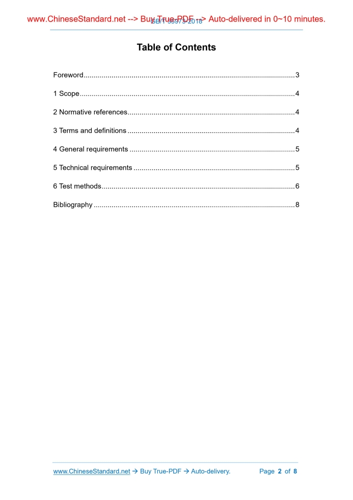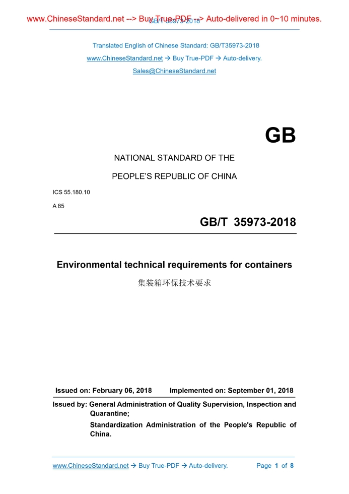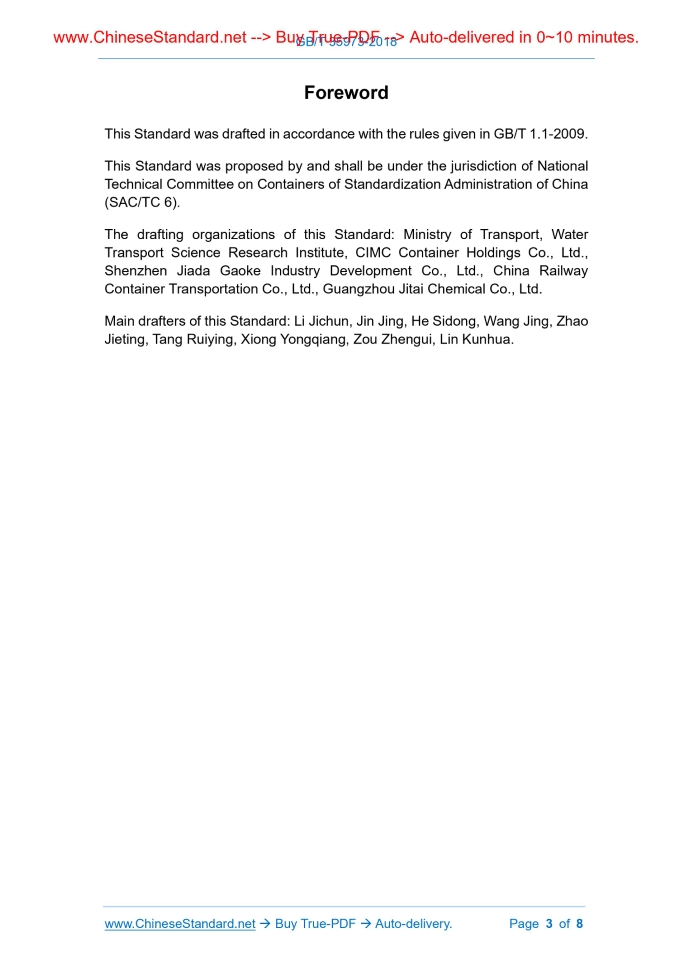 Similar standardsGB/T 35973-2018: Environmental technical requirements for containers---This is an excerpt. Full copy of true-PDF in English version (including equations, symbols, images, flow-chart, tables, and figures etc.), auto-downloaded/delivered in 9 seconds, can be purchased online: https://www.ChineseStandard.net/PDF.aspx/GBT35973-2018GB NATIONAL STANDARD OF THE PEOPLE’S REPUBLIC OF CHINA ICS 55.180.10 A 85 Environmental technical requirements for containers Issued on: FEBRUARY 06, 2018 Implemented on: SEPTEMBER 01, 2018 Issued by. General Administration of Quality Supervision, Inspection and Quarantine; Standardization Administration of the People's Republic of China. Table of ContentsForeword ... 3 1 Scope ... 4 2 Normative references ... 4 3 Terms and definitions ... 4 4 General requirements ... 5 5 Technical requirements ... 5 6 Test methods ... 6 Bibliography ... 8ForewordThis Standard was drafted in accordance with the rules given in GB/T 1.1-2009. This Standard was proposed by and shall be under the jurisdiction of National Technical Committee on Containers of Standardization Administration of China (SAC/TC 6). The drafting organizations of this Standard. Ministry of Transport, Water Transport Science Research Institute, CIMC Container Holdings Co., Ltd., Shenzhen Jiada Gaoke Industry Development Co., Ltd., China Railway Container Transportation Co., Ltd., Guangzhou Jitai Chemical Co., Ltd. Main drafters of this Standard. Li Jichun, Jin Jing, He Sidong, Wang Jing, Zhao Jieting, Tang Ruiying, Xiong Yongqiang, Zou Zhengui, Lin Kunhua. Environmental technical requirements for containers1 ScopeThis Standard specifies environmental technical requirements and corresponding inspection methods for containers. This Standard is applicable to the general cargo container defined in GB/T 5338. Other types of containers can refer to this Standard for use.2 Normative referencesThe following referenced documents are indispensable for the application of this document. For dated references, only the edition cited applies. For undated references, the latest edition of the referenced document (including any amendments) applies. GB/T 1992, Freight container vocabulary GB 18582, Indoor decorating and refurbishing materials - Limit of harmful substances of interior architectural coatings GB 18583, Indoor decorating and refurbishing materials - Limit of harmful substances of adhesives HJ 571, Technical requirement for environmental labeling products - Wood based panels and finishing products HJ 2537, Technical requirement for environmental labeling products3 Terms and definitionsFor the purposes of this document, the terms and definitions defined in GB/T 1992 as well as the followings apply. 3.1 volatile organic compounds; VOCs general term for any organic compound having an initial boiling point lower than or equal to 250°C at a standard pressure of 101.3 kPa ......Source: Above contents are excerpted from the full-copy PDF -- translated/reviewed by: www.ChineseStandard.net / Wayne Zheng et al. Tips & Frequently Asked Questions:Question 1: How long will the true-PDF of English version of GB/T 35973-2018 be delivered?Answer: The full copy PDF of English version of GB/T 35973-2018 can be downloaded in 9 seconds, and it will also be emailed to you in 9 seconds (double mechanisms to ensure the delivery reliably), with PDF-invoice.Question 2: Can I share the purchased PDF of GB/T 35973-2018_English with my colleagues?Answer: Yes. The purchased PDF of GB/T 35973-2018_English will be deemed to be sold to your employer/organization who actually paid for it, including your colleagues and your employer's intranet.Question 3: Does the price include tax/VAT?Answer: Yes. Our tax invoice, downloaded/delivered in 9 seconds, includes all tax/VAT and complies with 100+ countries' tax regulations (tax exempted in 100+ countries) -- See Avoidance of Double Taxation Agreements (DTAs): List of DTAs signed between Singapore and 100+ countriesQuestion 4: Do you accept my currency other than USD?Answer: Yes. www.ChineseStandard.us -- GB/T 35973-2018 -- Click this link and select your country/currency to pay, the exact amount in your currency will be printed on the invoice. Full PDF will also be downloaded/emailed in 9 seconds.How to buy and download a true PDF of English version of GB/T 35973-2018?A step-by-step guide to download PDF of GB/T 35973-2018_EnglishStep 1: Visit website https://www.ChineseStandard.net (Pay in USD), or https://www.ChineseStandard.us (Pay in any currencies such as Euro, KRW, JPY, AUD).Step 2: Search keyword "GB/T 35973-2018". Step 3: Click "Add to Cart". If multiple PDFs are required, repeat steps 2 and 3 to add up to 12 PDFs to cart. Step 4: Select payment option (Via payment agents Stripe or PayPal). Step 5: Customize Tax Invoice -- Fill up your email etc. Step 6: Click "Checkout". Step 7: Make payment by credit card, PayPal, Google Pay etc. After the payment is completed and in 9 seconds, you will receive 2 emails attached with the purchased PDFs and PDF-invoice, respectively. Step 8: Optional -- Go to download PDF. Step 9: Optional -- Click Open/Download PDF to download PDFs and invoice. See screenshots for above steps: Steps 1~3 Steps 4~6 Step 7 Step 8 Step 9 |