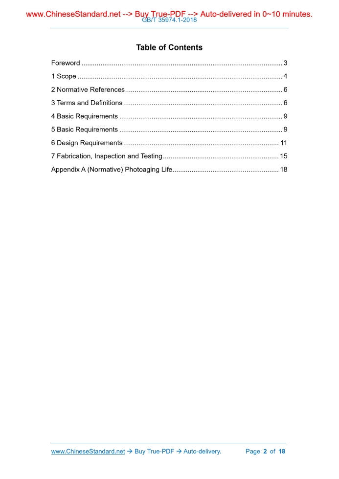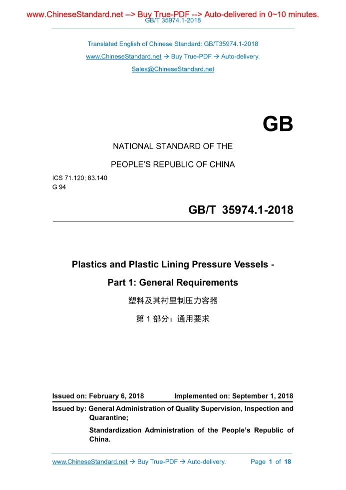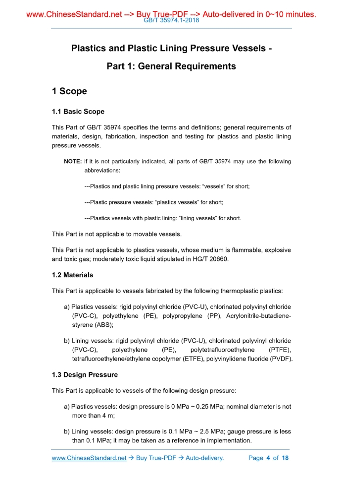 Similar standardsGB/T 35974.1-2018: Plastics and Plastic Lining Pressure Vessels - Part 1: General Requirements---This is an excerpt. Full copy of true-PDF in English version (including equations, symbols, images, flow-chart, tables, and figures etc.), auto-downloaded/delivered in 9 seconds, can be purchased online: https://www.ChineseStandard.net/PDF.aspx/GBT35974.1-2018NATIONAL STANDARD OF THE PEOPLE’S REPUBLIC OF CHINA ICS 71.120; 83.140 G 94 Plastics and Plastic Lining Pressure Vessels - Part 1: General Requirements ISSUED ON: FEBRUARY 6, 2018 IMPLEMENTED ON: SEPTEMBER 1, 2018 Issued by: General Administration of Quality Supervision, Inspection and Quarantine; Standardization Administration of the People’s Republic of China. Table of ContentsForeword ... 3 1 Scope ... 4 2 Normative References ... 6 3 Terms and Definitions ... 6 4 Basic Requirements ... 9 5 Basic Requirements ... 9 6 Design Requirements ... 11 7 Fabrication, Inspection and Testing ... 15 Appendix A (Normative) Photoaging Life ... 18 Plastics and Plastic Lining Pressure Vessels - Part 1: General Requirements1 Scope1.1 Basic Scope This Part of GB/T 35974 specifies the terms and definitions; general requirements of materials, design, fabrication, inspection and testing for plastics and plastic lining pressure vessels. NOTE: if it is not particularly indicated, all parts of GB/T 35974 may use the following abbreviations: ---Plastics and plastic lining pressure vessels: “vessels” for short; ---Plastic pressure vessels: “plastics vessels” for short; ---Plastics vessels with plastic lining: “lining vessels” for short. This Part is not applicable to movable vessels. This Part is not applicable to plastics vessels, whose medium is flammable, explosive and toxic gas; moderately toxic liquid stipulated in HG/T 20660. 1.2 Materials This Part is applicable to vessels fabricated by the following thermoplastic plastics: a) Plastics vessels: rigid polyvinyl chloride (PVC-U), chlorinated polyvinyl chloride (PVC-C), polyethylene (PE), polypropylene (PP), Acrylonitrile-butadiene- styrene (ABS); b) Lining vessels: rigid polyvinyl chloride (PVC-U), chlorinated polyvinyl chloride (PVC-C), polyethylene (PE), polytetrafluoroethylene (PTFE), tetrafluoroethylene/ethylene copolymer (ETFE), polyvinylidene fluoride (PVDF). 1.3 Design Pressure This Part is applicable to vessels of the following design pressure: a) Plastics vessels: design pressure is 0 MPa ~ 0.25 MPa; nominal diameter is not more than 4 m; b) Lining vessels: design pressure is 0.1 MPa ~ 2.5 MPa; gauge pressure is less than 0.1 MPa; it may be taken as a reference in implementation.2 Normative ReferencesThe following documents are indispensable to the application of this Standard. In terms of references with a specified date, only versions with a specified date are applicable to this Standard. In terms of references without a specified date, the latest version (including all the modifications) is applicable to this Standard. GB/T 1040.2 Plastics - Determination of Tensile Properties - Part 2: Test Conditions for Molding and Extrusion Plastics GB/T 16422.2 Plastics - Methods of Exposure to Laboratory Light Sources - Part 2: Xenon-arc Sources GB/T 26501 General Technical Specification for Pressure Vessels Lined with Fluoroplastics GB/T 26929 Terminology for Pressure Vessels GB/T 35974.2 Plastics and Plastic Lining Pressure Vessels - Part 2: Materials GB/T 35974.3 Plastics and Plastic Lining Pressure Vessels - Part 3: Design GB/T 35974.4 Plastics and Plastic Lining Pressure Vessels - Part 4: Fabrication, Inspection and Testing for Plastic Pressure Vessels GB/T 35974.5 Plastics and Plastic Lining Pressure Vessels - Part 5: Fabrication, Inspection and Testing for Pressure Vessels with Plastic Lining HG/T 3915 Reacting Caldron Lined with Fluoroplastics HG/T 20660 Standard for Classification on Hazards of Toxicity and Explosion of Chemical Mediums in Pressure Vessel3 Terms and DefinitionsWhat is defined in GB/T 26929, and the following terms and definitions are applicable to this document. In order to make it convenient for application, certain terms and definitions in GB/T 26929 are repeatedly listed. 3.1 Stationary Pressure Vessel Stationary pressure vessel refers to pressure vessel, which is installed in a fixed position. NOTE: in terms of pressure vessels, which are merely moved and used in devices or field areas for a certain specific purpose, they shall also be constructed in accordance when vessel is under normal operating condition. NOTE: design temperature and design pressure are considered as conditions of design load. 3.8 Calculating Pressure Calculating pressure refers to the pressure used to determine component thickness at corresponding design temperature. NOTE: it includes additional loads, for example, liquid column static pressure. 3.9 Test Pressure Test pressure refers to the pressure of the top of vessel during pressure resistance test or leakage test. [GB/T 26929-2011, Definition 2.3.3] 3.10 Operating Temperature; working temperature Operation temperature/working temperature refers to the temperature of materials inside the vessel under the stipulated normal operating condition. NOTE 1: in domestic and overseas technical documents of the pressure vessel industry, “operating temperature/working temperature” refers to the temperature of materials. NOTE 2: in a vessel, the temperature of materials in different parts might differ; if necessary, operating temperature/working temperature of various parts needs to be respectively pointed out. NOTE 3: sometimes operating temperature/working temperature is also known as operating temperature. [GB/T 26929-2011, Definition 2.4.1] 3.11 Required Thickness Required thickness refers to the thickness obtained through formula calculation in design. NOTE: when needed, required thickness of other loads shall also count. In terms of external pressure component, it refers to the minimum thickness which satisfies the requ