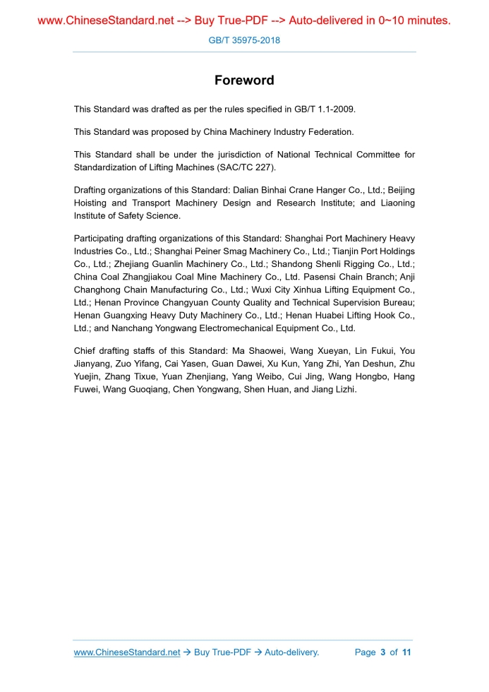 Similar standardsGB/T 35975-2018: Load Lifting Attachments - Classification---This is an excerpt. Full copy of true-PDF in English version (including equations, symbols, images, flow-chart, tables, and figures etc.), auto-downloaded/delivered in 9 seconds, can be purchased online: https://www.ChineseStandard.net/PDF.aspx/GBT35975-2018GB NATIONAL STANDARD OF THE PEOPLE’S REPUBLIC OF CHINA ICS 53.020.30 J 80 Load Lifting Attachments - Classification Issued on: FEBRUARY 06, 2018 Implemented on: SEPTEMBER 01, 2018 Issued by. General Administration of Quality Supervision, Inspection and Quarantine; Standardization Administration of PRC. Table of ContentsForeword ... 3 1 Scope ... 4 2 Terms and Definitions ... 4 3 Types of Load Lifting Attachments ... 5 3.1 General ... 5 3.2 Gripping type load lifting attachment ... 5 3.3 Suspension type load lifting attachment ... 6 3.4 Pallet fork type load lifting attachment ... 9 3.5 Absorption type load lifting attachment ... 10 3.6 Grab ... 10ForewordThis Standard was drafted as per the rules specified in GB/T 1.1-2009. This Standard was proposed by China Machinery Industry Federation. This Standard shall be under the jurisdiction of National Technical Committee for Standardization of Lifting Machines (SAC/TC 227). Drafting organizations of this Standard. Dalian Binhai Crane Hanger Co., Ltd.; Beijing Hoisting and Transport Machinery Design and Research Institute; and Liaoning Institute of Safety Science. Participating drafting organizations of this Standard. Shanghai Port Machinery Heavy Industries Co., Ltd.; Shanghai Peiner Smag Machinery Co., Ltd.; Tianjin Port Holdings Co., Ltd.; Zhejiang Guanlin Machinery Co., Ltd.; Shandong Shenli Rigging Co., Ltd.; China Coal Zhangjiakou Coal Mine Machinery Co., Ltd. Pasensi Chain Branch; Anji Changhong Chain Manufacturing Co., Ltd.; Wuxi City Xinhua Lifting Equipment Co., Ltd.; Henan Province Changyuan County Quality and Technical Supervision Bureau; Henan Guangxing Heavy Duty Machinery Co., Ltd.; Henan Huabei Lifting Hook Co., Ltd.; and Nanchang Yongwang Electromechanical Equipment Co., Ltd. Chief drafting staffs of this Standard. Ma Shaowei, Wang Xueyan, Lin Fukui, You Jianyang, Zuo Yifang, Cai Yasen, Guan Dawei, Xu Kun, Yang Zhi, Yan Deshun, Zhu Yuejin, Zhang Tixue, Yuan Zhenjiang, Yang Weibo, Cui Jing, Wang Hongbo, Hang Fuwei, Wang Guoqiang, Chen Yongwang, Shen Huan, and Jiang Lizhi. Load Lifting Attachments – Classification1 ScopeThis Standard specifies the common classification of load lifting attachments. This Standard is applicable to the load lifting attachments.2 Terms and DefinitionsFor the purpose of this document, the following terms and definitions apply. 2.1 Load lifting attachment Device for lifting articles in hoisting operations. 2.2 Non-fixed load lifting attachment The load lifting attachment that can be easily removed from the hoisting machinery. 2.3 Fixed load lifting attachment The load lifting attachment that can hang the net weight and is permanently attached to the lower end of the lifting flexure. 2.4 Gripping type load lifting attachment The load lifting attachment that applies a positive pressure to the side of the object to be suspended by the clamping portion of the attachment; the effect of the positive pressure overcomes the gravity of the object to be suspended. 2.5 Suspension type load lifting attachment The load lifting attachment that support the object by suspension; and the mass center of the object to be suspended is located below the attachment and lifting surface of the object to be suspended. 2.6 Pallet folk type load lifting attachment Take the load through the fork or support the load through the bracket; and the load support point is on the fork or bracket. ......Source: Above contents are excerpted from the full-copy PDF -- translated/reviewed by: www.ChineseStandard.net / Wayne Zheng et al. Tips & Frequently Asked Questions:Question 1: How long will the true-PDF of English version of GB/T 35975-2018 be delivered?Answer: The full copy PDF of English version of GB/T 35975-2018 can be downloaded in 9 seconds, and it will also be emailed to you in 9 seconds (double mechanisms to ensure the delivery reliably), with PDF-invoice.Question 2: Can I share the purchased PDF of GB/T 35975-2018_English with my colleagues?Answer: Yes. The purchased PDF of GB/T 35975-2018_English will be deemed to be sold to your employer/organization who actually paid for it, including your colleagues and your employer's intranet.Question 3: Does the price include tax/VAT?Answer: Yes. Our tax invoice, downloaded/delivered in 9 seconds, includes all tax/VAT and complies with 100+ countries' tax regulations (tax exempted in 100+ countries) -- See Avoidance of Double Taxation Agreements (DTAs): List of DTAs signed between Singapore and 100+ countriesQuestion 4: Do you accept my currency other than USD?Answer: Yes. www.ChineseStandard.us -- GB/T 35975-2018 -- Click this link and select your country/currency to pay, the exact amount in your currency will be printed on the invoice. Full PDF will also be downloaded/emailed in 9 seconds.How to buy and download a true PDF of English version of GB/T 35975-2018?A step-by-step guide to download PDF of GB/T 35975-2018_EnglishStep 1: Visit website https://www.ChineseStandard.net (Pay in USD), or https://www.ChineseStandard.us (Pay in any currencies such as Euro, KRW, JPY, AUD).Step 2: Search keyword "GB/T 35975-2018". Step 3: Click "Add to Cart". If multiple PDFs are required, repeat steps 2 and 3 to add up to 12 PDFs to cart. Step 4: Select payment option (Via payment agents Stripe or PayPal). Step 5: Customize Tax Invoice -- Fill up your email etc. Step 6: Click "Checkout". Step 7: Make payment by credit card, PayPal, Google Pay etc. After the payment is completed and in 9 seconds, you will receive 2 emails attached with the purchased PDFs and PDF-invoice, respectively. Step 8: Optional -- Go to download PDF. Step 9: Optional -- Click Open/Download PDF to
