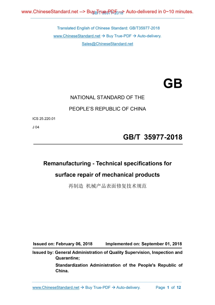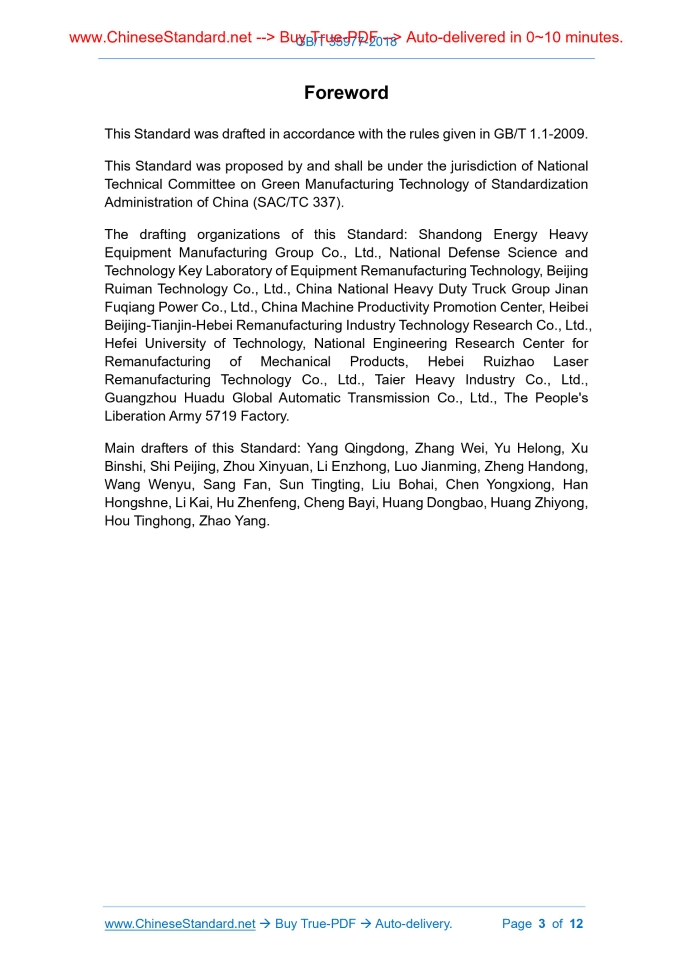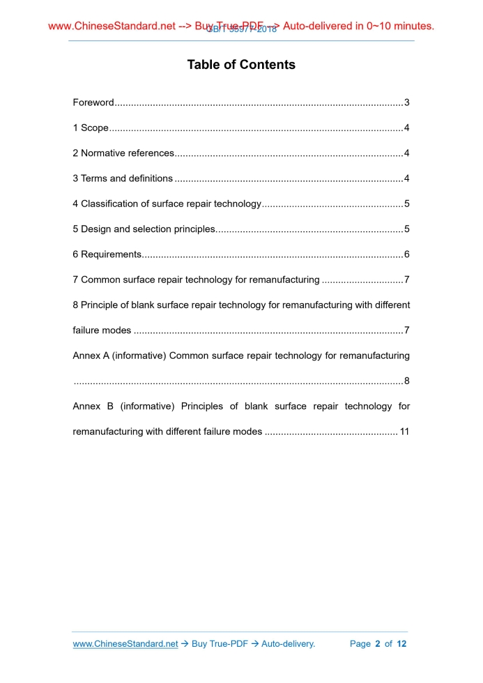 Similar standardsGB/T 35977-2018: Remanufacturing - Technical specifications for surface repair of mechanical products---This is an excerpt. Full copy of true-PDF in English version (including equations, symbols, images, flow-chart, tables, and figures etc.), auto-downloaded/delivered in 9 seconds, can be purchased online: https://www.ChineseStandard.net/PDF.aspx/GBT35977-2018 GB NATIONAL STANDARD OF THE PEOPLE’S REPUBLIC OF CHINA ICS 25.220.01 J 04 Remanufacturing - Technical specifications for surface repair of mechanical products Issued on: FEBRUARY 06, 2018 Implemented on: SEPTEMBER 01, 2018 Issued by. General Administration of Quality Supervision, Inspection and Quarantine; Standardization Administration of the People's Republic of China. Table of ContentsForeword ... 3 1 Scope ... 4 2 Normative references ... 4 3 Terms and definitions ... 4 4 Classification of surface repair technology ... 5 5 Design and selection principles ... 5 6 Requirements ... 6 7 Common surface repair technology for remanufacturing ... 7 8 Principle of blank surface repair technology for remanufacturing with different failure modes ... 7 Annex A (informative) Common surface repair technology for remanufacturing ... 8 Annex B (informative) Principles of blank surface repair technology for remanufacturing with different failure modes ... 11ForewordThis Standard was drafted in accordance with the rules given in GB/T 1.1-2009. This Standard was proposed by and shall be under the jurisdiction of National Technical Committee on Green Manufacturing Technology of Standardization Administration of China (SAC/TC 337). The drafting organizations of this Standard. Shandong Energy Heavy Equipment Manufacturing Group Co., Ltd., National Defense Science and Technology Key Laboratory of Equipment Remanufacturing Technology, Beijing Ruiman Technology Co., Ltd., China National Heavy Duty Truck Group Jinan Fuqiang Power Co., Ltd., China Machine Productivity Promotion Center, Heibei Beijing-Tianjin-Hebei Remanufacturing Industry Technology Research Co., Ltd., Hefei University of Technology, National Engineering Research Center for Remanufacturing of Mechanical Products, Hebei Ruizhao Laser Remanufacturing Technology Co., Ltd., Taier Heavy Industry Co., Ltd., Guangzhou Huadu Global Automatic Transmission Co., Ltd., The People's Liberation Army 5719 Factory. Main drafters of this Standard. Yang Qingdong, Zhang Wei, Yu Helong, Xu Binshi, Shi Peijing, Zhou Xinyuan, Li Enzhong, Luo Jianming, Zheng Handong, Wang Wenyu, Sang Fan, Sun Tingting, Liu Bohai, Chen Yongxiong, Han Hongshne, Li Kai, Hu Zhenfeng, Cheng Bayi, Huang Dongbao, Huang Zhiyong, Hou Tinghong, Zhao Yang. Remanufacturing - Technical specifications for surface repair of mechanical products1 ScopeThis Standard specifies classification, design and selection principles, requirements for surface repair technology for remanufacturing of mechanical product. This Standard is applicable to design and selection of materials, techniques and processes.2 Normative referencesThe following referenced documents are indispensable for the application of this document. For dated references, only the edition cited applies. For undated references, the latest edition of the referenced document (including any amendments) applies. GB/T 28619, Remanufacturing - Terminology GB/T 31208, The methods of quality evaluation for remanufacturing core GB/T 32809, Remanufacturing - Technological specifications of cleaning for mechanical products3 Terms and definitionsFor the purposes of this document, the terms and definitions defined in GB/T 28619 as well as the followings apply. 3.1 surface repair technology for remanufacturing of mechanical products a series of surface engineering techniques (including additive manufacturing techniques) involved in the surface repair of remanufactured blanks to restore the remanufactured mechanical products to the geometrical parameters and performance of the prototype new product 3.2 surface damage repair repair of damage on the order of micrometers to millimeters consumption and environmental pollution when selecting surface repair techniques. In the process design and material selection, it is necessary to create conditions for the remanufacturing, recycling or extending service life of mechanical products.6 Requirements6.1 General requirements 6.1.1 Environmentally-friendly processes, equipment, materials and methods shall be preferred for surface repair technology for remanufacturing of mechanical products. 6.1.2 The remanufactured mechanical products after repair shall not be lower than the dimensional accuracy, technical parameters, quality characteristics and safety performance requirements of the prototype new products. 6.2 Requirements before repair 6.2.1 Remanufacturing surface repair design and demonstration shall be carried out according to the service conditions, failure modes and functional requirements of mechanical products. Make comprehensive consideration of technical, environmental and economic feasibility. Determine repair solutions and processes. And develop a guide on repair work. Determine the type, composition, structure and related physical and chemical properties and mechanical properties of the surface repair layer. 6.2.2 The remanufactured blanks shall be cleaned, tested and correspondingly pretreated and surface protected according to the surface finish conditions of the surface repair technology. Cleaning shall comply with the provisions of GB/T 32809, testing shall meet the requirements of GB/T 31208. 6.3 Repair process requirements 6.3.1 Prioritize automated surface engineering for remanufacturing surface repair. And strictly in accordance with the process flow, the processing and preparation of the remanufactured blank surface repair layer shall be performed. 6.3.2 According to the repair technical requirements, take necessary cooling, gas protection and other protective measures to prevent oxidation, cracking and shedding of the su