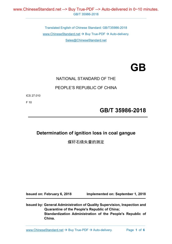 GB/T 35986-2018: Determination of ignition loss in coal gangue Delivery: 9 seconds. True-PDF full-copy in English & invoice will be downloaded + auto-delivered via email. See step-by-step procedure Status: Valid