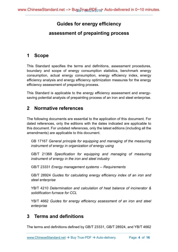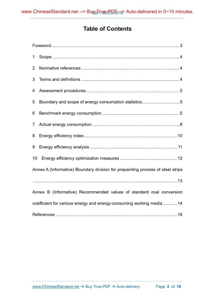 Similar standardsGB/T 36023-2018: Guides for energy efficiency assessment of prepainting process---This is an excerpt. Full copy of true-PDF in English version (including equations, symbols, images, flow-chart, tables, and figures etc.), auto-downloaded/delivered in 9 seconds, can be purchased online: https://www.ChineseStandard.net/PDF.aspx/GBT36023-2018GB NATIONAL STANDARD OF THE PEOPLE’S REPUBLIC OF CHINA ICS 77.010 H 04 Guides for energy efficiency assessment of prepainting process Issued on: MARCH 15, 2018 Implemented on: DECEMBER 1, 2018 Issued by. General Administration of Quality Supervision, Inspection and Quarantine of the People’s Republic of China; Standardization Administration of the People’s Republic of China. Table of ContentsForeword ... 3 1 Scope ... 4 2 Normative references ... 4 3 Terms and definitions ... 4 4 Assessment procedures ... 5 5 Boundary and scope of energy consumption statistics ... 5 6 Benchmark energy consumption ... 5 7 Actual energy consumption ... 8 8 Energy efficiency index ... 10 9 Energy efficiency analysis ... 11 10 Energy efficiency optimization measures ... 12 Annex A (Informative) Boundary division for prepainting process of steel strips ... 13 Annex B (Informative) Recommended values of standard coal conversion coefficient for various energy and energy-consuming working media ... 14 References ... 16 Guides for energy efficiency assessment of prepainting process1 ScopeThis Standard specifies the terms and definitions, assessment procedures, boundary and scope of energy consumption statistics, benchmark energy consumption, actual energy consumption, energy efficiency index, energy efficiency analysis and energy efficiency optimization measures for the energy efficiency assessment of prepainting process. This Standard is applicable to the energy efficiency assessment and energy- saving potential analysis of prepainting process of an iron and steel enterprise.2 Normative referencesThe following documents are essential to the application of this document. For dated references, only the editions with the dates indicated are applicable to this document. For undated references, only the latest editions (including all the amendments) are applicable to this document. GB 17167 General principle for equipping and managing of the measuring instrument of energy in organization of energy using GB/T 21368 Specification for equipping and managing of measuring instrument of energy in the iron and steel industry GB/T 23331 Energy management systems -- Requirements GB/T 28924 Guides for calculating energy efficiency index of an iron and steel enterprise YB/T 4210 Determination and calculation of heat balance of incinerator & solidification furnace for CCL YB/T 4662 Guides for energy efficiency assessment of an iron and steel enterprise3 Terms and definitionsThe terms and definitions defined by GB/T 23331, GB/T 28924, and YB/T 4662 consumption of gas, natural gas, electricity (the incinerator and the curing furnace are heated separately from the others), circulating water, compressed air, steam, etc.; d) energy recovery, such as steam recovery, recovered steam pressure, temperature, etc.; e) ambient temperature. 7.1.2 The field data acquisition shall be carried out in accordance with YB/T 4210. 7.2 Principle for standard coal conversion coefficient of energy and energy-consuming working media 7.2.1 The actual fuel energy consumed by the energy-using unit shall be converted into the amount of standard coal based on its net calorific value. For unmeasured ones, SEE Table B.1. 7.2.2 Steam shall be converted into the amount of standard coal based on its enthalpy value. SEE Table B.2. 7.2.3 The standard coal used for the conversion of energy-consuming working medium is shown in Table B.3. 7.2.4 The conversion relationship between standard coal and heat is 1 kgce = 29 307.6 kJ. 7.2.5 The equivalent value of the electric standard coal conversion coefficient shall be taken, that is, 1 kW·h = 0.122 9 kgce. 7.3 Actual energy consumption calculation The actual energy consumption is calculated according to the Formula (3). Where. ex - Actual energy consumption of the prepainting process during the statistical period, in kilograms of standard coal per ton (kgce/t); ein - Direct energy consumption of the prepainting process during the statistical period, in kilograms of standard coal (kgce); eout - Energy recovered by the prepainting process for external supply during the statistical period, in kilograms of standard coal (kgce); p - Conforming product quantity of the prepainting process during the statistical in accordance with GB/T 15316. 9.3 Analysis of energy efficiency level The analysis of energy efficiency level shall include but shall not be limited to the following. a) Energy efficiency analysis of prepainting process; b) The energy consumption analysis of incinerator and curing furnace for prepainting process can be in accordance with GB/T 29727; c) The energy efficiency analysis of important equipment can be in accordance with GB 18613, GB 30254, GB 19761, and GB 19762; d) The energy control analysis can be in accordance with GB/T 30258; e) The analysis on the rationality of electric energy utilization can be in accordance with GB/T 3485; f) The analysis on the rationality of thermal energy utilization can be in accordance with GB/T 3486; g) The energy-saving potential analysis and energy system optimization can be in accordance with GB/T 30715.10 Energy efficiency optimization measuresThe prepainting process can use but is not limited to the following energy efficiency optimization measures. a) IMPROVE the energy control level; b) Energy recovery technology of coating waste gas incineration; c) Energy-saving and environment-friendly combustion technology of the incinerator; d) Energy-saving insulation material technology of the incinerator and curing furnace; e) Efficient waste heat recovery technology; f) Precise temperature control technology of the steel s