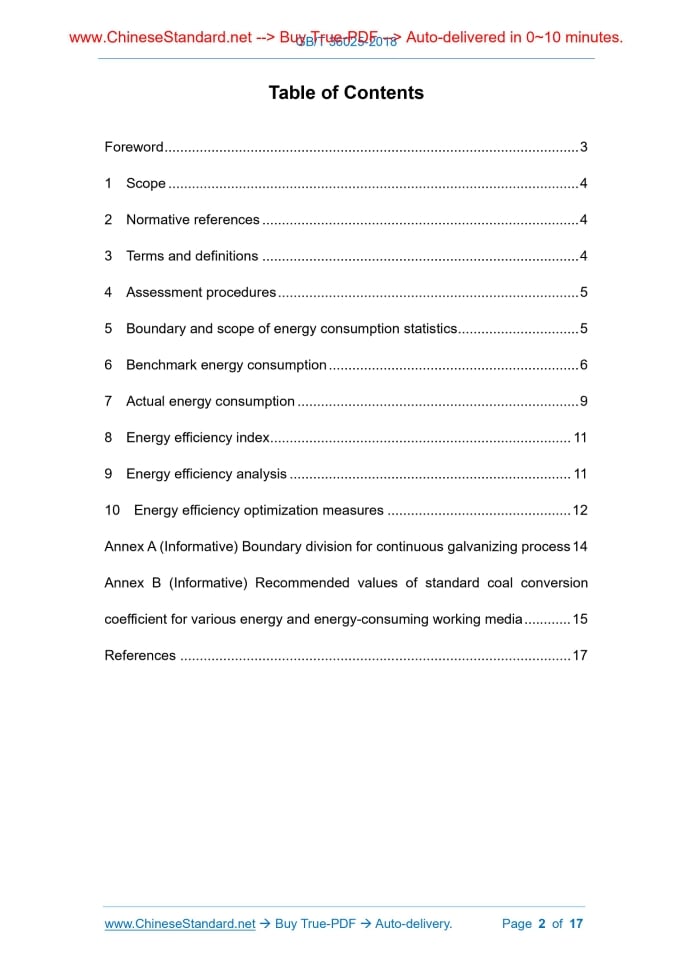 Similar standardsGB/T 36025-2018: Guides for energy efficiency assessment of continuous galvanizing process---This is an excerpt. Full copy of true-PDF in English version (including equations, symbols, images, flow-chart, tables, and figures etc.), auto-downloaded/delivered in 9 seconds, can be purchased online: https://www.ChineseStandard.net/PDF.aspx/GBT36025-2018GB NATIONAL STANDARD OF THE PEOPLE’S REPUBLIC OF CHINA ICS 77.010 H 04 Guides for energy efficiency assessment of continuous galvanizing process Issued on: MARCH 15, 2018 Implemented on: DECEMBER 1, 2018 Issued by. General Administration of Quality Supervision, Inspection and Quarantine of the People’s Republic of China; Standardization Administration of the People’s Republic of China. Table of ContentsForeword ... 3 1 Scope ... 4 2 Normative references ... 4 3 Terms and definitions ... 4 4 Assessment procedures ... 5 5 Boundary and scope of energy consumption statistics ... 5 6 Benchmark energy consumption ... 6 7 Actual energy consumption ... 9 8 Energy efficiency index ... 11 9 Energy efficiency analysis ... 11 10 Energy efficiency optimization measures ... 12 Annex A (Informative) Boundary division for continuous galvanizing process 14 Annex B (Informative) Recommended values of standard coal conversion coefficient for various energy and energy-consuming working media ... 15 References ... 17 Guides for energy efficiency assessment of continuous galvanizing process1 ScopeThis Standard specifies the terms and definitions, assessment procedures, boundary and scope of energy consumption statistics, benchmark energy consumption, actual energy consumption, energy efficiency index, energy efficiency analysis and energy efficiency optimization measures for the energy efficiency assessment of continuous galvanizing process. This Standard is applicable to the energy efficiency assessment and energy- saving potential analysis of continuous galvanizing process of an iron and steel enterprise.2 Normative referencesThe following documents are essential to the application of this document. For dated references, only the editions with the dates indicated are applicable to this document. For undated references, only the latest editions (including all the amendments) are applicable to this document. GB 17167 General principle for equipping and managing of the measuring instrument of energy in organization of energy using GB/T 21368 Specification for equipping and managing of measuring instrument of energy in the iron and steel industry GB/T 23331 Energy management systems -- Requirements GB/T 28924 Guides for calculating energy efficiency index of an iron and steel enterprise YB/T 4211 Determination and calculation of heat balance of furnace for CGL YB/T 4662 Guides for energy efficiency assessment of an iron and steel enterprise3 Terms and definitionsThe terms and definitions defined by GB/T 23331, GB/T 28924, and YB/T 46627 Actual energy consumption7.1 Data acquisition 7.1.1 The field data acquisition includes but is not limited to the following. The process parameters shall be taken under stable production conditions. The variation shall be averaged over the statistical period. a) production information, including the production scale, quantity of conforming products during the statistical period, etc.; b) raw material conditions, including the types of raw material plates, etc.; c) product conditions, including the specifications, steel type, plating type, post-processing type, etc.; d) consumption of energy and energy-consuming working media, such as consumption of gas, natural gas, electricity (the annealing furnace is heated separately from the others), circulating water, compressed air, nitrogen, hydrogen, steam, liquid ammonia, etc.; e) energy recovery, such as steam recovery, recovered steam pressure, temperature, etc.; f) ambient temperature. 7.1.2 The field data acquisition shall be carried out in accordance with YB/T 4211. 7.2 Principle for standard coal conversion coefficient of energy and energy-consuming working media 7.2.1 The actual fuel energy consumed by the energy-using unit shall be converted into the amount of standard coal based on its net calorific value. For unmeasured ones, SEE Table B.1. 7.2.2 Steam shall be converted into the amount of standard coal based on its enthalpy value. SEE Table B.2. 7.2.3 The standard coal used for the conversion of energy-consuming working media is shown in Table B.3. 7.2.4 The conversion relationship between standard coal and heat is 1 kgce = 29 307.6 kJ. 7.2.5 The equivalent value of the electric standard coal conversion coefficient shall be taken, that is, 1 kW·h = 0.122 9 kgce. 7.3 Actual energy consumption calculation The actual energy consumption is calculated according to the Formula (3). a) whether it complies with relevant national laws, regulations, policies, and mandatory standards; b) whether there is any backward technology or equipment that is forbidden or obsolete; c) the use of new energy-saving processes, new technologies, and new products recommended by the state and industry. 9.2 Outfit and monitoring analysis of energy measuring equipment The outfit and monitoring analysis of energy measuring equipment shall include but shall not be limited to the following. a) According to the requirements of GB 17167 and GB/T 21368, ANALYZE whether the outfit scheme of the energy measuring equipment for continuous galvanizing process is scientific and reasonable; b) The state of energy utilization in the continuous galvanizing process can be monitored in accordance with GB/T 15316. 9.3 Analysis of energy efficiency level The analysis of energy efficiency level shall include but shall not be limited to the following. a) Energy efficiency analysis of continuous galvanizing process; b) The energy efficiency analysis of the heating furnace for continuous galvanizing process can be in accordance with GB/T 29728; c) The energy efficiency analysis of important equipment can be i