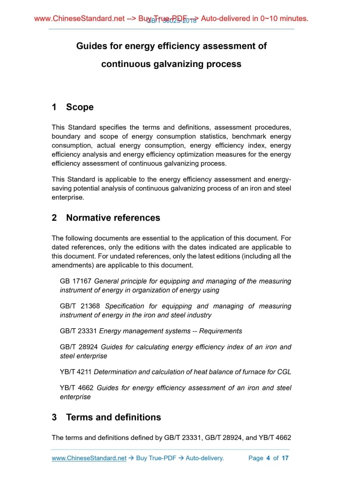 Similar standardsGB/T 36025-2018: Guides for energy efficiency assessment of continuous galvanizing process---This is an excerpt. Full copy of true-PDF in English version (including equations, symbols, images, flow-chart, tables, and figures etc.), auto-downloaded/delivered in 9 seconds, can be purchased online: https://www.ChineseStandard.net/PDF.aspx/GBT36025-2018GB NATIONAL STANDARD OF THE PEOPLE’S REPUBLIC OF CHINA ICS 77.010 H 04 Guides for energy efficiency assessment of continuous galvanizing process Issued on: MARCH 15, 2018 Implemented on: DECEMBER 1, 2018 Issued by. General Administration of Quality Supervision, Inspection and Quarantine of the People’s Republic of China; Standardization Administration of the People’s Republic of China. Table of ContentsForeword ... 3 1 Scope ... 4 2 Normative references ... 4 3 Terms and definitions ... 4 4 Assessment procedures ... 5 5 Boundary and scope of energy consumption statistics ... 5 6 Benchmark energy consumption ... 6 7 Actual energy consumption ... 9 8 Energy efficiency index ... 11 9 Energy efficiency analysis ... 11 10 Energy efficiency optimization measures ... 12 Annex A (Informative) Boundary division for continuous galvanizing process 14 Annex B (Informative) Recommended values of standard coal conversion coefficient for various energy and energy-consuming working media ... 15 References ... 17 Guides for energy efficiency assessment of continuous galvanizing process1 ScopeThis Standard specifies the terms and definitions, assessment procedures, boundary and scope of energy consumption statistics, benchmark energy consumption, actual energy consumption, energy efficiency index, energy efficiency analysis and energy efficiency optimization measures for the energy efficiency assessment of continuous galvanizing process. This Standard is applicable to the energy efficiency assessment and energy- saving potential analysis of continuous galvanizing process of an iron and steel enterprise.2 Normative referencesThe following documents are essential to the application of this document. For dated references, only the editions with the dates indicated are applicable to this document. For undated references, only the latest editions (including all the amendments) are applicable to this document. GB 17167 General principle for equipping and managing of the measuring instrument of energy in organization of energy using GB/T 21368 Specification for equipping and managing of measuring instrument of energy in the iron and steel industry GB/T 23331 Energy management systems -- Requirements GB/T 28924 Guides for calculating energy efficiency index of an iron and steel enterprise YB/T 4211 Determination and calculation of heat balance of furnace for CGL YB/T 4662 Guides for energy efficiency assessment of an iron and steel enterprise3 Terms and definitionsThe terms and definitions defined by GB/T 23331, GB/T 28924, and YB/T 46627 Actual energy consumption7.1 Data acquisition 7.1.1 The field data acquisition includes but is not limited to the following. The process parameters shall be taken under stable production conditions. The variation shall be averaged over the statistical period. a) production information, including the production scale, quantity of conforming products during the statistical period, etc.; b) raw material conditions, including the types of raw material plates, etc.; c) product conditions, including the specifications, steel type, plating type, post-processing type, etc.; d) consumption of energy and energy-consuming working media, such as consumption of gas, natural gas, electricity (the annealing furnace is heated separately from the others), circulating water, compressed air, nitrogen, hydrogen, steam, liquid ammonia, etc.; e) energy recovery, such as steam recovery, recovered steam pressure, temperature, etc.; f) ambient temperature. 7.1.2 The field data acquisition shall be carried out in accordance with YB/T 4211. 7.2 Principle for standard coal conversion coefficient of energy and energy-consuming working media 7.2.1 The actual fuel energy consumed by the energy-using unit shall be converted into the amount of standard coal based on its net calorific value. For unmeasured ones, SEE Table B.1. 7.2.2 Steam shall be converted into the amount of standard coal based on its enthalpy value. SEE Table B.2. 7.2.3 The standard coal used for the conversion of energy-consuming working media is shown in Table B.3. 7.2.4 The conversion relationship between standard coal and heat is 1 kgce = 29 307.6 kJ. 7.2.5 The equivalent value of the electric standard coal conversion coefficient shall be taken, that is, 1 kW·h = 0.122 9 kgce. 7.3 Actual energy consumption calculation The actual energy consumption is calculated according to the Formula (3). a) whether it complies with relevant national laws, regulations, policies, and mandatory standards; b) whether there is any backward technology or equipment that is forbidden or obsolete; c) the use of new energy-saving processes, new technologies, and new products recommended by the state and industry. 9.2 Outfit and monitoring analysis of energy measuring equipment The outfit and monitoring analysis of energy measuring equipment shall include but shall not be limited to the following. a) According to the requirements of GB 17167 and GB/T 21368, ANALYZE whether the outfit scheme of the energy measuring equipment for continuous galvanizing process is scientific and reasonable; b) The state of energy utilization in the continuous galvanizing process can be monitored in accordance with GB/T 15316. 9.3 Analysis of energy efficiency level The analysis of energy efficiency level shall include but shall not be limited to the following. a) Energy efficiency analysis of continuous galvanizing process; b) The energy efficiency analysis of the heating furnace for continuous galvanizing process can be in accordance with GB/T 29728; c) The energy efficiency analysis of important equipment can be i