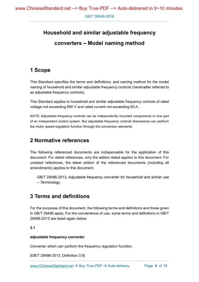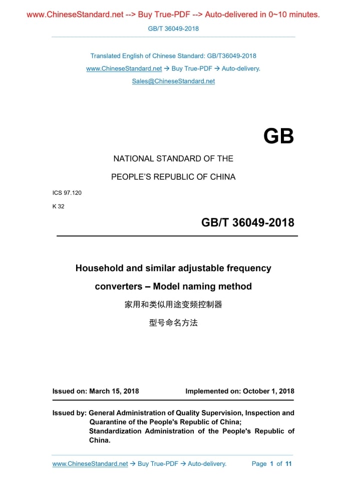 GB/T 36049-2018: Household and similar adjustable frequency converters - Model naming method Delivery: 9 seconds. True-PDF full-copy in English & invoice will be downloaded + auto-delivered via email. See step-by-step procedure Status: Valid