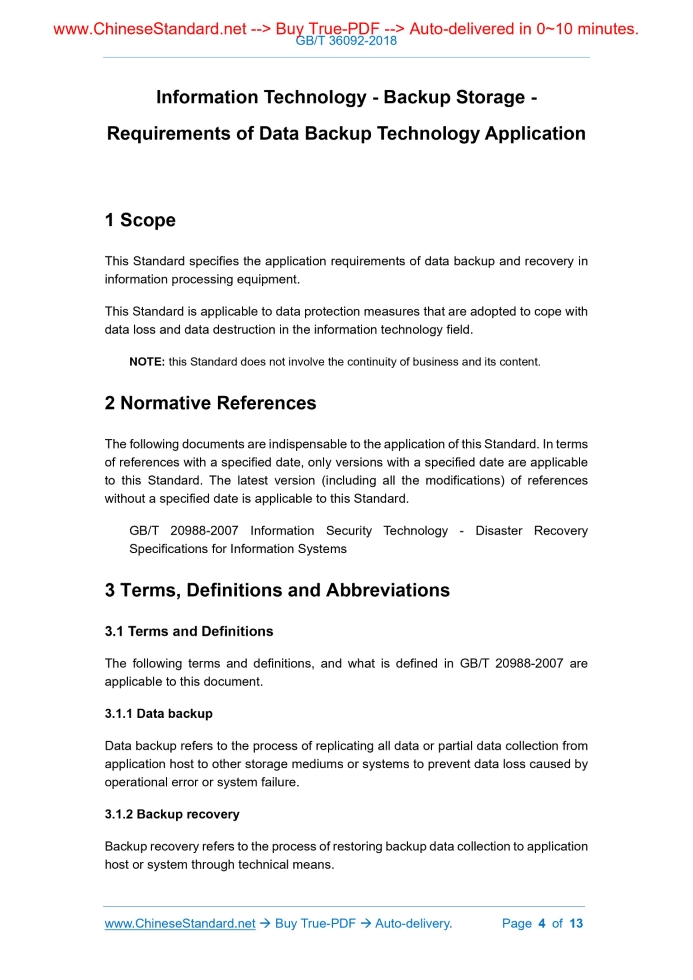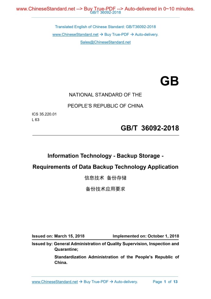 Similar standardsGB/T 36092-2018: Information Technology - Backup Storage - Requirements of Data Backup Technology Application---This is an excerpt. Full copy of true-PDF in English version (including equations, symbols, images, flow-chart, tables, and figures etc.), auto-downloaded/delivered in 9 seconds, can be purchased online: https://www.ChineseStandard.net/PDF.aspx/GBT36092-2018 GB NATIONAL STANDARD OF THE PEOPLE’S REPUBLIC OF CHINA ICS 35.220.01 L 63 Information Technology - Backup Storage - Requirements of Data Backup Technology Application Issued on: MARCH 15, 2018 Implemented on: OCTOBER 1, 2018 Issued by. General Administration of Quality Supervision, Inspection and Quarantine; Standardization Administration of the People’s Republic of China. Table of ContentsForeword ... 3 1 Scope ... 4 2 Normative References ... 4 3 Terms, Definitions and Abbreviations ... 4 4 Backup Technology ... 6 5 Data Backup Application Requirements ... 8 Appendix A (Informative) Data Backup Deployment ... 12 Information Technology - Backup Storage - Requirements of Data Backup Technology Application1 ScopeThis Standard specifies the application requirements of data backup and recovery in information processing equipment. This Standard is applicable to data protection measures that are adopted to cope with data loss and data destruction in the information technology field. NOTE. this Standard does not involve the continuity of business and its content.2 Normative ReferencesThe following documents are indispensable to the application of this Standard. In terms of references with a specified date, only versions with a specified date are applicable to this Standard. The latest version (including all the modifications) of references without a specified date is applicable to this Standard. GB/T 20988-2007 Information Security Technology - Disaster Recovery Specifications for Information Systems3 Terms, Definitions and Abbreviations3.1 Terms and Definitions The following terms and definitions, and what is defined in GB/T 20988-2007 are applicable to this document. 3.1.1 Data backup Data backup refers to the process of replicating all data or partial data collection from application host to other storage mediums or systems to prevent data loss caused by operational error or system failure. 3.1.2 Backup recovery Backup recovery refers to the process of restoring backup data collection to application host or system through technical means. However, through the application of virtualization technology and the form of software analog of tape reading and writing, the management of virtual tape library is consistent with the management of a physical-tape library. 3.1.11 CD-ROM tower/jukebox CD-ROM tower/jukebox refers to an equipment, which links up multiple CD-ROMs. The disk is previously placed in a CD-ROM driver. Thus, data reading and writing can be simultaneously implemented on multiple disks. CD-ROM tower is a disk network sharing equipment, which is constituted of the series of CD-ROM driver of multiple SCSI interfaces. CD-ROM jukebox is a disk network sharing equipment, which is equipped with automatic disk-changing mechanism (mechanical arms). 3.1.12 Backup window Backup window refers to the time interval that enables backup of business data in the business system, or the time frame for data backup under the circumstance that users’ normal usage of the business system shall not be affected. 3.1.13 Synthetic backup Synthetic backup refers to the re-constitution of a full backup with a full backup and some incremental backup or differential backup. 3.1.14 Virtual recovery After recovery is activated, on the production system end, instant access to the recovered time point data can be implemented (in the mode of point redirection). Actual data can be re-continuously transmitted backstage. 3.2 Abbreviations The following abbreviations are applicable to this document. FCP. Fabre Channel Protocol IP. Internet Protocol NDMP. Network Data Management Protocol SCSI. Small Computer System Interface4 Backup Technology4.1 Overview Backup is a protection measure, which prevents data collection from natural disasters or human errors. It replicates the object of backup to another independent storage a) Data backup shall support backup to locality, local system, nonlocal system and non-locality. It shall maintain backup of one or more data copies. When there are multiple backup data copies, data consistency of multiple backup data copies shall be maintained; b) When the backup process is completed, under the circumstance of production system failure, power failure and breakdown, backup data copies shall be accessed under the support of software or system; c) Other than the initialization phase, in the backup process and after backup is completed, data copies that are stored on the backup object end shall be data of the backup object at a certain historical moment; d) Software or system can manage the backup process in accordance with log or other technology. When the backup process is accidentally interrupted, data re- synchronization shall be implemented; e) The synchronization mode of the backup data copy and backup object shall support real-time synchronization or asynchronous synchronization; f) In the application of system which parallelly executes multiple backup tasks, if the writing of multiple backup objects is correlated, the consistency of writing sequence of the backup data copies with the backup object shall be guaranteed in the backup process; g) The backup and recovery of software or system’s own backup data log database shall be supported. 5.4 Recoverability of Backup Data Copy Recoverability of backup data shall satisfy the following requirements. a) Backup data copy shall enable local or nonlocal recovery; recovered data shall be consistent with backup object; b) After the backup process is completed, backup destination end shall include an independent data, which reflects full data of the product