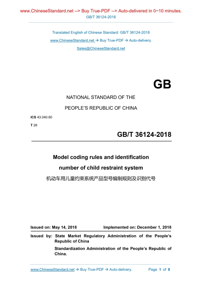 GB/T 36124-2018: Model coding rules and identification number of child restraint system Delivery: 9 seconds. True-PDF full-copy in English & invoice will be downloaded + auto-delivered via email. See step-by-step procedure Status: Valid