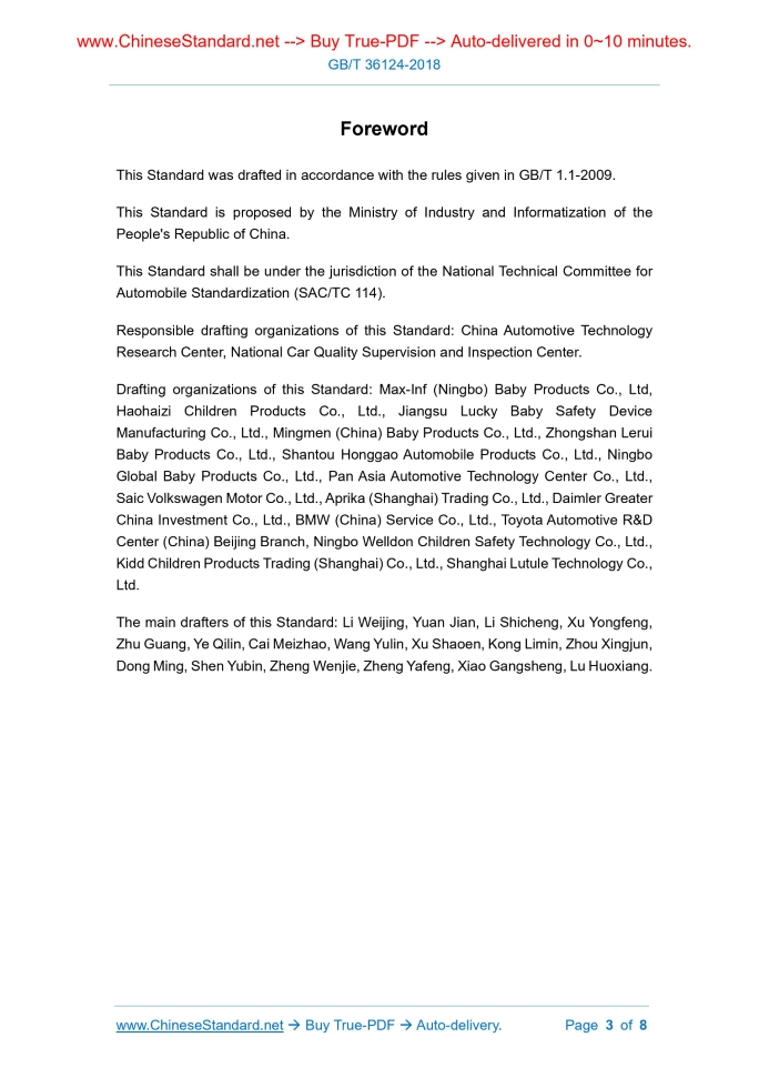 Similar standardsGB/T 36124-2018: Model coding rules and identification number of child restraint system---This is an excerpt. Full copy of true-PDF in English version (including equations, symbols, images, flow-chart, tables, and figures etc.), auto-downloaded/delivered in 9 seconds, can be purchased online: https://www.ChineseStandard.net/PDF.aspx/GBT36124-2018GB NATIONAL STANDARD OF THE PEOPLE’S REPUBLIC OF CHINA ICS 43.040.60 T 26 Model coding rules and identification number of child restraint system Issued on: MAY 14, 2018 Implemented on: DECEMBER 1, 2018 Issued by. State Market Regulatory Administration of the People’s Republic of China Standardization Administration of the People’s Republic of China. Table of ContentsForeword ... 3 1 Scope ... 4 2 Normative references ... 4 3 Terms and definitions ... 4 4 Production model and composition method ... 5 5 Product identification code ... 6ForewordThis Standard was drafted in accordance with the rules given in GB/T 1.1-2009. This Standard is proposed by the Ministry of Industry and Informatization of the People's Republic of China. This Standard shall be under the jurisdiction of the National Technical Committee for Automobile Standardization (SAC/TC 114). Responsible drafting organizations of this Standard. China Automotive Technology Research Center, National Car Quality Supervision and Inspection Center. Drafting organizations of this Standard. Max-Inf (Ningbo) Baby Products Co., Ltd, Haohaizi Children Products Co., Ltd., Jiangsu Lucky Baby Safety Device Manufacturing Co., Ltd., Mingmen (China) Baby Products Co., Ltd., Zhongshan Lerui Baby Products Co., Ltd., Shantou Honggao Automobile Products Co., Ltd., Ningbo Global Baby Products Co., Ltd., Pan Asia Automotive Technology Center Co., Ltd., Saic Volkswagen Motor Co., Ltd., Aprika (Shanghai) Trading Co., Ltd., Daimler Greater China Investment Co., Ltd., BMW (China) Service Co., Ltd., Toyota Automotive R&D Center (China) Beijing Branch, Ningbo Welldon Children Safety Technology Co., Ltd., Kidd Children Products Trading (Shanghai) Co., Ltd., Shanghai Lutule Technology Co., Ltd. The main drafters of this Standard. Li Weijing, Yuan Jian, Li Shicheng, Xu Yongfeng, Zhu Guang, Ye Qilin, Cai Meizhao, Wang Yulin, Xu Shaoen, Kong Limin, Zhou Xingjun, Dong Ming, Shen Yubin, Zheng Wenjie, Zheng Yafeng, Xiao Gangsheng, Lu Huoxiang. Model coding rules and identification number of child restraint system1 ScopeThis Standard specifies the basic composition and expression of the production model of the child restraint system of power-driven vehicles, the basic composition of the product identification code of the child restraint system, the location of the content mark, and the marking requirements. This Standard is applicable to child restraint system products of motor vehicles sold in China. This Standard does not apply to the identification and coding of components of child restraint system.2 Normative referencesThe following referenced documents are indispensable for the application of this document. For dated references, only the edition cited applies. For undated references, the latest edition of the referenced document (including any amendments) applies. GB 27887 Restraining devices for child occupants of power-driven vehicles GB/T 36120-2018 Production label for child restraint system of power-driven vehicles3 Terms and definitionsThe terms and definitions specified in GB 27887 and below shall apply to this document. 3.1 Production model A set of codes specified to identify a child restraint system, which may consist of letters and numbers. 3.2 Identification number A set of codes, composed of letters and numbers, assigned for the product by the child restraint system brand owner, in order to identify the basic features of the child restraint system. 3.3 Fixing method The installation and fastening method of child restraint system on vehicles, such as seat belt, ISOFIX, etc. 3.4 Category Classification of the child constraint system according to the location fixed on the vehicle, such as universal, restrained, semi-universal, and special vehicle. 3.5 Class Classification of child restraint system according to the ways children are constrained, such as integral or non-integral. 3.6 Group The five quality groups of the child restraint system. group 0, group 0+, group Ⅰ, group Ⅱ and group Ⅲ. Note 1. group 0 is used for children weight less than 10kg. Note 2. group 0+ is used for children weight less than 13kg. Note 3. group Ⅰ is used for children weight 9kg ~ 18kg. Note 4. group Ⅱ is used for children weight 15kg ~ 25kg. Note 5. group Ⅲ is used for children weight 22kg ~ 36kg.4 Production model and composition method4.1 Basic composition 4.1.1 The child restraint system production model mainly consists of the company code, product design code and modification code. If necessary, company specified content code can be added. 4.1.2 Company code, product design code, modification code and company specified content code shall be determined by the child restraint system brand owner. 4.1.3 The company code shall be unique to each brand of child restraint system and ......Source: Above contents are excerpted from the full-copy PDF -- translated/reviewed by: www.ChineseStandard.net / Wayne Zheng et al. Tips & Frequently Asked Questions:Question 1: How long will the true-PDF of English version of GB/T 36124-2018 be delivered?Answer: The full copy PDF of English version of GB/T 36124-2018 can be downloaded in 9 seconds, and it will also be emailed to you in 9 seconds (double mechanisms to ensure the delivery reliably), with PDF-invoice.Question 2: Can I share the purchased PDF of GB/T 36124-2018_English with my colleagues?Answer: Yes. The purchased PDF of GB/T 36124-2018_English will be deemed to be sold to your employer/organization who actually paid for it, including your colleagues and your employer's intranet.Question 3: Does the price include tax/VAT?Answer: Yes. Our tax invoice, dow