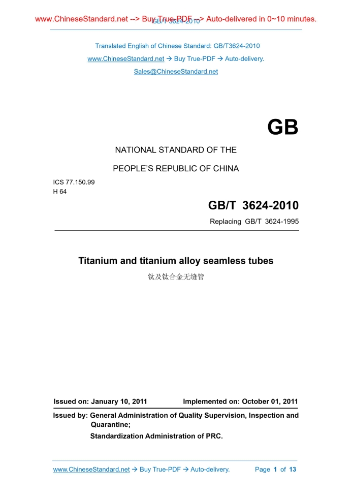 GB/T 3624-2010: Titanium and titanium alloy seamless tubes Delivery: 9 seconds. True-PDF full-copy in English & invoice will be downloaded + auto-delivered via email. See step-by-step procedure Status: Obsolete GB/T 3624: Historical versions