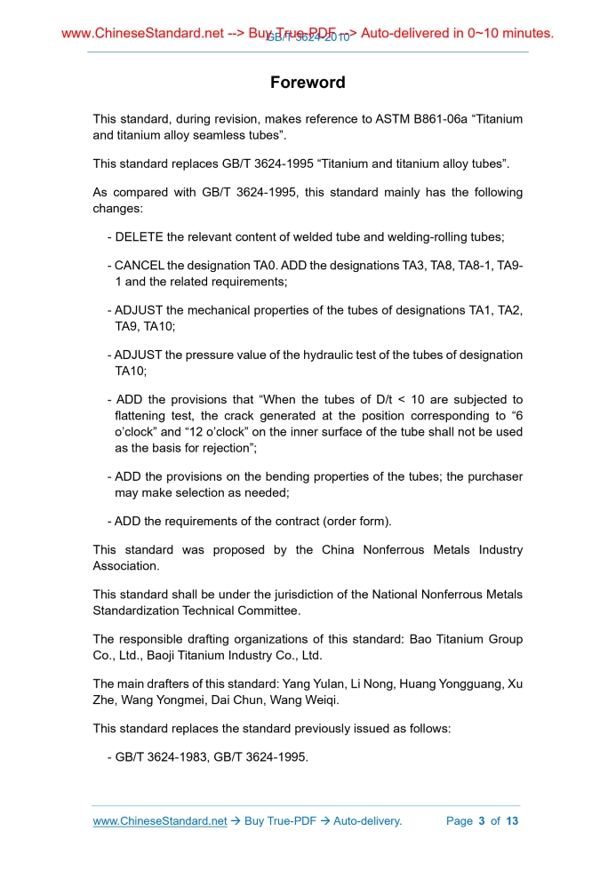 Similar standardsGB/T 3624-2010: Titanium and titanium alloy seamless tubes---This is an excerpt. Full copy of true-PDF in English version (including equations, symbols, images, flow-chart, tables, and figures etc.), auto-downloaded/delivered in 9 seconds, can be purchased online: https://www.ChineseStandard.net/PDF.aspx/GBT3624-2010GB NATIONAL STANDARD OF THE PEOPLE’S REPUBLIC OF CHINA ICS 77.150.99 H 64 Replacing GB/T 3624-1995 Titanium and titanium alloy seamless tubes Issued on: JANUARY 10, 2011 Implemented on: OCTOBER 01, 2011 Issued by. General Administration of Quality Supervision, Inspection and Quarantine; Standardization Administration of PRC. Table of ContentsForeword... 3 1 Scope... 4 2 Normative references... 4 3 Requirements... 4 4 Test methods... 9 5 Inspection rules... 10 6 Marking, packaging, transport and storage... 12 7 Contents of contract (or order form)... 13ForewordThis standard, during revision, makes reference to ASTM B861-06a “Titanium and titanium alloy seamless tubes”. This standard replaces GB/T 3624-1995 “Titanium and titanium alloy tubes”. As compared with GB/T 3624-1995, this standard mainly has the following changes. - DELETE the relevant content of welded tube and welding-rolling tubes; - CANCEL the designation TA0.ADD the designations TA3, TA8, TA8-1, TA9- 1 and the related requirements; - ADJUST the mechanical properties of the tubes of designations TA1, TA2, TA9, TA10; - ADJUST the pressure value of the hydraulic test of the tubes of designation TA10; - ADD the provisions that “When the tubes of D/t < 10 are subjected to flattening test, the crack generated at the position corresponding to “6 o’clock” and “12 o’clock” on the inner surface of the tube shall not be used as the basis for rejection”; - ADD the provisions on the bending properties of the tubes; the purchaser may make selection as needed; - ADD the requirements of the contract (order form). This standard was proposed by the China Nonferrous Metals Industry Association. This standard shall be under the jurisdiction of the National Nonferrous Metals Standardization Technical Committee. The responsible drafting organizations of this standard. Bao Titanium Group Co., Ltd., Baoji Titanium Industry Co., Ltd. The main drafters of this standard. Yang Yulan, Li Nong, Huang Yongguang, Xu Zhe, Wang Yongmei, Dai Chun, Wang Weiqi. This standard replaces the standard previously issued as follows. - GB/T 3624-1983, GB/T 3624-1995. Titanium and titanium alloy seamless tubes1 ScopeThis standard specifies the requirements, test methods, inspection rules and markings, packaging, transport, storage, quality certificate and contract (or order form) contents of titanium and titanium alloy seamless tubes. This standard is applicable to titanium and titanium alloy seamless tubes which are produced by cold rolling (cold drawing) method. It is suitable for general industrial use.2 Normative referencesThe following documents are essential to the application of this document. For the dated documents, only the versions with the dates indicated are applicable to this document; for the undated documents, only the latest version (including all the amendments) are applicable to this standard. GB/T 228 Metallic materials - Tensile testing at ambient temperature GB/T 241 Metal materials - Tube - Hydrostatic pressure test GB/T 244 Metallic materials - Tube - Bend test GB/T 246 Metal materials - Tube - Flattening test GB/T 3620.1 Designation and composition of titanium and titanium alloys GB/T 3620.2 Titanium and titanium alloys - Permissible variations of chemical composition for wrought product analysis GB/T 4698 (all parts) Sponge titanium, titanium and titanium alloys - Determination of aluminum content GB/T 8180 Wrought titanium and titanium alloy products packing marking transporting and storing3 Requirements3.1 Classification of products 3.1.1 Designation, status and specification of products t - Nominal wall thickness of the tube, in millimeters (mm); D - Nominal outer diameter of the tube, in millimeters (mm); e - Constant, when the tube’s diameter is less than or equal to 25.4 mm, e takes 0.04; when the tube’s diameter is greater than 25.4 mm, e takes 0.06. 3.4.1.2 When the tubes of D/t < 10 are subjected to flattening test, the crack generated at the position corresponding to “6 o’clock” and “12 o’clock” on the inner surface of the tube shall not be used as the basis for rejection. 3.4.2 Hydraulic (pneumatic) pressure test 3.4.2.1 When the purchaser requests and indicates in the contract (or the order form), the tube shall be subjected to the hydraulic pressure or pneumatic pressure test. The test method selected by the purchaser shall be indicated in the contract (or order form). Where it is not indicated in the contract (or the order form), the supplier may not conduct the test, but must ensure that it meets the requirements for the minimum hydraulic pressure in 3.4.2.2 or the pneumatic pressure test in 3.4.2.3. 3.4.2.2 When the hydraulic test is carried out, the test pressure selected by the purchaser shall be indicated in the contract (or order form). When not specified in the contract (or order form), the test pressure is calculated according to the following formula (2). Where. p - Test pressure, in Megapascal (MPa); S - Allowable stress, which takes 50% of the minimum specified non- proportional extension strength, in Megapascal (MPa); D - Nominal outer diameter of the tube, in millimeters (mm); t - Nominal wall thickness of the tube, in millimeters (mm). When the nominal outer diameter of the tube is not more than 76 mm, the maximum pressure of the hydraulic test is not more than 17.2 MPa; when the nominal outer diameter of the tube is greater than 76 mm, the maximum pressure of the hydraulic test is not more than 19.3 MPa. The pressure shall be maintained for 5 s during the test, the tube shall be free from distortion or leakage. 3.4.2.3 During the pneumatic pressur