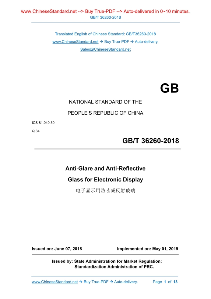 GB/T 36260-2018: Anti-Glare and Anti-Reflective Glass for Electronic Display Delivery: 9 seconds. True-PDF full-copy in English & invoice will be downloaded + auto-delivered via email. See step-by-step procedure Status: Valid