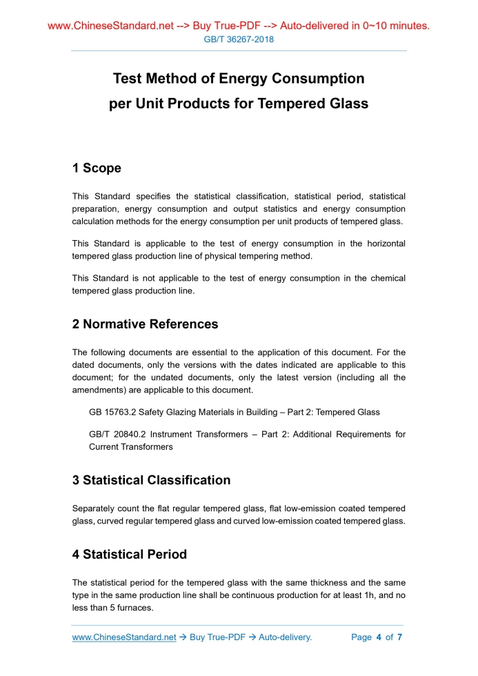 Similar standardsGB/T 36267-2018: Test method of energy consumption per unit products for tempered glass---This is an excerpt. Full copy of true-PDF in English version (including equations, symbols, images, flow-chart, tables, and figures etc.), auto-downloaded/delivered in 9 seconds, can be purchased online: https://www.ChineseStandard.net/PDF.aspx/GBT36267-2018GB NATIONAL STANDARD OF THE PEOPLE’S REPUBLIC OF CHINA ICS 81.040.20 Q 33 Test Method of Energy Consumption per Unit Products for Tempered Glass Issued on: JUNE 07, 2018 Implemented on: MAY 01, 2019 Issued by. State Administration for Market Regulation; Standardization Administration of PRC. Table of ContentsForeword ... 3 1 Scope ... 4 2 Normative References ... 4 3 Statistical Classification ... 4 4 Statistical Period ... 4 5 Statistical Preparation ... 5 6 Energy Consumption and Production Statistics ... 5 7 Calculation Method of Energy Consumption ... 6 Test Method of Energy Consumption per Unit Products for Tempered Glass1 ScopeThis Standard specifies the statistical classification, statistical period, statistical preparation, energy consumption and output statistics and energy consumption calculation methods for the energy consumption per unit products of tempered glass. This Standard is applicable to the test of energy consumption in the horizontal tempered glass production line of physical tempering method. This Standard is not applicable to the test of energy consumption in the chemical tempered glass production line.2 Normative ReferencesThe following documents are essential to the application of this document. For the dated documents, only the versions with the dates indicated are applicable to this document; for the undated documents, only the latest version (including all the amendments) are applicable to this document. GB 15763.2 Safety Glazing Materials in Building – Part 2. Tempered Glass GB/T 20840.2 Instrument Transformers – Part 2. Additional Requirements for Current Transformers3 Statistical ClassificationSeparately count the flat regular tempered glass, flat low-emission coated tempered glass, curved regular tempered glass and curved low-emission coated tempered glass.4 Statistical PeriodThe statistical period for the tempered glass with the same thickness and the same type in the same production line shall be continuous production for at least 1h, and no less than 5 furnaces.5 Statistical Preparation5.1 Statistical preparation of energy consumption Check the power supply design drawings of the tempered glass manufacturer or the cable line for the heating and cooling processes of the tempered glass production line determined and coordinated between the person in charge of the enterprise and the electrician; record the rated current passing through each cable line. 5.2 Energy consumption statistical device The energy consumption statistical device consists of digital electronic measuring instrument, current transformer and record statistics system. Digital electronic measuring instrument. the accuracy level is above 0.2. Current transformer. it adopts the split-core current transformer with accuracy level above 0.5; two current transformers are equipped with ranges of 1000A and 2500A; their performances meet the requirements of GB/T 20840.2. Record statistical system. record the real-time current and real-time voltage every 2s; calculate the total energy consumption during the statistical period.6 Energy Consumption and Production Statistics6.1 Energy consumption statistics range In the case of normal production of the enterprise, count the energy consumption in the tempered glass production line excluding glass cutting, edging, cleaning, and the like processes, as well as the energy consumption of other auxiliary equipment. When an enterprise has multiple tempered glass production lines, they shall be counted separately. 6.2 Energy consumption statistics According to the rated current passing through the ith cable line, select the current transformer with suitable range; correctly connect with the energy consumption statistics device; record the energy consumption W1 displayed on the device before the statistical period; record the energy consumption W2 displayed on the device after the completion of the statistical period. The energy consumption Ei of the ith cable line during the statistical period shall be calculated as per Formula (1). ......Source: Above contents are excerpted from the full-copy PDF -- translated/reviewed by: www.ChineseStandard.net / Wayne Zheng et al. Tips & Frequently Asked Questions:Question 1: How long will the true-PDF of English version of GB/T 36267-2018 be delivered?Answer: The full copy PDF of English version of GB/T 36267-2018 can be downloaded in 9 seconds, and it will also be emailed to you in 9 seconds (double mechanisms to ensure the delivery reliably), with PDF-invoice.Question 2: Can I share the purchased PDF of GB/T 36267-2018_English with my colleagues?Answer: Yes. The purchased PDF of GB/T 36267-2018_English will be deemed to be sold to your employer/organization who actually paid for it, including your colleagues and your employer's intranet.Question 3: Does the price include tax/VAT?Answer: Yes. Our tax invoice, downloaded/delivered in 9 seconds, includes all tax/VAT and complies with 100+ countries' tax regulations (tax exempted in 100+ countries) -- See Avoidance of Double Taxation Agreements (DTAs): List of DTAs signed between Singapore and 100+ countriesQuestion 4: Do you accept my currency other than USD?Answer: Yes. www.ChineseStandard.us -- GB/T 36267-2018 -- Click this link and select your country/currency to pay, the exact amount in your currency will be printed on the invoice. Full PDF will also be downloaded/emailed in 9 seconds.How to buy and download a true PDF of English version of GB/T 36267-2018?A step-by-step guide to download PDF of GB/T 36267-2018_EnglishStep 1: Visit website https://www.ChineseStandard.net (Pay in USD), or https://www.Chine