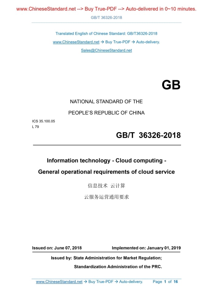 GB/T 36326-2018: Information technology - Cloud computing - General operational requirements of cloud service Delivery: 9 seconds. True-PDF full-copy in English & invoice will be downloaded + auto-delivered via email. See step-by-step procedure Status: Valid