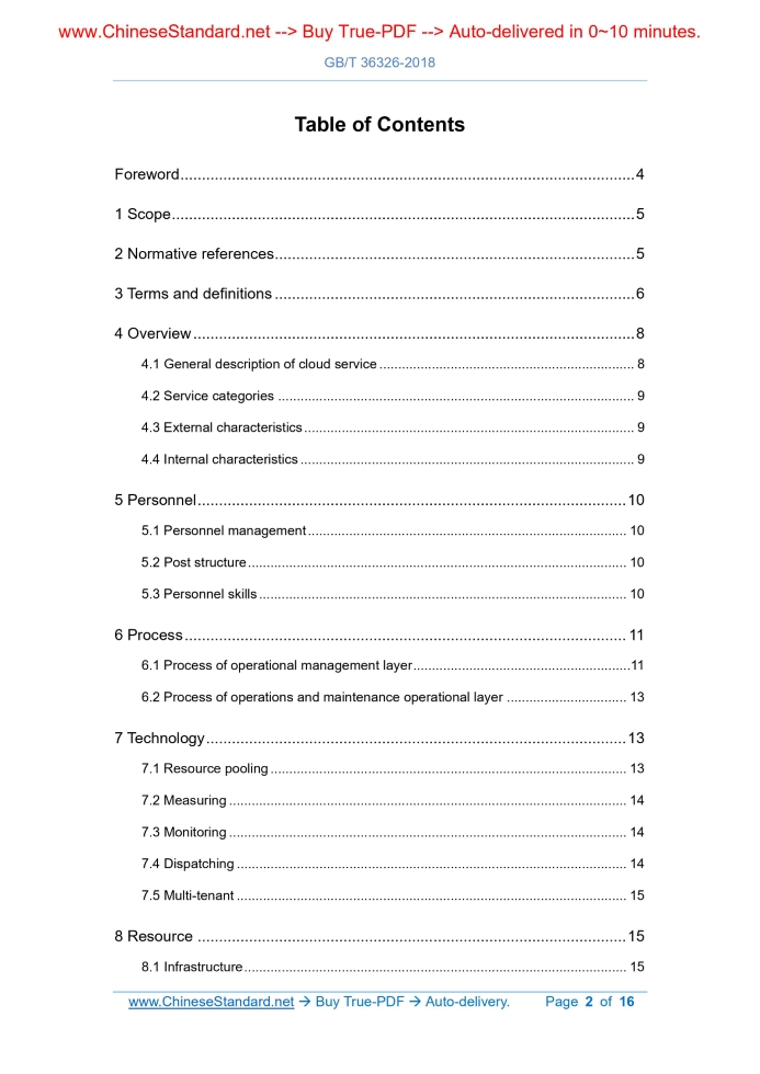 Similar standardsGB/T 36326-2018: Information technology - Cloud computing - General operational requirements of cloud service---This is an excerpt. Full copy of true-PDF in English version (including equations, symbols, images, flow-chart, tables, and figures etc.), auto-downloaded/delivered in 9 seconds, can be purchased online: https://www.ChineseStandard.net/PDF.aspx/GBT36326-2018 GB NATIONAL STANDARD OF THE PEOPLE’S REPUBLIC OF CHINA ICS 35.100.05 L 79 Information technology - Cloud computing - General operational requirements of cloud service Issued on: JUNE 07, 2018 Implemented on: JANUARY 01, 2019 Issued by. State Administration for Market Regulation; Standardization Administration of the PRC. Table of ContentsForeword ... 4 1 Scope ... 5 2 Normative references ... 5 3 Terms and definitions ... 6 4 Overview ... 8 4.1 General description of cloud service ... 8 4.2 Service categories ... 9 4.3 External characteristics ... 9 4.4 Internal characteristics ... 9 5 Personnel ... 10 5.1 Personnel management ... 10 5.2 Post structure ... 10 5.3 Personnel skills ... 10 6 Process ... 11 6.1 Process of operational management layer ... 11 6.2 Process of operations and maintenance operational layer ... 13 7 Technology ... 13 7.1 Resource pooling ... 13 7.2 Measuring ... 14 7.3 Monitoring ... 14 7.4 Dispatching ... 14 7.5 Multi-tenant ... 15 8 Resource ... 15 8.1 Infrastructure ... 15 8.2 Supporting environment ... 16 9 Security ... 16 Information technology - Cloud computing - General operational requirements of cloud service1 ScopeThis Standard gives a general description of cloud service and specifies the conditions and capabilities that cloud service provider shall have in terms of personnel, processes, technology, and resources. This Standard applies to. a) the basis for cloud service provider to raise needs to cloud service developer; b) cloud service provider to evaluate its own conditions and capabilities; c) cloud service customer to select and evaluate cloud service provider; d) the third party to evaluate the capabilities of cloud service provider.2 Normative referencesThe following documents are indispensable for the application of this document. For the dated references, only the editions with the dates indicated are applicable to this document. For the undated references, the latest edition (including all the amendments) are applicable to this document. GB/T 2887 General specification for computer field GB/T 9361 Safety requirements for computer field GB/T 28827.1-2012 Information technology service - Operations and maintenance - Part 1. General requirements GB/T 31168-2014 Information Security Technology - Security Capability Requirements of Cloud Computing Services GB/T 32400-2015 Information technology - Cloud computing - Overview and vocabulary operational elements, i.e., internal characteristics of cloud service; and GIVE specific operational requirements for internal characteristics. 4.2 Service categories The service categories of cloud computing mainly include IaaS, PaaS, and SaaS. The three modes, from the bottom up, provide different levels of cloud services, with hierarchical relationships, but the upper services do not have to be built on the underlying services. 4.3 External characteristics The external characteristics of cloud service are the characteristics that users can perceive through experience services. a) On-demand service. The cloud service can quickly and automatically meet the user’s needs for application, change, cancellation, and other operations of service delivery content such as service functions and service instances, so that the user’s needs can be met immediately; b) Elasticity. The cloud service has the capability of rapid elasticity; according to user’s needs, can apply, release, and adjust the use of cloud service resources at any time; c) Network dependency. Users of cloud services, over the network, access computing, storage resources and various services; d) Measurable. The cloud service itself has the ability to, in accordance with reasonably consistent standards, fine-grain measure the services of computing, storage, and other specific functions used by users. 4.4 Internal characteristics The internal characteristics of cloud service reflect the service delivery capabilities of cloud service provider, including the four elements of personnel, process, resource, and technology, as well as the security involved in the four elements. a) Personnel element includes personnel management, post structure, and personnel skills; b) Process element is divided into two layers. operational management layer and operations and maintenance operational layer; c) Technology element includes resource pooling technology, measuring technology, monitoring technology, dispatching technology, and multi- tenant technology;6 Process6.1 Process of operational management layer 6.1.1 Service catalog management Cloud service provider shall. a) define roles and responsibilities in the process; b) standardize and publish definitions of cloud computing related services; c) update and maintain the service catalog; d) regularly assess the consistency of service capabilities and service catalog; e) regularly assess the satisfaction of service needs and service catalog; f) establish the relationship between service catalog management and service level management. 6.1.2 Service level management Cloud service provider shall. a) identify customer needs in the service and form a service description and a service quality plan; b) identify the form of signing service level agreement and related documents; c) sign service level agreement and related documents; d) establish a mechanism for monitoring and reporting the service level; e) regularly or irregularly review the implementation of service level agreement; and for items which do not meet the cloud service level agreement, develop plans for improvement or further optimization. 6.1.3 Service request management Cloud servi