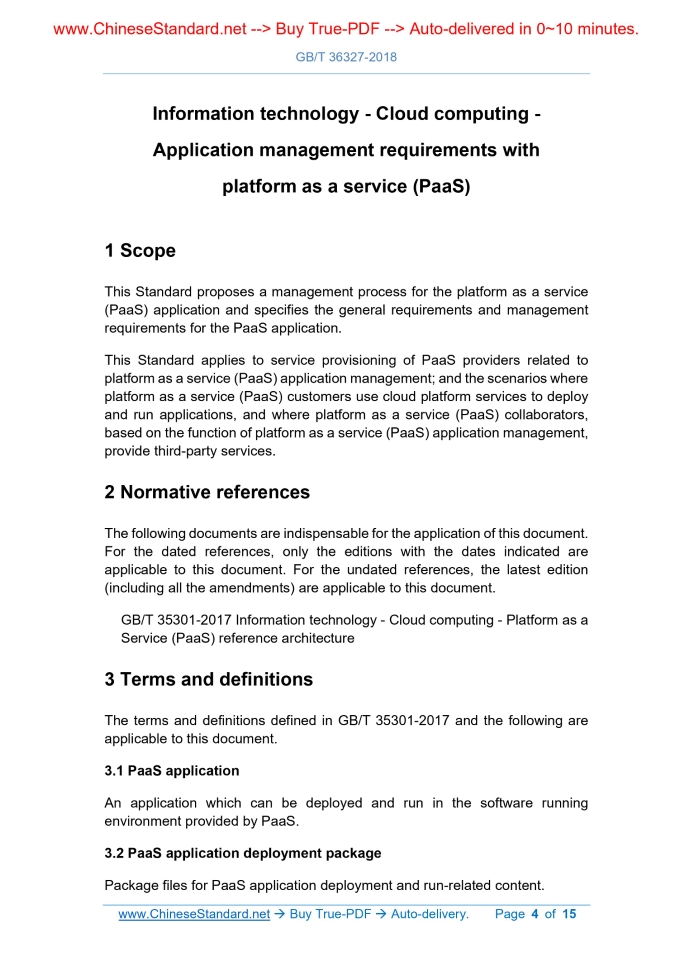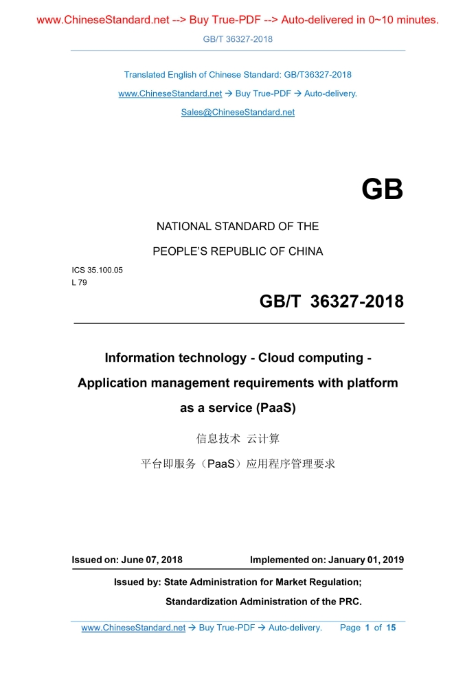 GB/T 36327-2018: Information technology - Cloud computing - Application management requirements with platform as a service (PaaS) Delivery: 9 seconds. True-PDF full-copy in English & invoice will be downloaded + auto-delivered via email. See step-by-step procedure Status: Valid