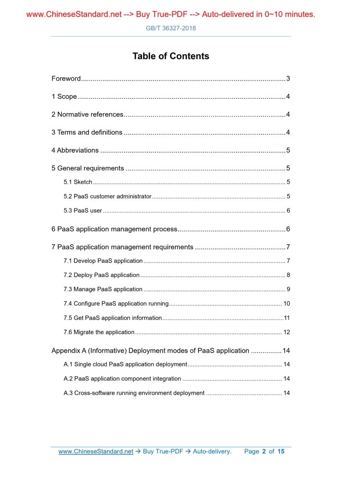 Similar standardsGB/T 36327-2018: Information technology - Cloud computing - Application management requirements with platform as a service (PaaS)---This is an excerpt. Full copy of true-PDF in English version (including equations, symbols, images, flow-chart, tables, and figures etc.), auto-downloaded/delivered in 9 seconds, can be purchased online: https://www.ChineseStandard.net/PDF.aspx/GBT36327-2018 GB NATIONAL STANDARD OF THE PEOPLE’S REPUBLIC OF CHINA ICS 35.100.05 L 79 Information technology - Cloud computing - Application management requirements with platform as a service (PaaS) Issued on: JUNE 07, 2018 Implemented on: JANUARY 01, 2019 Issued by. State Administration for Market Regulation; Standardization Administration of the PRC. Table of ContentsForeword ... 3 1 Scope ... 4 2 Normative references ... 4 3 Terms and definitions ... 4 4 Abbreviations ... 5 5 General requirements ... 5 5.1 Sketch ... 5 5.2 PaaS customer administrator ... 5 5.3 PaaS user ... 6 6 PaaS application management process ... 6 7 PaaS application management requirements ... 7 7.1 Develop PaaS application ... 7 7.2 Deploy PaaS application ... 8 7.3 Manage PaaS application ... 9 7.4 Configure PaaS application running ... 10 7.5 Get PaaS application information ... 11 7.6 Migrate the application ... 12 Appendix A (Informative) Deployment modes of PaaS application ... 14 A.1 Single cloud PaaS application deployment ... 14 A.2 PaaS application component integration ... 14 A.3 Cross-software running environment deployment ... 14 Information technology - Cloud computing - Application management requirements with platform as a service (PaaS)1 ScopeThis Standard proposes a management process for the platform as a service (PaaS) application and specifies the general requirements and management requirements for the PaaS application. This Standard applies to service provisioning of PaaS providers related to platform as a service (PaaS) application management; and the scenarios where platform as a service (PaaS) customers use cloud platform services to deploy and run applications, and where platform as a service (PaaS) collaborators, based on the function of platform as a service (PaaS) application management, provide third-party services.2 Normative referencesThe following documents are indispensable for the application of this document. For the dated references, only the editions with the dates indicated are applicable to this document. For the undated references, the latest edition (including all the amendments) are applicable to this document. GB/T 35301-2017 Information technology - Cloud computing - Platform as a Service (PaaS) reference architecture3 Terms and definitionsThe terms and definitions defined in GB/T 35301-2017 and the following are applicable to this document. 3.1 PaaS application An application which can be deployed and run in the software running environment provided by PaaS. 3.2 PaaS application deployment package Package files for PaaS application deployment and run-related content. 5.3 PaaS user To support the management of PaaS applications, PaaS providers shall provide the following capabilities for PaaS users. a) SUPPORT PaaS users to manage their account information; b) SUPPORT PaaS users to access monitoring information and logs of their own PaaS applications; c) SUPPORT PaaS users to perform related operations in the PaaS application management process; d) SUPPORT PaaS users to manage and edit basic information, authentication information, and payment information for their accounts.6 PaaS application management processThe PaaS application management process is divided into 4 stages of development, deployment, running, and migration, as shown in Figure 1. PaaS users advance and implement the following activities involved in these 4 stages. a) Development Based on the specifications, interfaces, tools, and services provided by PaaS, develop applications which can be deployed and run in the PaaS software running environment; and FORM a PaaS application deployment package. b) Deployment Deploy the PaaS application; configure the PaaS application; and prepare the application to run in the PaaS software running environment. c) Running Manage the running process of the PaaS application; and GET information about the running of the PaaS application. d) Migration Migrate the PaaS application out of the PaaS software running environment, to support the PaaS application to deploy and run in other software running environments. publishing examples; m) shall provide a graphical interface for applying for the publishing and withdrawal of PaaS applications; or provide an online telephone service. 7.4 Configure PaaS application running PaaS users, through PaaS interfaces, tools, and rules, configure the PaaS application’s running parameters, running policy, resources required for running, and batch running. PaaS providers. a) shall provide an interface or tool which declares the configurable parameters of PaaS application; b) shall support PaaS application configuration based on formatting templates (such as xml, etc.); c) shall provide the documentation for the configuration of running parameters of PaaS application and provide configuration examples; d) shall provide the template for the configuration of running parameters of PaaS application, for users to implement custom and extended configurations; e) shall save the configuration result of PaaS application running parameters in the log; f) shall provide documentation for the application policy configuration and provide configuration examples, where. The application running policies supported by the PaaS software running environment shall include security policy, resource usage policy, etc.; The application running policies supported by the PaaS software running environment shall be classified according to public cloud, proprietary cloud, and hybrid cloud; g) shall provide documentation for the PaaS application requesting running resources and p