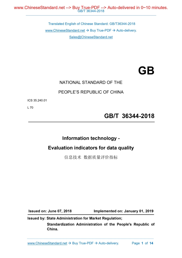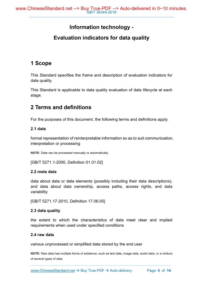 GB/T 36344-2018: Information technology - Evaluation indicators for data quality Delivery: 9 seconds. True-PDF full-copy in English & invoice will be downloaded + auto-delivered via email. See step-by-step procedure Status: Valid