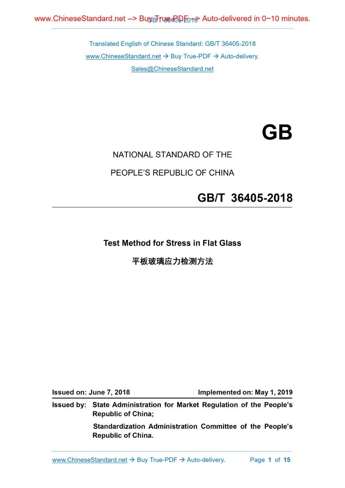 GB/T 36405-2018: Test Method for Stress in Flat Glass Delivery: 9 seconds. True-PDF full-copy in English & invoice will be downloaded + auto-delivered via email. See step-by-step procedure Status: Valid