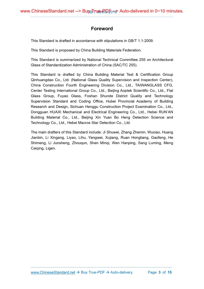 Similar standardsGB/T 36405-2018: Test Method for Stress in Flat Glass---This is an excerpt. Full copy of true-PDF in English version (including equations, symbols, images, flow-chart, tables, and figures etc.), auto-downloaded/delivered in 9 seconds, can be purchased online: https://www.ChineseStandard.net/PDF.aspx/GBT36405-2018GB NATIONAL STANDARD OF THE PEOPLE’S REPUBLIC OF CHINA Test Method for Stress in Flat Glass Issued on: JUNE 7, 2018 Implemented on: MAY 1, 2019 Issued by. State Administration for Market Regulation of the People’s Republic of China; Standardization Administration Committee of the People’s Republic of China. Table of ContentsForeword ... 3 1 Scope ... 4 2 Normative References ... 4 3 Terms and Definitions ... 4 4 Test Principle ... 5 5 Stress Test Method ... 7 6 Test Report ... 15ForewordThis Standard is drafted in accordance with stipulations in GB/T 1.1-2009. This Standard is proposed by China Building Materials Federation. This Standard is summarized by National Technical Committee 255 on Architectural Glass of Standardization Administration of China (SAC/TC 255). This Standard is drafted by China Building Material Test & Certification Group Qinhuangdao Co., Ltd. (National Glass Quality Supervision and Inspection Center), China Construction Fourth Engineering Division Co., Ltd., TAIWANGLASS CFG, Center Testing International Group Co., Ltd., Beijing Aoptek Scientific Co., Ltd., Flat Glass Group, Fuyao Glass, Foshan Shunde District Quality and Technology Supervision Standard and Coding Office, Hubei Provincial Academy of Building Research and Design, Sichuan Henggu Construction Project Examination Co., Ltd., Dongguan HUAXI Mechanical and Electrical Engineering Co., Ltd., Hebei RUN’AN Building Material Co., Ltd., Beijing Xin Yuan Bo Heng Detection Science and Technology Co., Ltd., Hebei Macros Star Detection Co., Ltd. The main drafters of this Standard include. Ji Shuwei, Zhang Zhemin, Wuxiao, Huang Jianbin, Li Xingang, Liyao, Lihu, Yangwei, Xujiang, Ruan Hongliang, Gaofeng, He Shimeng, Li Junsheng, Zhouqun, Shen Minqi, Wen Hanping, Sang Luming, Meng Caiqing, Ligen. Test Method for Stress in Flat Glass1 ScopeThis Standard specifies terms, definition, test principle, stress test method and test report related with flat glass stress test. This Standard is applicable to the test of annealed flat glass plane stress and plate thickness stress.2 Normative ReferencesThe following documents are indispensable to the application of this Standard. In terms of references with a specified date, only versions with a specified date are applicable to this Standard. The latest version (including all the modifications) of references without a specified date is also applicable to this Standard. GB/T 15764 Standard Definitions of Terms Relating to Flat Glass3 Terms and DefinitionsThe following terms and definitions, as well as terms and definitions provided in GB/T 15764 are applicable to this Standard. 3.1 Plane Stress Plane stress is permanent tensile stress or compressive stress that exists among different areas of plane glass after the glass is molded. 3.2 Interior Stress It is permanent stress generated by temperature gradient under the plate thickness direction after the glass is molded. Compressive stress exists on the surface, and tensile stress exists in the central area. 3.3 Polarizer Polarizer is placed between light source and the sample being tested. It turns natural light into a device with plane polarized light and a certain vibration direction. 3.4 Analyzer Analyzer is placed between the sample being tested and the observer. It is a polarizing device adopted to analyze polarization. Randomly draw a piece of finished product, and cut 600 mm x 600 mm of sample along the same direction or the direction of the board width. 5.1.3.2 Sample processing Rinse the sample, guarantee that the surface is clean and there’s no attachment. 5.1.4 Determination of test area The central section (diameter. 500 mm) of the sample is test area. 5.1.5 Test steps Please see the test steps below. a) Measure the thickness of the sample (accurate to 0.1 mm); b) Activate stress detector; make the main direction of the polarizer and analyzer mutually orthogonal; c) Place the test sample between the polarizer and analyzer, then, make the surface of the sample vertical to the optical path; horizontally place the samples in accordance with the pulling direction; d) Operate the stress detector through the test and control software in accordance with the instrument specification, then, complete the stress test and calculation of the test area; e) Record stress distribution diagram and the measured stress value of various points in the test area in accordance with the sample number. 5.1.6 Expression of test result 5.1.6.1 Plate stress distribution diagram Calculate the stress value of the test area of the test sample in accordance with Formula (6). Calculate the absolute value of the stress value on the plane of x y coordinate; draw the plane stress distribution of the test sample with grayscale or colors. 5.1.6.2 Average value of plate stress Calculate the positive value of tensile stress and compressive stress; calculate the arithmetic mean value of stress within the test area. 5.1.6.3 Maximum value of plate stress The maximum value of the absolute value of stress within the test area. Where. I (x, y) - Light intensity distribution detected by camera; Io - Same as Formula (7); T - Same as Formula (7); ẟ (x, y) - Stress birefringence phase difference of the test point, expressed in (rad). Stress birefringence phase difference of the test point shall be calculated in accordance with Formula (9). 5.2.4 Stress calculation Birefringence optical path difference △ (x, y) shall be calculated in accordance with Formula (2). Plate thickness stress of various test points shall be calculated in accordance with Formula (10). Where. σ (x, y) - The stress value of the test sample, expressed in (MPa); 