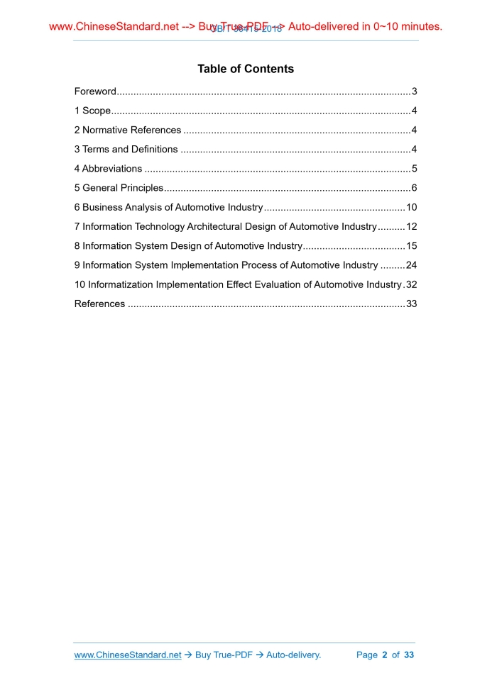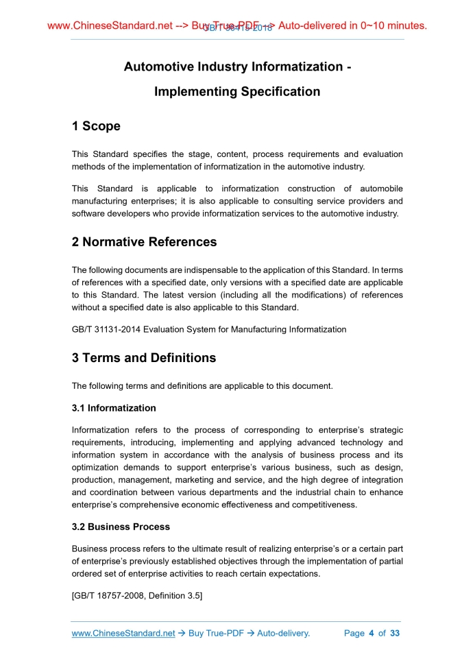 Similar standardsGB/T 36415-2018: Automotive Industry Informatization - Implementing Specification---This is an excerpt. Full copy of true-PDF in English version (including equations, symbols, images, flow-chart, tables, and figures etc.), auto-downloaded/delivered in 9 seconds, can be purchased online: https://www.ChineseStandard.net/PDF.aspx/GBT36415-2018GB NATIONAL STANDARD OF THE PEOPLE’S REPUBLIC OF CHINA ICS 35.240.50 J 07 Automotive Industry Informatization - Implementing Specification Issued on: JUNE 7, 2018 Implemented on: JANUARY 1, 2019 Issued by. State Administration for Market Regulation; Standardization Administration of the People’s Republic of China. Table of ContentsForeword ... 3 1 Scope ... 4 2 Normative References ... 4 3 Terms and Definitions ... 4 4 Abbreviations ... 5 5 General Principles ... 6 6 Business Analysis of Automotive Industry ... 10 7 Information Technology Architectural Design of Automotive Industry ... 12 8 Information System Design of Automotive Industry ... 15 9 Information System Implementation Process of Automotive Industry ... 24 10 Informatization Implementation Effect Evaluation of Automotive Industry . 32 References ... 33 Automotive Industry Informatization - Implementing Specification1 ScopeThis Standard specifies the stage, content, process requirements and evaluation methods of the implementation of informatization in the automotive industry. This Standard is applicable to informatization construction of automobile manufacturing enterprises; it is also applicable to consulting service providers and software developers who provide informatization services to the automotive industry.2 Normative ReferencesThe following documents are indispensable to the application of this Standard. In terms of references with a specified date, only versions with a specified date are applicable to this Standard. The latest version (including all the modifications) of references without a specified date is also applicable to this Standard. GB/T 31131-2014 Evaluation System for Manufacturing Informatization3 Terms and DefinitionsThe following terms and definitions are applicable to this document. 3.1 Informatization Informatization refers to the process of corresponding to enterprise’s strategic requirements, introducing, implementing and applying advanced technology and information system in accordance with the analysis of business process and its optimization demands to support enterprise’s various business, such as design, production, management, marketing and service, and the high degree of integration and coordination between various departments and the industrial chain to enhance enterprise’s comprehensive economic effectiveness and competitiveness. 3.2 Business Process Business process refers to the ultimate result of realizing enterprise’s or a certain part of enterprise’s previously established objectives through the implementation of partial ordered set of enterprise activities to reach certain expectations. [GB/T 18757-2008, Definition 3.5] virtual design, 3D printing, industrial robot and intelligent equipment in critical business links; enhance enterprise’s capabilities in collaborative research and development, precise management and control, intelligent manufacturing and collaborative service of the industrial chain; expedite the generation of a new industrial form of service- oriented manufacturing, such as cloud manufacturing, additive manufacturing and large-scale personalized customization, etc.; motivate enterprise’s transformation, upgrade and development in the automotive industry. 5.1.4 The principle of construction unity The implementation of informatization shall aim at enterprise business and global organization, establish informatization construction group that is led by the top management layer and constituted of senior business personnel, information technology backbones and a third-party consulting supervision to cover enterprise’s informatization standard establishment, overall planning design, implementation maintenance and service evaluation; implement “unity in standard, planning and construction”; guarantee integrated operation of enterprise’s informatization construction, and prevent the occurrence of questions like information isolated island and redundant construction, etc. 5.1.5 The principle of management normalization The implementation of informatization shall reinforce enterprise’s inter-business departments collaboration and even inter-enterprises collaboration; establish and refine informatization management mechanism system that includes information standard, information security protection system and informatization management and control system; systematically identify and scientifically manage all elements and whole-process involved in informatization construction; guarantee continuous control and innovative development of the informatization construction process; implement spiral escalation of the efficiency and effect of informatization construction. 5.2 Implementation Stage In the automotive industry, informatization shall be systematically implemented on the foundation of enterprise’s business development strategies in accordance with the achievements and development tendency of industrial informatization construction, advanced technological philosophies and service-oriented manufacturing pattern, and three stages of business analysis - information technology architectural design - information system implementation. Please refer to Figure 1. 5.3.1 Overview In the automotive industry, the implementation of informatization shall comply with the implementation requirements of “strategic-orientation, overall planning; demand guidance, step-by-step implementation; beneficial drive, breakthrough at key points; progress step by step, perseverance”. 5.3.2 Strategic orientation, overall planning The implementation of informatization must thoroughly consider the development tendency of 