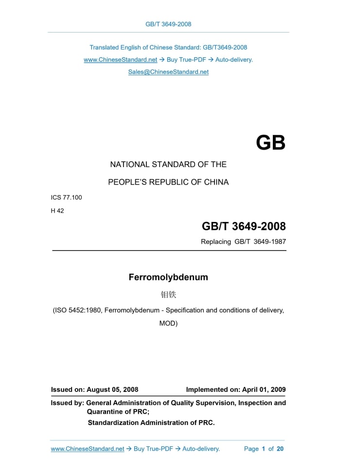 GB/T 3649-2008: Ferromolybdenum Delivery: 9 seconds. True-PDF full-copy in English & invoice will be downloaded + auto-delivered via email. See step-by-step procedure Status: Valid GB/T 3649: Historical versions