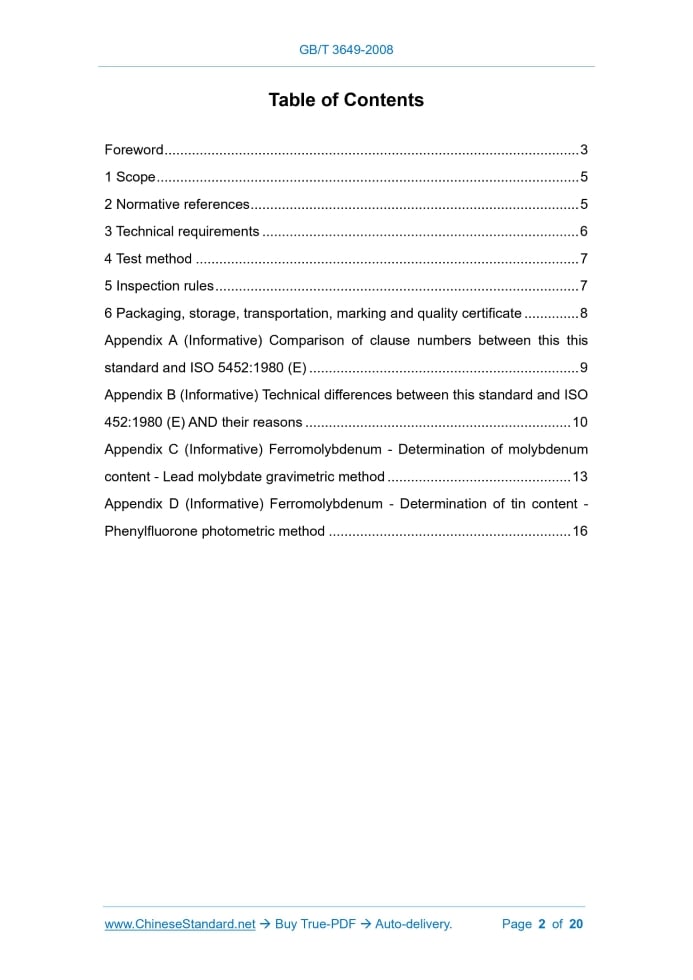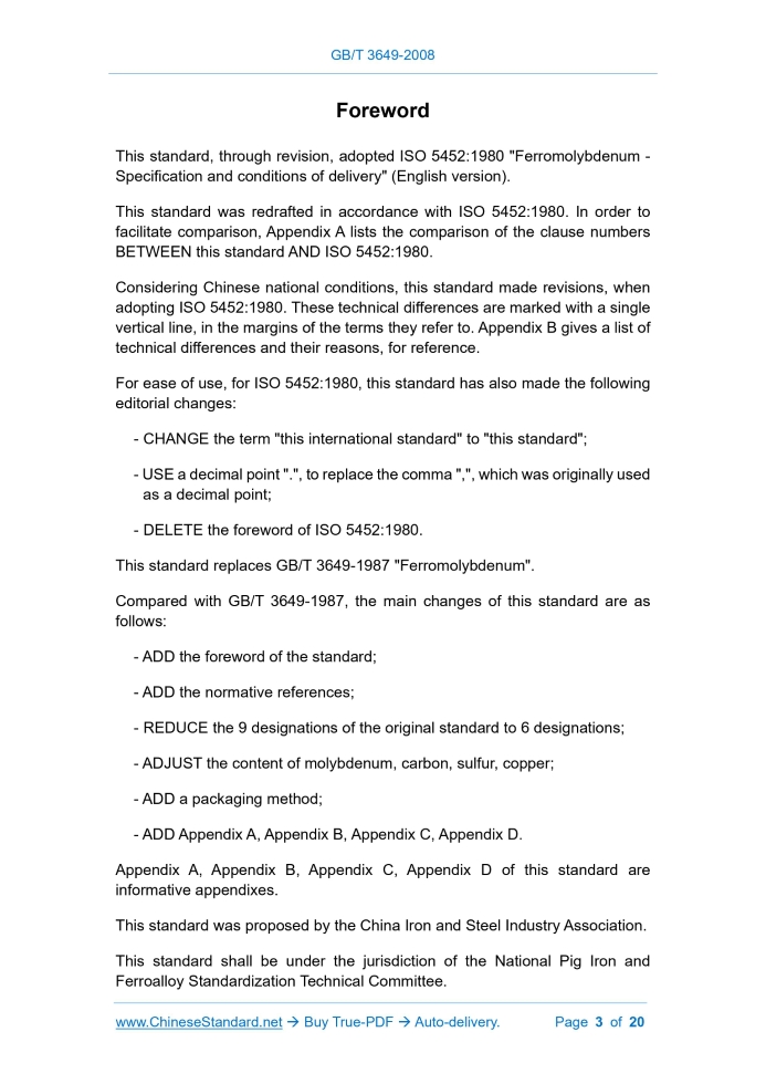 GB/T 3649-2008: Ferromolybdenum---This is an excerpt. Full copy of true-PDF in English version (including equations, symbols, images, flow-chart, tables, and figures etc.), auto-downloaded/delivered in 9 seconds, can be purchased online: https://www.ChineseStandard.net/PDF.aspx/GBT3649-2008GB NATIONAL STANDARD OF THE PEOPLE’S REPUBLIC OF CHINA ICS 77.100 H 42 Replacing GB/T 3649-1987 Ferromolybdenum (ISO 5452:1980, Ferromolybdenum - Specification and conditions of delivery, MOD) ISSUED ON: AUGUST 05, 2008 IMPLEMENTED ON: APRIL 01, 2009 Issued by: General Administration of Quality Supervision, Inspection and Quarantine of PRC; Standardization Administration of PRC. Table of ContentsForeword ... 3 1 Scope ... 5 2 Normative references ... 5 3 Technical requirements ... 6 4 Test method ... 7 5 Inspection rules ... 7 6 Packaging, storage, transportation, marking and quality certificate ... 8 Appendix A (Informative) Comparison of clause numbers between this this standard and ISO 5452:1980 (E) ... 9 Appendix B (Informative) Technical differences between this standard and ISO 452:1980 (E) AND their reasons ... 10 Appendix C (Informative) Ferromolybdenum - Determination of molybdenum content - Lead molybdate gravimetric method ... 13 Appendix D (Informative) Ferromolybdenum - Determination of tin content - Phenylfluorone photometric method ... 16ForewordThis standard, through revision, adopted ISO 5452:1980 "Ferromolybdenum - Specification and conditions of delivery" (English version). This standard was redrafted in accordance with ISO 5452:1980. In order to facilitate comparison, Appendix A lists the comparison of the clause numbers BETWEEN this standard AND ISO 5452:1980. Considering Chinese national conditions, this standard made revisions, when adopting ISO 5452:1980. These technical differences are marked with a single vertical line, in the margins of the terms they refer to. Appendix B gives a list of technical differences and their reasons, for reference. For ease of use, for ISO 5452:1980, this standard has also made the following editorial changes: - CHANGE the term "this international standard" to "this standard"; - USE a decimal point ".", to replace the comma ",", which was originally used as a decimal point; - DELETE the foreword of ISO 5452:1980. This standard replaces GB/T 3649-1987 "Ferromolybdenum". Compared with GB/T 3649-1987, the main changes of this standard are as follows: - ADD the foreword of the standard; - ADD the normative references; - REDUCE the 9 designations of the original standard to 6 designations; - ADJUST the content of molybdenum, carbon, sulfur, copper; - ADD a packaging method; - ADD Appendix A, Appendix B, Appendix C, Appendix D. Appendix A, Appendix B, Appendix C, Appendix D of this standard are informative appendixes. This standard was proposed by the China Iron and Steel Industry Association. This standard shall be under the jurisdiction of the National Pig Iron and Ferroalloy Standardization Technical Committee. Ferromolybdenum1 ScopeThis standard specifies the technical requirements, test methods, inspection rules, packaging, storage and transportation, marking and quality certificates of ferromolybdenum. This standard applies to ferromolybdenum, which is added, as a molybdenum additive, in steelmaking, casting or alloy materials.2 Normative referencesThe provisions in following documents become the provisions of this Standard through reference in this Standard. For the dated references, the subsequent amendments (excluding corrections) or revisions do not apply to this Standard; however, parties who reach an agreement based on this Standard are encouraged to study if the latest versions of these documents are applicable. For undated references, the latest edition of the referenced document applies. GB/T 3650 The general rules for inspection packing storing transportation marking and certification of ferroalloy GB/T 4010 Ferroalloys - Sampling and preparation of samples for chemical analysis (GB/T 4010-1994, neq ISO 4552:1987) GB/T 5059.1 Methods for chemical analysis of ferromolybdenum - The 8- hydroxyquinoline gravimetric method for the determination of molybdenum GB/T 5059.2 Methods for chemical analysis of ferromolybdenum - The malachite green spectrophotometric method for the determination of antimony content GB/T 5059.3 Methods for chemical analysis of ferromolybdenum - The atomic absorption spectrophotometric method for the determination of copper content GB/T 5059.5 Methods for chemical analysis of ferromolybdenum - The gravimetric method for the determination of silicon content GB/T 5059.6 Ferromolybdenum - Determination of phosphorus content - Molybdo bismuthyl phosphoric blue spectrophotometric method and the The sampling and preparation of samples, for chemical analysis of ferromolybdenum shall be in accordance with the provisions of GB/T 4010. 5.3 Quality inspection and acceptance The quality inspection and acceptance of ferromolybdenum shall meet the requirements of GB/T 3650. 5.4 Sampling and acceptance of particle size The sampling and acceptance of the ferromolybdenum particle size shall be in accordance with the provisions of GB/T 13247.6 Packaging, storage, transportation, marking andquality certificate 6.1 Packaging The products are packed in iron drums or bags, which has a net weight of 100 kg per drum or 1000 kg per bag. If the purchaser has special requirements for packaging, the supplier and the purchaser can negotiate separately. 6.2 Storage, transportation, marking, quality certificate The storage, transportation, marking, quality certificate of the product shall comply with the requirements of GB/T 3650. 6.3 Other If the purchaser has special requirements for product packaging, storage, transportation, marking, etc., it shall be carried out in accordance with the contract. ......Source: Above contents are excerpted from the full-copy PDF -- translated/reviewed by: www.ChineseStandard.net / Wayne Zheng et al. Tips & Frequen