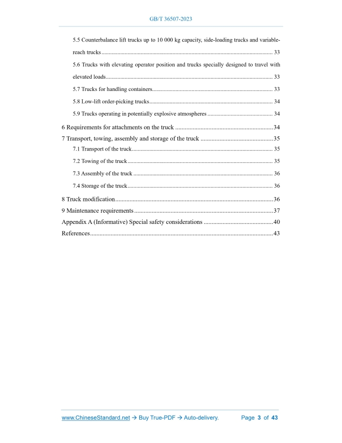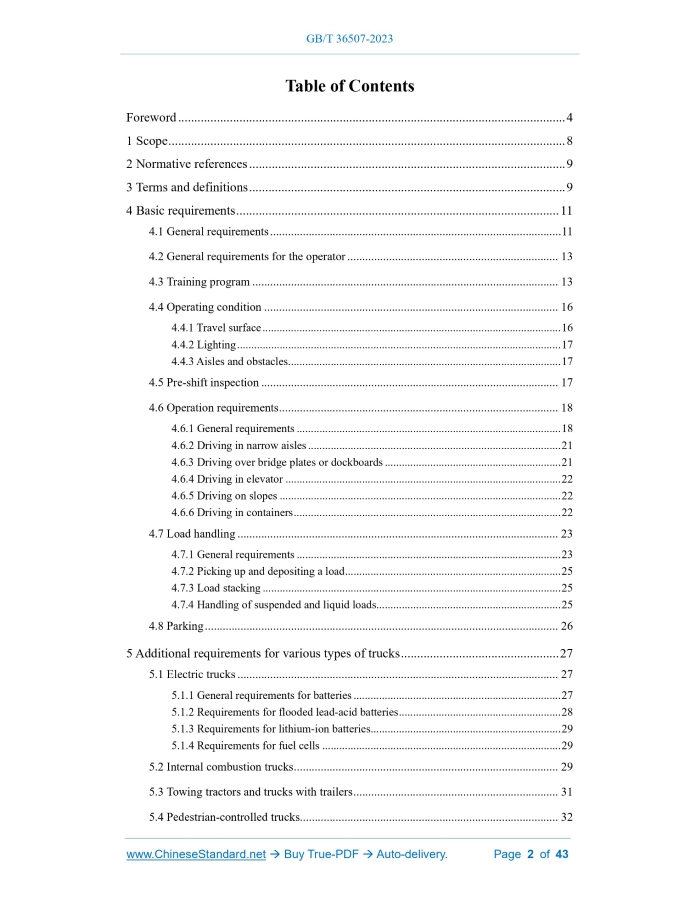 Similar standardsGB/T 36507-2023: Industrial trucks - Safety rules for application, operation and maintenance---This is an excerpt. Full copy of true-PDF in English version (including equations, symbols, images, flow-chart, tables, and figures etc.), auto-downloaded/delivered in 9 seconds, can be purchased online: https://www.ChineseStandard.net/PDF.aspx/GBT36507-2023GB NATIONAL STANDARD OF THE PEOPLE’S REPUBLIC OF CHINA ICS 53.060 CCS J 83 GB/T 36507-2023 / ISO 21262:2020 Replacing GB/T 36507-2018 Industrial trucks - Safety rules for application, operation and maintenance (ISO 21262:2020, IDT) ISSUED ON: MAY 23, 2023 IMPLEMENTED ON: DECEMBER 01, 2023 Issued by: State Administration for Market Regulation; Standardization Administration of the People’s Republic of China. Table of ContentsForeword ... 4 1 Scope ... 8 2 Normative references ... 9 3 Terms and definitions ... 9 4 Basic requirements ... 11 4.1 General requirements ... 11 4.2 General requirements for the operator ... 13 4.3 Training program ... 13 4.4 Operating condition ... 16 4.4.1 Travel surface ... 16 4.4.2 Lighting ... 17 4.4.3 Aisles and obstacles ... 17 4.5 Pre-shift inspection ... 17 4.6 Operation requirements ... 18 4.6.1 General requirements ... 18 4.6.2 Driving in narrow aisles ... 21 4.6.3 Driving over bridge plates or dockboards ... 21 4.6.4 Driving in elevator ... 22 4.6.5 Driving on slopes ... 22 4.6.6 Driving in containers ... 22 4.7 Load handling ... 23 4.7.1 General requirements ... 23 4.7.2 Picking up and depositing a load ... 25 4.7.3 Load stacking ... 25 4.7.4 Handling of suspended and liquid loads ... 25 4.8 Parking ... 26 5 Additional requirements for various types of trucks ... 27 5.1 Electric trucks ... 27 5.1.1 General requirements for batteries ... 27 5.1.2 Requirements for flooded lead-acid batteries ... 28 5.1.3 Requirements for lithium-ion batteries... 29 5.1.4 Requirements for fuel cells ... 29 5.2 Internal combustion trucks ... 29 5.3 Towing tractors and trucks with trailers ... 31 5.4 Pedestrian-controlled trucks ... 32 5.5 Counterbalance lift trucks up to 10 000 kg capacity, side-loading trucks and variable- reach trucks ... 33 5.6 Trucks with elevating operator position and trucks specially designed to travel with elevated loads ... 33 5.7 Trucks for handling containers ... 33 5.8 Low-lift order-picking trucks ... 34 5.9 Trucks operating in potentially explosive atmospheres ... 34 6 Requirements for attachments on the truck ... 34 7 Transport, towing, assembly and storage of the truck ... 35 7.1 Transport of the truck ... 35 7.2 Towing of the truck ... 35 7.3 Assembly of the truck ... 36 7.4 Storage of the truck ... 36 8 Truck modification ... 36 9 Maintenance requirements ... 37 Appendix A (Informative) Special safety considerations ... 40 References ... 43 Industrial trucks - Safety rules for application, operation and maintenance1 ScopeThis document specifies the safety requirements for the application, operation, maintenance, transport, towing, assembly, storage and modification of industrial trucks (hereinafter referred to as “trucks”) as defined in ISO 5053-1. This document applies to the following types of trucks: a) counterbalanced trucks; b) reach trucks (with retractable mast or retractable fork arm carriage); c) straddle trucks; d) pallet stackers; e) platform trucks; f) double stackers; g) single-side-loading trucks; h) lateral-stacking trucks (both sides) and lateral- and front-stacking trucks; i) order-picking trucks; j) bidirectional and multidirectional trucks; k) counterbalance container handlers; l) articulated counterbalanced trucks; m) variable-reach trucks; n) pallet trucks; o) platform and stillage trucks; p) tractors with a drawbar pull up to and including 20 000 N; q) burden and personnel carriers; r) trucks powered by battery, diesel, gasoline or gas (e.g., liquefied petroleum gas, compressed natural gas, liquefied natural gas). This document also applies to the above-mentioned trucks with automated functions or driverless variants.2 Normative referencesThe following documents are referred to in the text in such a way that some or all of their content constitutes requirements of this document. For dated references, only the version corresponding to that date is applicable to this document; for undated references, the latest version (including all amendments) is applicable to this document. ISO 3691-1, Industrial trucks - Safety requirements and verification - Part 1: Self- propelled industrial trucks, other than driverless trucks, variable-reach trucks and burden-carrier trucks Note: GB/T 10827.1-2014, Industrial trucks - Safety requirements and verification - Part 1: Self-propelled industrial trucks, other than driverless trucks, variable- reach trucks and burden-carrier trucks (ISO 3691-1:2011, IDT) ISO 3691-4 Industrial trucks - Safety requirements and verification - Part 4: Driverless industrial trucks and their systems Note: GB/T 10827.4-2023, Industrial trucks - Safety requirements and verification - Part 4: Driverless industrial trucks and their systems (ISO 3691-4:2020, IDT) ISO 5053-1:2020, Industrial trucks - Vocabulary - Part 1: Types of industrial trucks Note: GB/T 6104.1-2018, Industrial trucks - Terminology and classification - Part 1: Types of industrial trucks (ISO 5053-1:2015, IDT) ISO 5057, Industrial trucks - Inspection and repair of fork arms in service on fork- lift trucks Note: GB/T 17910-1999, Industrial trucks - Inspection and repair of fork arms in service on fork-lift trucks (ISO 5057:1993, IDT)3 Terms and definitionsFor the purposes of this document, the terms and definitions given in ISO 5053-1:2020 and the following apply. 3.1 user 4.1.4 If trucks are used in special areas (e.g., cold storage or public roads), additional requirements may apply. 4.1.5 The user may take additional fire prevention measures or facilities according to the environment where the truck is used. 4.1.6 The user shall ensure that trucks used in work environmen