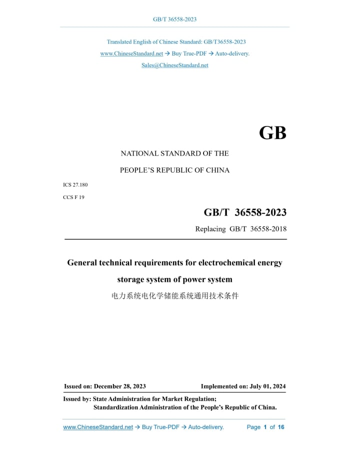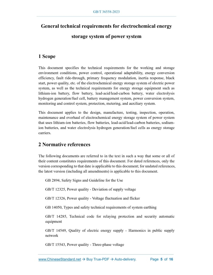 Similar standardsGB/T 36558-2023: General technical requirements for electrochemical energy storage system of power system---This is an excerpt. Full copy of true-PDF in English version (including equations, symbols, images, flow-chart, tables, and figures etc.), auto-downloaded/delivered in 9 seconds, can be purchased online: https://www.ChineseStandard.net/PDF.aspx/GBT36558-2023 GB NATIONAL STANDARD OF THE PEOPLE’S REPUBLIC OF CHINA ICS 27.180 CCS F 19 Replacing GB/T 36558-2018 General technical requirements for electrochemical energy storage system of power system ISSUED ON: DECEMBER 28, 2023 IMPLEMENTED ON: JULY 01, 2024 Issued by: State Administration for Market Regulation; Standardization Administration of the People’s Republic of China. Table of ContentsForeword ... 3 1 Scope ... 5 2 Normative references ... 5 3 Terms and definitions ... 7 4 Environmental conditions ... 7 5 System technical requirements ... 8 6 Equipment technical requirements ... 13 General technical requirements for electrochemical energy storage system of power system1 ScopeThis document specifies the technical requirements for the working and storage environment conditions, power control, operational adaptability, energy conversion efficiency, fault ride-through, primary frequency modulation, inertia response, black start, power quality, etc. of the electrochemical energy storage system of electric power system, as well as the technical requirements for energy storage equipment such as lithium-ion battery, flow battery, lead-acid/lead-carbon battery, water electrolysis hydrogen generation/fuel cell, battery management system, power conversion system, monitoring and control system, protection, metering, and auxiliary system. This document applies to the design, manufacture, testing, inspection, operation, maintenance and overhaul of electrochemical energy storage system of power system that uses lithium-ion batteries, flow batteries, lead-acid/lead-carbon batteries, sodium- ion batteries, and water electrolysis hydrogen generation/fuel cells as energy storage carriers.2 Normative referencesThe following documents are referred to in the text in such a way that some or all of their content constitutes requirements of this document. For dated references, only the version corresponding to that date is applicable to this document; for undated references, the latest version (including all amendments) is applicable to this document. GB 2894, Safety Signs and Guideline for the Use GB/T 12325, Power quality - Deviation of supply voltage GB/T 12326, Power quality - Voltage fluctuation and flicker GB 14050, Types and safety technical requirements of system earthing GB/T 14285, Technical code for relaying protection and security automatic equipment GB/T 14549, Quality of electric energy supply - Harmonics in public supply network GB/T 15543, Power quality - Three-phase voltage Electrochemical energy storage systems shall be stored under the following environmental conditions: a) Ambient temperature: -30 ℃ ~ 50 ℃; for energy storage equipment containing liquid, effective measures shall be taken to prevent the liquid from solidifying when stored at low temperatures. b) Relative humidity: ≤95%, no condensation. c) The storage environment shall be protected from sunlight and rain, and kept clean, dry, and ventilated. It shall be away from fire sources, heat sources, corrosive media, and heavy objects.5 System technical requirements5.1 General requirements 5.1.1 The electrochemical energy storage system mainly includes energy storage battery, battery management system, power conversion system, monitoring and control system, relay protection and safety automatic devices, metering system and related auxiliary system and other equipment. 5.1.2 Under normal working conditions, the charge and discharge energy and power of the electrochemical energy storage system shall not be lower than the rated charge and discharge energy and rated power; the system shall have one or more application functions of system peak regulation, frequency regulation, emergency power support, voltage control, tracking plan curve, smooth power output, voltage sag support, and backup power supply. 5.1.3 The voltage level of the electrochemical energy storage system connected to the power grid shall be determined after economic comparison based on the system's rated installed capacity, application functions, and the grid structure of the access point. 5.1.4 The electrochemical energy storage system connected to the grid shall meet the relevant requirements of GB 38755 and GB/T 31464. 5.1.5 The electrochemical energy storage system shall be able to receive and execute remote or local power control instructions and shall have four-quadrant power control function. 5.1.6 The grid-related protection configuration and setting of the electrochemical energy storage system shall be coordinated with the protection of the connected power grid. 5.1.7 The information security protection of the electrochemical energy storage system connected to the dispatching automation system shall comply with the provisions of GB/T 36572. 5.1.8 The grounding method of the electrochemical energy storage system shall be compatible with the grounding method of the connected power grid; lightning protection and grounding shall comply with the relevant provisions of GB 14050, GB 50057 and GB/T 50065. 5.1.9 The electrochemical energy storage system connected to the grid at a voltage level of 10 kV and above shall establish electromagnetic transient, electromechanical transient and medium- and long-term dynamic simulation models in accordance with the requirements of GB/T 42716. 5.2 Power control 5.2.1 Active power 5.2.1.1 When the electrochemical energy storage system responds to the local active power control command, the charge/discharge response time shall not exceed 500 ms, the charge/discharge adjustment time shall not exceed 2 s, the charge-to-discharge conversion time and the 