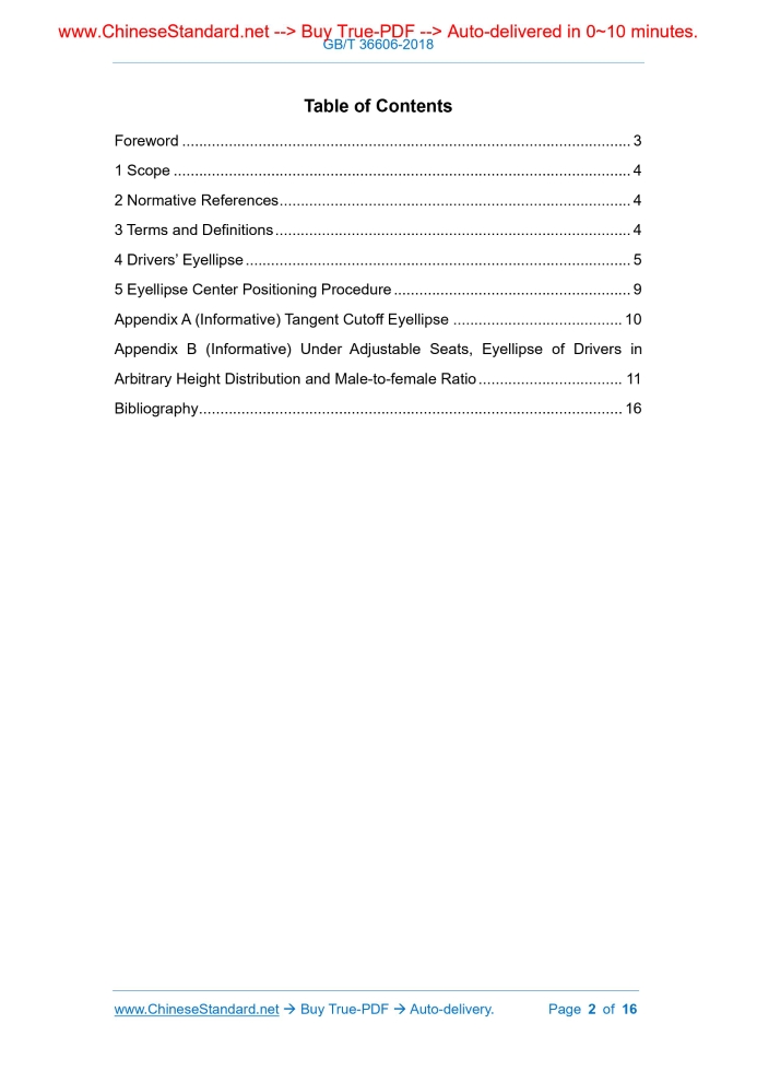Similar standardsGB/T 36606-2018: Ergonomics - Motor Vehicle Drivers Eye Locations---This is an excerpt. Full copy of true-PDF in English version (including equations, symbols, images, flow-chart, tables, and figures etc.), auto-downloaded/delivered in 9 seconds, can be purchased online: https://www.ChineseStandard.net/PDF.aspx/GBT36606-2018NATIONAL STANDARD OF THE PEOPLE’S REPUBLIC OF CHINA ICS 13.180 A 25 Ergonomics - Motor Vehicle Drivers’ Eye Locations ISSUED ON: SEPTEMBER 17, 2018 IMPLEMENTED ON: JANUARY 1, 2019 Issued by: State Administration for Market Regulation; Standardization Administration of the People’s Republic of China. Table of ContentsForeword ... 3 1 Scope ... 4 2 Normative References ... 4 3 Terms and Definitions ... 4 4 Drivers’ Eyellipse ... 5 5 Eyellipse Center Positioning Procedure ... 9 Appendix A (Informative) Tangent Cutoff Eyellipse ... 10 Appendix B (Informative) Under Adjustable Seats, Eyellipse of Drivers in Arbitrary Height Distribution and Male-to-female Ratio ... 11 Bibliography ... 16 Ergonomics - Motor Vehicle Drivers’ Eye Locations1 ScopeThis Standard provides eye locations and eyellipse positioning procedure for Chinese motor vehicle drivers. This Standard is applicable to visual field design for Class M1 motor vehicles whose seat stroke is more than 133 mm.2 Normative ReferencesThe following documents are indispensable to the application of this Standard. In terms of references with a specified date, only versions with a specified date are applicable to this Standard. In terms of references without a specified date, the latest version (including all the modifications) is applicable to this Standard. GB/T 15089-2001 Classification of Power-driven Vehicles and Trailers GB/T 29120-2012 Procedure for H-point and R-point Determination3 Terms and DefinitionsTerms and definitions defined in GB/T 15089-2001 and GB/T 29120-2012 are applicable to this Standard. 3.1 Eyellipse Eyellipse refers to the statistical representation of drivers’ eyes in spatially relative internal vehicle reference point locations (please refer to Figure 1). In vertical view (Z plane) and rear view (X plane), eyellipse X-axis is parallel to vehicle axis. 4.3.2 angle of lateral view direction Please refer to Formula (1) for eyellipse axis inclination in the lateral view direction: 4.4 Eyellipse Central Location Eyellipse central location shall be calculated in accordance with Formula (2) ~ Formula (5). Please refer to Figure 3 for the geometric relationships of various parameters. Where, Xc---along X direction, the distance between X-axis datum line and eyellipse central location, expressed in (mm); L1---X coordinate of acceleration pedal reference point; L6---the distance from steering wheel’s central point to acceleration pedal reference point in X direction, expressed in (mm); H30---the distance from SgRP to acceleration pedal heel point in Z direction, expressed in (mm); t---variable value (set as 1 when there is clutch pedal; set as 0 when there is no clutch pedal); Ycl, Ycr---along Y direction, the distance between the left - right eyellipse center and eyellipse central point, expressed in (mm); W20---Y coordinate value of SgRP; Zc---along Z direction, the distance between SgRP and eyellipse central point, expressed in (mm); H8---Z coordinate value of heel point. NOTE 1: Chinese body’s average interpupillary distance shall take relevant national Chinese body’s average interpupillary distance Chinese body’s average interpupillary distance W20---Y coordinate value of SgRP; H8---coordinate value of heel point in Z axis direction; H30---distance from SgRP to heel point in Z axis direction, expressed in (mm); t---variable value (set as 1 when there is clutch pedal; set as 0 when there is no clutch pedal). B.3.2 Seat vertical adjustability In terms of seats whose height is adjustable, in Formula (2) ~ Formula (5) in this Standard, H30 (SgRP) should take half of the vertical adjustable range. Generally speaking, SgRP height should be 20 mm ~ 25 mm above the lowest H-point. If the adjustment stroke in the vertical direction is more than 40 mm, H-point should be designed at 20 mm above the lowest position. If the adjustment stroke in the vertical direction is less than 40 mm, H-point should be designed in the middle of the height adjustment stroke. B.4 Eyellipse Axis Length B.4.1 X-axis length In terms of X-axis length, axis length refers to the actual distance, instead of the horizontal distance in X direction. Figure B.1 and Figure B.2 provide the process of axis length calculation in the lateral view. Figure B.1 -- Sketch Map of Male - Female and Reference Point in Lateral View Female Eyellipse Center Reference Eyellipse Center Male Eyellipse Center Eyellipse X-axis Figure B.2 -- Determination of Eye Points’ Terminal Point and Length on X-axis In the lateral view, the correlation coefficient of drivers’ eye space coordinates and height is 0.473. In other words, in the lateral view, when the height difference between two drivers is 10 mm, the coordinate space point difference between them is 4.73 mm. In addition, the taller driver is located in the rear. Similarly, when the average height difference between two populations is 10 mm, in the lateral view, the eyellipse central location also has a difference of 4.73 mm. Due to the difference between the average height of male and female, their height distribution also differs in the lateral view. Therefore, in the calculation of axis length in the lateral view direction, the influence of gender needs to be taken into consideration. Furthermore, eyellipse height shall consider population height difference. The determination of X-axis length in the lateral view includes two steps. Firstly, determine the distribution of eye points on X-axis. Then, find the upper limit point and lower limit point of the distribution; the distance between the two points shall represent the axis length. As a matter of fact, the coordinate