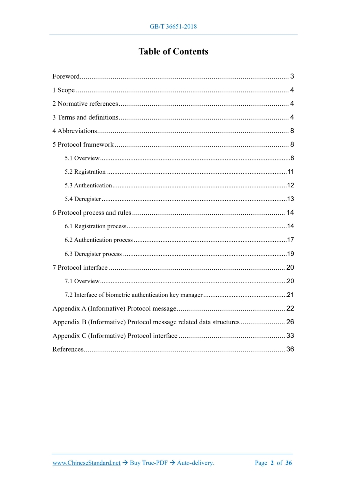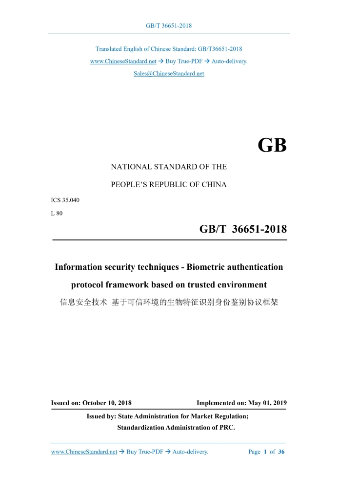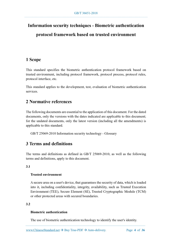 Similar standardsGB/T 36651-2018: Information security techniques - Biometric authentication protocol framework based on trusted environment---This is an excerpt. Full copy of true-PDF in English version (including equations, symbols, images, flow-chart, tables, and figures etc.), auto-downloaded/delivered in 9 seconds, can be purchased online: https://www.ChineseStandard.net/PDF.aspx/GBT36651-2018 NATIONAL STANDARD OF THE PEOPLE’S REPUBLIC OF CHINA ICS 35.040 L 80 Information security techniques - Biometric authentication protocol framework based on trusted environment ISSUED ON: OCTOBER 10, 2018 IMPLEMENTED ON: MAY 01, 2019 Issued by: State Administration for Market Regulation; Standardization Administration of PRC. Table of ContentsForeword ... 3 1 Scope ... 4 2 Normative references ... 4 3 Terms and definitions... 4 4 Abbreviations ... 8 5 Protocol framework ... 8 5.1 Overview ... 8 5.2 Registration ... 11 5.3 Authentication ... 12 5.4 Deregister ... 13 6 Protocol process and rules ... 14 6.1 Registration process ... 14 6.2 Authentication process ... 17 6.3 Deregister process ... 19 7 Protocol interface ... 20 7.1 Overview ... 20 7.2 Interface of biometric authentication key manager ... 21 Appendix A (Informative) Protocol message ... 22 Appendix B (Informative) Protocol message related data structures ... 26 Appendix C (Informative) Protocol interface ... 33 References ... 36 Information security techniques - Biometric authentication protocol framework based on trusted environment1 ScopeThis standard specifies the biometric authentication protocol framework based on trusted environment, including protocol framework, protocol process, protocol rules, protocol interface, etc. This standard applies to the development, test, evaluation of biometric authentication services.2 Normative referencesThe following documents are essential to the application of this document. For the dated documents, only the versions with the dates indicated are applicable to this document; for the undated documents, only the latest version (including all the amendments) is applicable to this standard. GB/T 25069-2010 Information security technology - Glossary3 Terms and definitionsThe terms and definitions as defined in GB/T 25069-2010, as well as the following terms and definitions, apply to this document. 3.1 Trusted environment A secure area on a user's device, that guarantees the security of data, which is loaded into it, including confidentiality, integrity, availability, such as Trusted Execution Environment (TEE), Secure Element (SE), Trusted Cryptographic Module (TCM) or other protected areas with secured boundaries. 3.2 Biometric authentication The use of biometric authentication technology to identify the user's identity. a trust relationship with the relying party. Figure 1 depicts a scenario on the realization of IdP that has a trust relationship with the relying party. The identity authentication server stores the user's authentication public key, which is the authentication public key, as generated by the biometric authentication key manager, when the user registers with the identity authentication server, using the biometric authentication key manager. - The biometric authentication key manager is integrated in the trusted environment; it stores the vendor private key and authentication private key. The authentication private key is the authentication private key, which is generated by the biometric authentication key manager, when the user uses the biometric authentication key manager to register, with the identity authentication server; it is used by the identity authentication server, to authenticate the user's identity. The biometric authentication key manager can interact with multiple biometric matchers. This standard does not specify the specific implementation of the IdP's delivery of the identity authentication protocol message to the biometric authentication key manager. E.g.: When the identity authentication server belongs to an IdP independent of the relying party, the relying party can redirect the user equipment to the identity authentication server, using the redirection mechanism, so that the identity authentication server can directly interact with the user equipment, thereby submitting the identity authentication protocol message to the biometric authentication key manager; when the relying party internally deploys the IdP, it shall guarantee the security of the forwarding information. Any content related to cryptographic algorithms, in this standard, shall be implemented in accordance with relevant national regulations. Those involving the use of cryptographic technology to solve the needs of confidentiality, integrity, authenticity, non-repudiation, must follow the relevant national standards and industry standards for cryptography. The biometric authentication protocol, based on trusted environment, consists of three sessions between biometric authentication key manager and authentication server. Before conducting these three sessions, the identity authentication server checks whether the user equipment supports this protocol, by calling the discovery method. The three sessions are as follows: - Registration: The user registers the authentication public key, which is generated by the biometric authentication key manager, to the identity authentication server; - Authentication: The user uses the registered biometric authentication key manager, for identity authentication; - Deregister: The user will delete the authentication public key, which is registered to the authentication server. authenticity of the identity authentication server. If the verification is passed, the user will be prompted to select an available biometric matcher; otherwise, the message will be rejected. c) The user selects the appropriate biometric matcher; uses the biometric information to unlock the biometric authentication key manager (register if the user has not previously registered biometric info