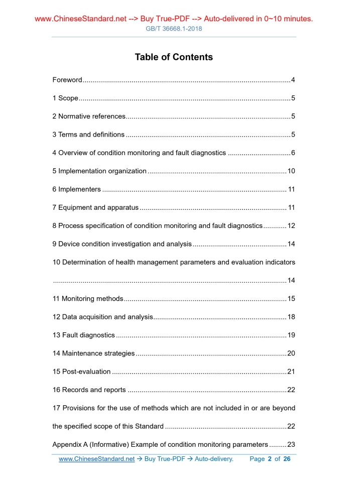 Similar standardsGB/T 36668.1-2018: Condition monitoring and fault diagnostics of amusement device - Part 1: General requirements---This is an excerpt. Full copy of true-PDF in English version (including equations, symbols, images, flow-chart, tables, and figures etc.), auto-downloaded/delivered in 9 seconds, can be purchased online: https://www.ChineseStandard.net/PDF.aspx/GBT36668.1-2018 GB NATIONAL STANDARD OF THE PEOPLE’S REPUBLIC OF CHINA ICS 97.200.40 Y 57 Condition monitoring and fault diagnostics of amusement device - Part 1. General requirements Issued on: SEPTEMBER 28, 2018 Implemented on: APRIL 1, 2019 Issued by. State Administration for Market Regulation; Standardization Administration of the PRC. Table of ContentsForeword ... 4 1 Scope ... 5 2 Normative references ... 5 3 Terms and definitions ... 5 4 Overview of condition monitoring and fault diagnostics ... 6 5 Implementation organization ... 10 6 Implementers ... 11 7 Equipment and apparatus ... 11 8 Process specification of condition monitoring and fault diagnostics ... 12 9 Device condition investigation and analysis ... 14 10 Determination of health management parameters and evaluation indicators ... 14 11 Monitoring methods ... 15 12 Data acquisition and analysis ... 18 13 Fault diagnostics ... 19 14 Maintenance strategies ... 20 15 Post-evaluation ... 21 16 Records and reports ... 22 17 Provisions for the use of methods which are not included in or are beyond the specified scope of this Standard ... 22 Appendix A (Informative) Example of condition monitoring parameters ... 23 Appendix B (Normative) Measuring parameters or techniques which match a fault ... 25 Condition monitoring and fault diagnostics of amusement device - Part 1. General requirements1 ScopeThis Part of GB/T 36668 specifies the general requirements and procedures for condition monitoring and fault diagnostics of amusement device. This Part applies to condition monitoring and fault diagnostics of newly- manufactured and in-use amusement device.2 Normative referencesThe following documents are indispensable for the application of this document. For the dated references, only the editions with the dates indicated are applicable to this document. For the undated references, the latest edition (including all the amendments) are applicable to this document. GB/T 6444 Mechanical vibration - Balancing vocabulary GB/T 9445 Non-destructive testing - Qualification and certification of NDT personnel GB/T 20306 Amusement devices terminology GB/T 20737 Non-destructive testing - General terms and definitions GB/T 20921 Condition monitoring and diagnostics of machines - Vocabulary3 Terms and definitionsThe terms and definitions defined in GB/T 6444, GB/T 20306, GB/T 20737, and GB/T 20921, and the following are applicable to this document. 3.1 Health management of large scale amusement device Through risk analysis, the health risk factors of large scale amusement device are determined; the items and indicators of health management are established. Through various inspection, testing, and monitoring methods, the health information of the device is obtained; its health condition is diagnosed and evaluated; and the unhealth condition found is maintained, repaired, or modified, etc., to eliminate device fault, restore device health, and improve device design. Note. The health management of large scale amusement device is a process of comprehensively managing the health risk factors of large scale amusement device with the aim of preventing and controlling accident occurrence and development, reducing operating cost, and achieving safe, reliable operation and economic coordination and unification of large scale amusement device. 3.2 Baseline One or a set of descriptors which provide a benchmark for the normal condition of each system of amusement device. Note. The baseline is determined in the condition of steady operation of amusement device. 3.3 Baseline data The measured or observed data or data set when the amusement device is in an acceptable and stable operating condition.4 Overview of condition monitoring and faultdiagnostics 4.1 Main content 4.1.1 Condition monitoring is to understand and master the operating condition of amusement device through certain methods; and to use various methods of inspection, testing, monitoring, analysis, and judgement to evaluate whether the current operating condition of amusement device is normal; to make timely alarms for abnormal conditions; and to provide information and data for further fault diagnostics, performance evaluation, etc.. 4.1.2 Fault diagnostics is, based on the information obtained by condition monitoring, combined with the working principle, structural characteristics, operating condition parameters, implementation status of amusement device, to analyze and predict the faults which may occur in the future, and to analyze and judge the faults which have occurred or are occurring, so as to determine the nature, type, degree, position, and trend of the fault. 4.1.3 The purpose of implementing condition monitoring and fault diagnostics is to provide a basis for scientific development of maintenance and repair plans for amusement device, to timely warn potential faults and reduce the possibility of failure, and to prevent accidents. 4.3 Use principles 4.3.1 It shall, according to the material, structure, manufacturing method, use environment, use conditions, and damage mode of the device to be tested, predict the types, shapes, positions, and directions of defects which may occur, and select appropriate monitoring methods. 4.3.2 Acoustic emission method shall be selected for condition monitoring of low-speed rotating installations/components of amusement device. There are temperature changes caused by damage or fault in the mechanical and electrical parts of in-use and in-manufacturing amusement device, infrared thermography method is preferred. The vibration condition monitoring method can be adopted for high speed