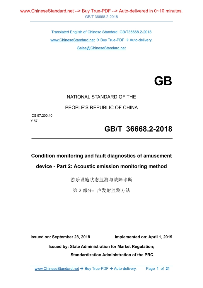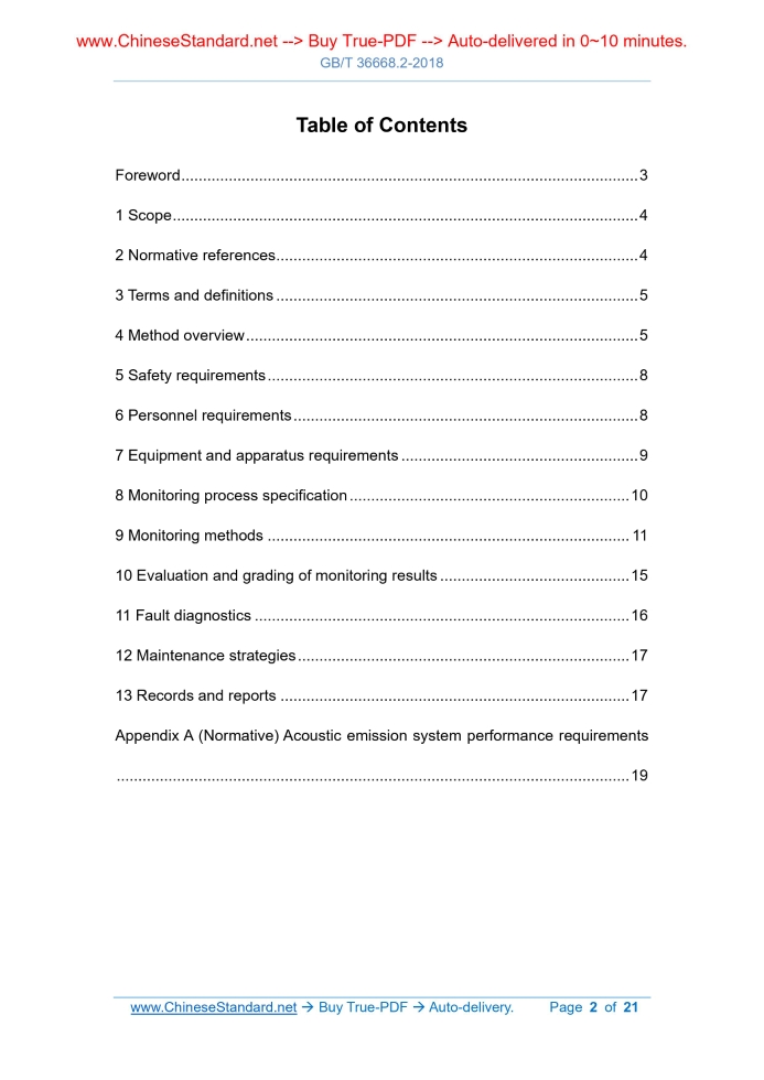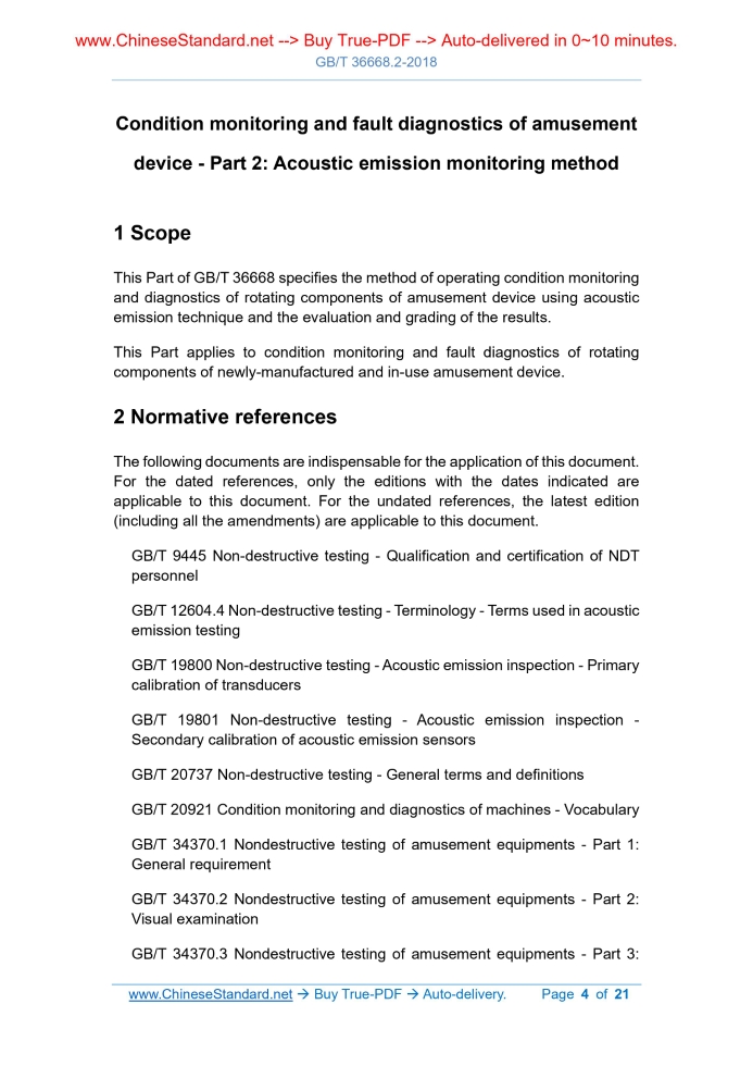 Similar standardsGB/T 36668.2-2018: Condition monitoring and fault diagnostics of amusement device - Part 2: Acoustic emission monitoring method---This is an excerpt. Full copy of true-PDF in English version (including equations, symbols, images, flow-chart, tables, and figures etc.), auto-downloaded/delivered in 9 seconds, can be purchased online: https://www.ChineseStandard.net/PDF.aspx/GBT36668.2-2018 GB NATIONAL STANDARD OF THE PEOPLE’S REPUBLIC OF CHINA ICS 97.200.40 Y 57 Condition monitoring and fault diagnostics of amusement device - Part 2. Acoustic emission monitoring method Issued on: SEPTEMBER 28, 2018 Implemented on: APRIL 1, 2019 Issued by. State Administration for Market Regulation; Standardization Administration of the PRC. Table of ContentsForeword ... 3 1 Scope ... 4 2 Normative references ... 4 3 Terms and definitions ... 5 4 Method overview ... 5 5 Safety requirements ... 8 6 Personnel requirements ... 8 7 Equipment and apparatus requirements ... 9 8 Monitoring process specification ... 10 9 Monitoring methods ... 11 10 Evaluation and grading of monitoring results ... 15 11 Fault diagnostics ... 16 12 Maintenance strategies ... 17 13 Records and reports ... 17 Appendix A (Normative) Acoustic emission system performance requirements ... 19 Condition monitoring and fault diagnostics of amusement device - Part 2. Acoustic emission monitoring method1 ScopeThis Part of GB/T 36668 specifies the method of operating condition monitoring and diagnostics of rotating components of amusement device using acoustic emission technique and the evaluation and grading of the results. This Part applies to condition monitoring and fault diagnostics of rotating components of newly-manufactured and in-use amusement device.2 Normative referencesThe following documents are indispensable for the application of this document. For the dated references, only the editions with the dates indicated are applicable to this document. For the undated references, the latest edition (including all the amendments) are applicable to this document. GB/T 9445 Non-destructive testing - Qualification and certification of NDT personnel GB/T 12604.4 Non-destructive testing - Terminology - Terms used in acoustic emission testing GB/T 19800 Non-destructive testing - Acoustic emission inspection - Primary calibration of transducers GB/T 19801 Non-destructive testing - Acoustic emission inspection - Secondary calibration of acoustic emission sensors GB/T 20737 Non-destructive testing - General terms and definitions GB/T 20921 Condition monitoring and diagnostics of machines - Vocabulary GB/T 34370.1 Nondestructive testing of amusement equipments - Part 1. General requirement GB/T 34370.2 Nondestructive testing of amusement equipments - Part 2. Visual examination GB/T 34370.3 Nondestructive testing of amusement equipments - Part 3. a) vulnerable to attenuation; b) vulnerable to high operating background noise; c) failure to correlate monitored acoustic emission defect characteristics with accurate fault mechanism. 4.4 Interference factors Before performing acoustic emission monitoring, it shall be aware of potential sources of noise, such as electronic noise (electromagnetic and radio frequency interference), airborne noise (air leakage or impact of grains of sand in a windy environment), operating background noise (fluid flow in the tube), and mechanical background noise. Their presence may affect the acoustic emission monitoring results.5 Safety requirementsThis Clause does not list all of the safety requirements for implementation. Users using this Part shall, before implementation, establish safety criterion. Safety requirements during implementation are at least as follows. a) The monitoring personnel shall abide by the safety requirements for the on-site operation of amusement device. The personnel at the monitoring location are required to wear protective overalls and wear relevant protective equipment; b) It shall pay attention to the temperature condition of the device being monitored, to avoid scalds; c) During the monitoring, attention shall be paid to the movement of car during the start and operation of amusement device, to prevent personnel from colliding and obstructing the connection of cable; d) When operating at high altitude, factors such as the fall of personnel, monitoring equipment and apparatus shall be considered. Necessary protective measures shall be taken.6 Personnel requirementsPersonnel who use this Part for monitoring shall, in accordance with the requirements of GB/T 9445 or the regulations of the relevant competent department, obtain the grade qualification certificate of acoustic emission testing and monitoring issued or recognized by the corresponding agency for8 Monitoring process specification8.1 General monitoring process specification Organizations engaged in acoustic emission monitoring shall, in accordance with the requirements of this Part, develop general acoustic emission monitoring process specification. Its contents shall include at least the following elements. a) scope of application; b) referenced standards and regulations; c) qualifications of implementers; d) monitoring instruments and equipment. coupling agent, sensor, sensor fixture, signal line, preamplifier, cable, instrument host, monitoring data acquisition and analysis software, etc.; e) information about the device and components being monitored. name, type, number, structural style, dimensions, installation location, design and operating parameters; f) installation position and installation mode of sensor; g) operating conditions and timing of monitoring; h) sensitivity measurement; i) monitoring process and data analysis and interpretation; j) evaluation of monitoring results; k) monitoring records, reports, and data archiving; l) personnel of development, review, and approval; m) date of development. 8.2 Monitoring work instruction or process card For each monitored component or each set of monitored devic