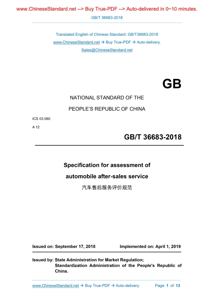 GB/T 36683-2018: Specification for assessment of automobile after-sales service Delivery: 9 seconds. True-PDF full-copy in English & invoice will be downloaded + auto-delivered via email. See step-by-step procedure Status: Valid