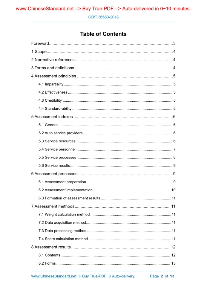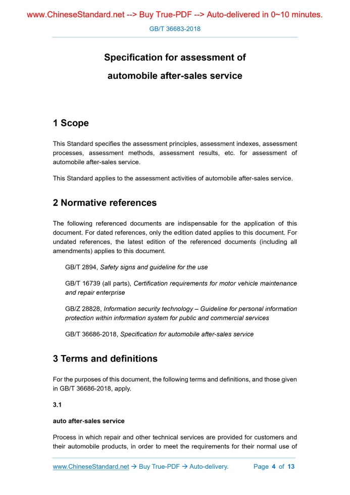 Similar standardsGB/T 36683-2018: Specification for assessment of automobile after-sales service---This is an excerpt. Full copy of true-PDF in English version (including equations, symbols, images, flow-chart, tables, and figures etc.), auto-downloaded/delivered in 9 seconds, can be purchased online: https://www.ChineseStandard.net/PDF.aspx/GBT36683-2018GB NATIONAL STANDARD OF THE PEOPLE’S REPUBLIC OF CHINA ICS 03.080 A 12 Specification for assessment of automobile after-sales service Issued on: SEPTEMBER 17, 2018 Implemented on: APRIL 1, 2019 Issued by. State Administration for Market Regulation; Standardization Administration of the People's Republic of China. Table of ContentsForeword ... 3 1 Scope ... 4 2 Normative references ... 4 3 Terms and definitions ... 4 4 Assessment principles ... 5 4.1 Impartiality ... 5 4.2 Effectiveness ... 5 4.3 Credibility ... 5 4.4 Standard-ability ... 5 5 Assessment indexes ... 6 5.1 General ... 6 5.2 Auto service providers ... 6 5.3 Service resources ... 6 5.4 Service personnel ... 7 5.5 Service processes ... 8 5.6 Service results ... 9 6 Assessment processes ... 9 6.1 Assessment preparation ... 9 6.2 Assessment implementation ... 10 6.3 Formation of assessment results ... 11 7 Assessment methods ... 11 7.1 Weight calculation method ... 11 7.2 Data acquisition method ... 11 7.3 Data processing method ... 11 7.4 Score calculation method ... 11 8 Assessment results ... 12 8.1 Contents ... 12 8.2 Forms ... 13 Specification for assessment of automobile after-sales service1 ScopeThis Standard specifies the assessment principles, assessment indexes, assessment processes, assessment methods, assessment results, etc. for assessment of automobile after-sales service. This Standard applies to the assessment activities of automobile after-sales service.2 Normative referencesThe following referenced documents are indispensable for the application of this document. For dated references, only the edition dated applies to this document. For undated references, the latest edition of the referenced documents (including all amendments) applies to this document. GB/T 2894, Safety signs and guideline for the use GB/T 16739 (all parts), Certification requirements for motor vehicle maintenance and repair enterprise GB/Z 28828, Information security technology – Guideline for personal information protection within information system for public and commercial services GB/T 36686-2018, Specification for automobile after-sales service3 Terms and definitionsFor the purposes of this document, the following terms and definitions, and those given in GB/T 36686-2018, apply. 3.1 auto after-sales service Process in which repair and other technical services are provided for customers and their automobile products, in order to meet the requirements for their normal use of automobile products. [GB/T 36686-2018, definition 3.1] 3.2 customer Organization or person who accept automobile after-sales service (3.1). 3.3 assessment participant Automobile service provider who is assessed. 3.4 assessor Organization or person who assesses the performance of assessment participants (3.3) in assessment activities.4 Assessment principles4.1 Impartiality The assessment activities of assessor shall be impartial. Assessment results shall not be affected by factors of assessment activities, such as implementation difficulties and whether they are charged or not. 4.2 Effectiveness Assessor shall be responsible for proper formulation and effective implementation of assessment schemes, accurate assessment of the true level of automobile after-sales service, and identification of real problems. 4.3 Credibility Assessor shall collect and use authentic, objective data; assessment results shall reflect assessment activities objectively and accurately, without errors, which are credible. 4.4 Standard-ability Assessment activities shall meet the requirements of assessment schemes, avoiding mistakes and reducing errors. 6.1.2 Determination of assessment scopes Assessor shall determine the scopes of assessment activities, i.e. the contents of assessment activities of assessment objects. 6.1.3 Determination of assessment intervals Assessor shall determine the time intervals of assessment activities, i.e. the sampling intervals of data used in assessment activities. 6.1.4 Preparation of assessment schemes 6.1.4.1 Assessor shall determine implementation procedures, time arrangements, assessment methods, etc., and prepare assessment schemes, according to assessment purposes and the other characteristics of assessment activities. 6.1.4.2 Assessor shall demonstrate and optimize assessment schemes in terms of operability, economic efficiency, scientific, effectiveness and so on. 6.1.4.3 Assessor can disclose assessment schemes or their parts within certain limits based on actual demands. 6.2 Assessment implementation 6.2.1 Establishment of assessment index systems 6.2.1.1 Assessor shall select appropriate assessment indexes from 5.2 ~ 5.6 and combine, cut and refine them, in accordance with assessment purposes, assessment schemes, characteristics of assessment participants, etc. 6.2.1.2 If necessary, assessment indexes not listed in 5.2 ~ 5.6 can be supplement according to the actual requirements of assessment activities. 6.2.1.3 Assessor shall select an appropriate weight calculation method to weight the above-mentioned assessment indexes, forming an assessment index system. 6.2.2 Acquisition and processing of data 6.2.2.1 Assessor shall determine the scopes, time intervals and methods for data acquisition, acquire data and carry out quality evaluation for data acquired, in accordance with assessment schemes. NOTE 1. If necessary, multiple times of acquisition or supplementary acquisition can be carried out. NOTE 2. Quality evaluation generally includes evaluation in data comprehensiveness, accuracy, consistency, correlation and so on. mathematical mean method, summation method, de-extremum method and so on.8 Assess