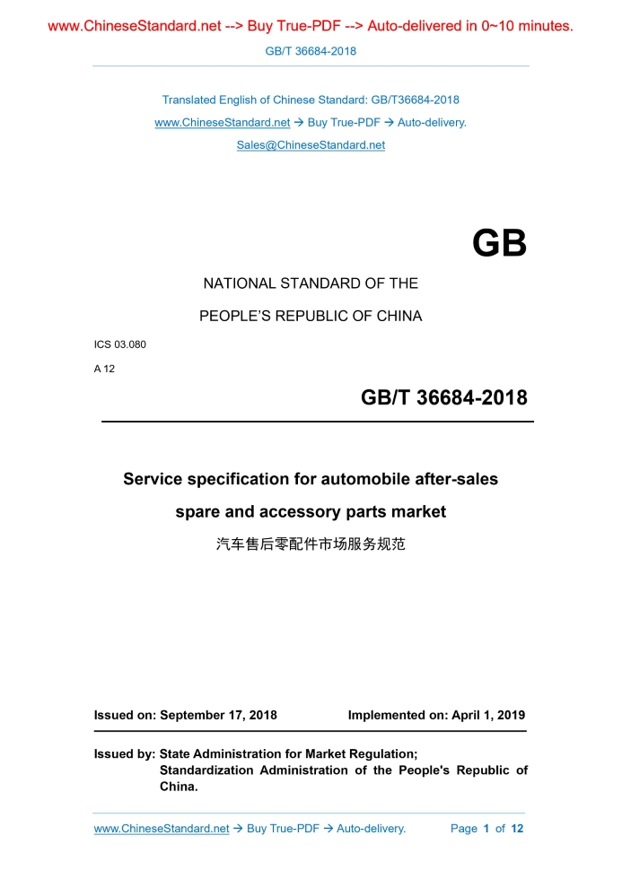 GB/T 36684-2018: Service specification for automobile after-sales spare and accessory parts market Delivery: 9 seconds. True-PDF full-copy in English & invoice will be downloaded + auto-delivered via email. See step-by-step procedure Status: Valid