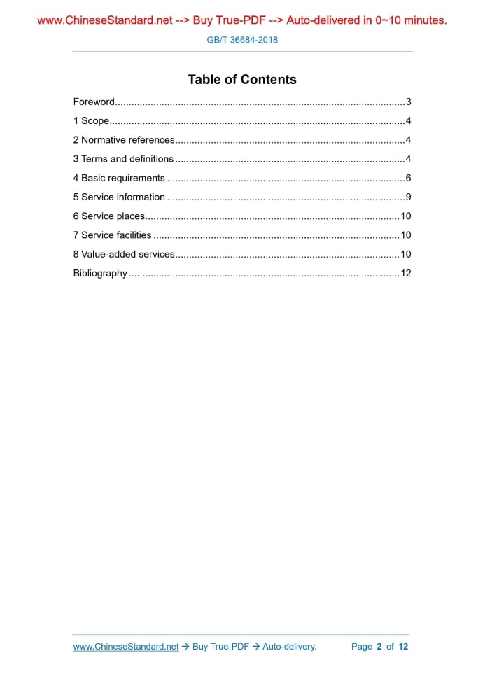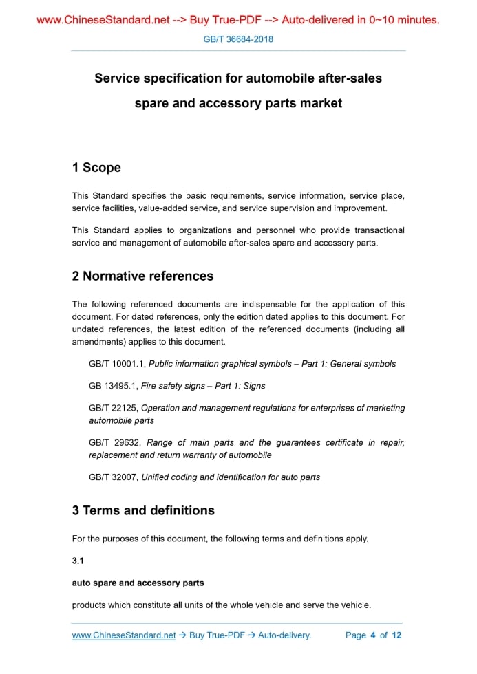 Similar standardsGB/T 36684-2018: Service specification for automobile after-sales spare and accessory parts market---This is an excerpt. Full copy of true-PDF in English version (including equations, symbols, images, flow-chart, tables, and figures etc.), auto-downloaded/delivered in 9 seconds, can be purchased online: https://www.ChineseStandard.net/PDF.aspx/GBT36684-2018 GB NATIONAL STANDARD OF THE PEOPLE’S REPUBLIC OF CHINA ICS 03.080 A 12 Service specification for automobile after-sales spare and accessory parts market Issued on: SEPTEMBER 17, 2018 Implemented on: APRIL 1, 2019 Issued by. State Administration for Market Regulation; Standardization Administration of the People's Republic of China. Table of ContentsForeword ... 3 1 Scope ... 4 2 Normative references ... 4 3 Terms and definitions ... 4 4 Basic requirements ... 6 5 Service information ... 9 6 Service places ... 10 7 Service facilities ... 10 8 Value-added services ... 10 Bibliography ... 12 Service specification for automobile after-sales spare and accessory parts market1 ScopeThis Standard specifies the basic requirements, service information, service place, service facilities, value-added service, and service supervision and improvement. This Standard applies to organizations and personnel who provide transactional service and management of automobile after-sales spare and accessory parts.2 Normative referencesThe following referenced documents are indispensable for the application of this document. For dated references, only the edition dated applies to this document. For undated references, the latest edition of the referenced documents (including all amendments) applies to this document. GB/T 10001.1, Public information graphical symbols – Part 1. General symbols GB 13495.1, Fire safety signs – Part 1. Signs GB/T 22125, Operation and management regulations for enterprises of marketing automobile parts GB/T 29632, Range of main parts and the guarantees certificate in repair, replacement and return warranty of automobile GB/T 32007, Unified coding and identification for auto parts3 Terms and definitionsFor the purposes of this document, the following terms and definitions apply. 3.1 auto spare and accessory parts products which constitute all units of the whole vehicle and serve the vehicle. In order to meet the requirements of consumers, automobile after-sales spare and accessory parts distributor shall meet the following requirements. a) parts sold shall be marked with original, product name, agency (dealer), certificate of compliance, etc., which are as required by GB/T 32007. They shall meet relevant national product quality requirements. The exterior and interior package shall be intact. The accessories shall be complete. The data including instructions and warranty cards shall be complete; b) it shall provide the free maintenance service within the period of “three- guarantees” and the charged repair service beyond the period of “three- guarantees”. The range of parts for maintenance service shall be as specified in GB/T 29632; c) an open, transparent and reasonable price system shall be implemented, explaining clearly the types of parts, such as original parts, equivalent quality, remanufactured parts, reuse parts, etc.; d) the provisions shall be indicated clearly including quality guarantee and warranty service, and technique, quality, service specifications, etc. of after-sales service which consumers need to know; e) if installation maintenance service is provided, automobile parts shall be installed, maintained and replaced correctly. The service process shall be open and transparent. The whole process should be monitored; f) quality warranty commitments shall be honored and corresponding after-sales service provided; g) the quality and origin of parts sold should be monitored to achieve the whole- process traceability; h) when automobile parts do not meet quality requirements, they shall be returned or replaced in accordance with national regulations. When there is an agreement between two sides, it shall be implemented as agreed. 4.5.2 Maintenance service requirements Maintenance service providers of automobile after-sales spare and accessory parts provide maintenance services, which shall meet the following requirements. a) the automobile after-sales spare and accessory parts provided by consumers shall not be replaced during maintenance; b) parts shall be installed and maintained correctly. The service process shall be open and transparent. The whole service process should be monitored;6 Service places6.1 Trading place of automobile after-sales spare and accessory parts shall have a certain scale of business place and should be provided with a ground- or underground- parking lot. 6.2 Service place shall be clean and safe; automobile spare and accessory parts shall be stored in different areas; fire passages and human-goods passages shall be unblocked and well arranged. 6.3 Information guide signs, functional division signs, warning signs and safety signs shall be provided at conspicuous locations of service place; the design of signs and marks shall be as specified in GB/T 10001.1 and GB 13495.1. 6.4 Advertising boards and bulletins shall be provided at conspicuous locations such as automobile parts sales website or service place, to publicize relevant information concerning sales to consumers. 6.5 No activity or behavior influencing normal operation shall be carried out in service place to ensure the operating behavior is in good order.7 Service facilities7.1 Service place shall be provided with complete service facilities for the use of automobile spare and accessory parts, such as automobile brake systems, electric instrument systems, body and accessory systems and so on. 7.2 Automobile spare and accessory parts enterprises shall provide measuring instruments which comply with national regulations; they shall be submitted to an accrediting body for testing and calibration at fixed per