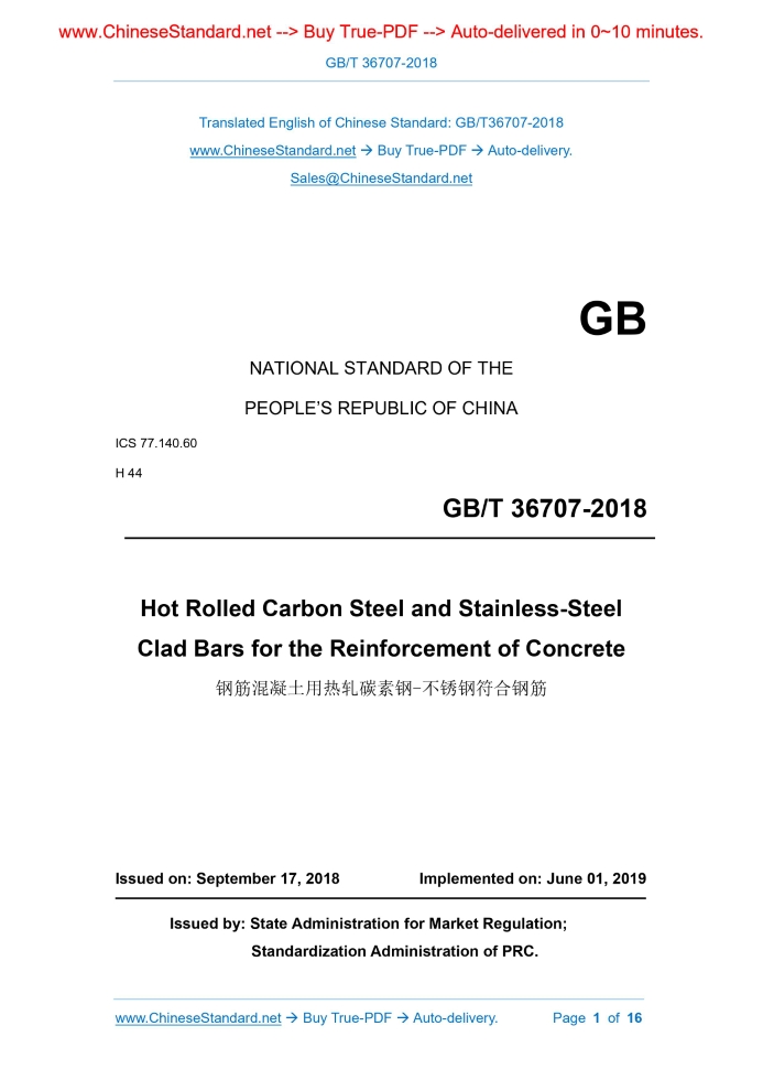 GB/T 36707-2018: Hot Rolled Carbon Steel and Stainless-Steel Clad Bars for the Reinforcement of Concrete Delivery: 9 seconds. True-PDF full-copy in English & invoice will be downloaded + auto-delivered via email. See step-by-step procedure Status: Valid
