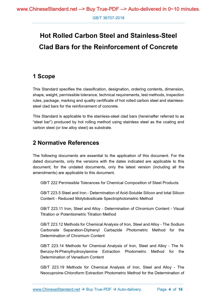 Similar standardsGB/T 36707-2018: Hot Rolled Carbon Steel and Stainless-Steel Clad Bars for the Reinforcement of Concrete---This is an excerpt. Full copy of true-PDF in English version (including equations, symbols, images, flow-chart, tables, and figures etc.), auto-downloaded/delivered in 9 seconds, can be purchased online: https://www.ChineseStandard.net/PDF.aspx/GBT36707-2018 GB NATIONAL STANDARD OF THE PEOPLE’S REPUBLIC OF CHINA ICS 77.140.60 H 44 Hot Rolled Carbon Steel and Stainless-Steel Clad Bars for the Reinforcement of Concrete Issued on: SEPTEMBER 17, 2018 Implemented on: JUNE 01, 2019 Issued by. State Administration for Market Regulation; Standardization Administration of PRC. Table of ContentsForeword ... 3 1 Scope ... 4 2 Normative References ... 4 3 Terms and Definitions ... 7 4 Classification and Designation ... 7 5 Ordering Contents... 8 6 Dimension, Shape, Weight and Permissible Tolerance ... 8 7 Technical Requirements ... 9 8 Test Methods ... 12 9 Inspection Rules ... 15 10 Package, Marking and Quality Certificate ... 16 Hot Rolled Carbon Steel and Stainless-Steel Clad Bars for the Reinforcement of Concrete1 ScopeThis Standard specifies the classification, designation, ordering contents, dimension, shape, weight, permissible tolerance, technical requirements, test methods, inspection rules, package, marking and quality certificate of hot rolled carbon steel and stainless- steel clad bars for the reinforcement of concrete. This Standard is applicable to the stainless-steel clad bars (hereinafter referred to as “steel bar”) produced by hot rolling method using stainless steel as the coating and carbon steel (or low alloy steel) as substrate.2 Normative ReferencesThe following documents are essential to the application of this document. For the dated documents, only the versions with the dates indicated are applicable to this document; for the undated documents, only the latest version (including all the amendments) are applicable to this document. GB/T 222 Permissible Tolerances for Chemical Composition of Steel Products GB/T 223.5 Steel and Iron - Determination of Acid-Soluble Silicon and total Silicon Content - Reduced Molybdosilicate Spectrophotometric Method GB/T 223.11 Iron, Steel and Alloy - Determination of Chromium Content - Visual Titration or Potentiometric Titration Method GB/T 223.12 Methods for Chemical Analysis of Iron, Steel and Alloy - The Sodium Carbonate Separation-Diphenyl Carbazide Photometric Method for the Determination of Chromium Content GB/T 223.14 Methods for Chemical Analysis of Iron, Steel and Alloy - The N- Benzoy-N-Phenylhydroxylamine Extraction Photometric Method for the Determination of Vanadium Content GB/T 223.19 Methods for Chemical Analysis of Iron, Steel and Alloy - The Neocuproine-Chloroform Extraction Photometric Method for the Determination of GB/T 223.69 Iron, Steel and Alloy-Determination of Carbon Contents- Gas- volumetric Method after Combustion in the Pipe Furnace GB/T 223.71 Methods for Chemical Analysis of Iron, Steel and Alloy - the Gravimetric Method after Combustion in the Pipe Furnace for the Determination of Carbon Content GB/T 223.72 Iron, Steel and Alloy - Determination of Sulfur Content - Gravimetric Method GB/T 223.85 Steel, Iron and Steel - Determination of Sulfur Content - Infrared Absorption Method after Combustion in an Induction Furnace GB/T 223.86 Steel, Iron and Steel - Determination of Total Carbon Content - Infrared Absorption Method after Combustion in an Induction Furnace GB/T 1499.1 Steel for the Reinforcement of Concrete - Part 1. Hot Rolled Plain Bars GB/T 1499.2 Steel for the Reinforcement of Concrete - Part 2. Hot Rolled Ribbed Bars GB/T 2101 General Requirement of Acceptance Packaging Marking and Certification for Section Steel GB/T 4334-2008 Corrosion of Metals and Alloys - Test Methods for Intergranular Corrosion of Stainless Steels GB/T 4336 Carbon and Low-Alloy Steel - Determination of Multi-Element Contents -Spark Discharge Atomic Emission Spectrometric Method (Routine Method) GB/T 6462 Metallic and Oxide Coatings - Measurement of Coating Thickness- Microscopical Method GB/T 11170 Stainless Steel – Determination of Multi-Element Contents - Spark Discharge Atomic Emission Spectrometric Method (Routine Method) GB/T 17359 Microbeam Analysis - Quantitative Analysis Using Energy Dispersive Spectrometry GB/T 17505 Steel and Steel Products - General Technical Delivery Requirements GB/T 20066 Steel and Iron - Sampling and Preparation of Samples for the Determination of Chemical Composition GB/T 20123 Steel and Iron - Determination of Total Carbon and Sulfur Content Infrared Absorption Method after Combustion in an Induction Furnace (Routine 7.6 Corrosion resistance Except for the ferrite-type coated steel bar, other coated steel bars can be carried out intergranular corrosion test by the delivery status as per the Method E specified in GB/T 4334-2008. When testing, the transverse sections of both ends of the steel bar shall be applied the protective layer (such as epoxy resin). The test results, except for the transverse sections, shall be that the steel bar surface is free from leakage points and intergranular corrosion cracks caused by the corrosion. 7.7 Steel bar connection The steel bars shall be mechanically connected; the joints shall be made of the materials that are anti-corrosive and match the strength level of the steel bar. 7.8 Surface quality 7.8.1 The stainless-steel coating of the steel bar shall completely cover the substrate; except for the transverse sections on both sides of the steel bar, its exterior surface shall be free of visible uncovered positions. 7.8.2 The surface of the steel bar shall not have any defects that may affect the use performance. 7.9 Delivery status and type 7.9.1 Steel bar shall be delivered in hot-rolled pickling conditions. 7.9.2 The plain steel bar can be delivered in straight strip or coil condition. The ribbed steel bar is generally delivered in s