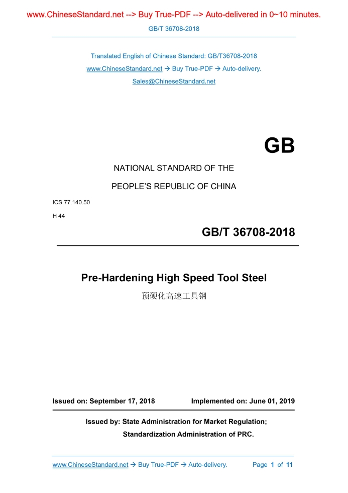 GB/T 36708-2018: Pre-Hardening High Speed Tool Steel Delivery: 9 seconds. True-PDF full-copy in English & invoice will be downloaded + auto-delivered via email. See step-by-step procedure Status: Valid