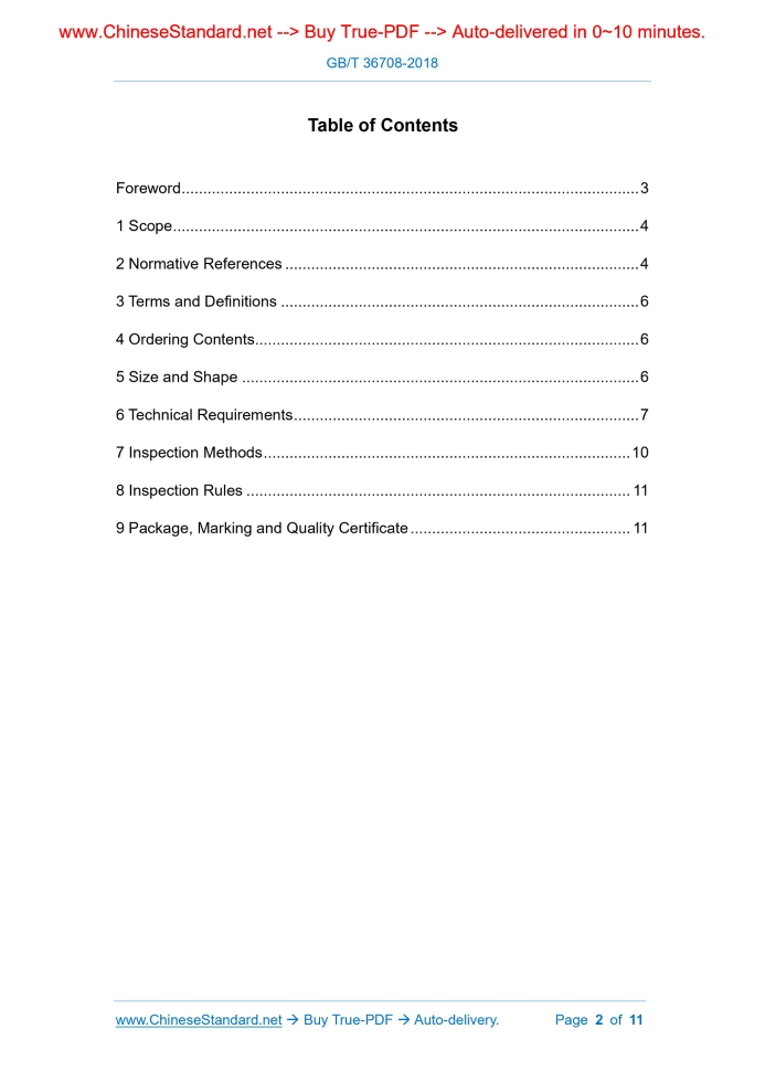 Similar standardsGB/T 36708-2018: Pre-Hardening High Speed Tool Steel---This is an excerpt. Full copy of true-PDF in English version (including equations, symbols, images, flow-chart, tables, and figures etc.), auto-downloaded/delivered in 9 seconds, can be purchased online: https://www.ChineseStandard.net/PDF.aspx/GBT36708-2018GB NATIONAL STANDARD OF THE PEOPLE’S REPUBLIC OF CHINA ICS 77.140.50 H 44 Pre-Hardening High Speed Tool Steel Issued on: SEPTEMBER 17, 2018 Implemented on: JUNE 01, 2019 Issued by. State Administration for Market Regulation; Standardization Administration of PRC. Table of ContentsForeword ... 3 1 Scope ... 4 2 Normative References ... 4 3 Terms and Definitions ... 6 4 Ordering Contents... 6 5 Size and Shape ... 6 6 Technical Requirements ... 7 7 Inspection Methods ... 10 8 Inspection Rules ... 11 9 Package, Marking and Quality Certificate ... 11ForewordThis Standard was drafted as per the rules specified in GB/T 1.1-2009. This Standard was proposed by China Iron and Steel Industry Association. This Standard shall be under the jurisdiction of National Technical Committee for Standardization of Steel (SAC/TC 183). Drafting organizations of this Standard. Heye Special Steel Co., Ltd.; Yantai Better Alloy Material Manufacturing Co., Ltd.; Shijiazhuang Jinfeng Special Steel Products Co., Ltd.; Shanghai Tool Works Co., Ltd.; and China Metallurgical Information and Standardization Institute. Chief drafting staffs of this Standard. Zhang Beibei, Yao Fengchen, Wang Jianhua, Zhu Xinfa, Dai Qiang, Yan Chengming, and Wu Lizhi. Pre-Hardening High Speed Tool Steel1 ScopeThis Standard specifies the hardness, size, shape, technical requirements, test methods, inspection rules, package, marking and quality certificate, etc. of the pre- hardening high-speed tool steel bars and wires. This Standard is applicable to the pre-hardening high-speed tool steel bars and wires (hereinafter referred to as steel) with a diameter of 1.0mm~15.0mm, and polishing or cold drawing surface.2 Normative ReferencesThe following documents are essential to the application of this document. For the dated documents, only the versions with the dates indicated are applicable to this document; for the undated documents, only the latest version (including all the amendments) are applicable to this document. GB/T 223.5 Steel and Iron - Determination of Acid-Soluble Silicon and total Silicon Content - Reduced Molybdosilicate Spectrophotometric Method GB/T 223.8 Methods for Chemical Analysis of Iron, Steel and Alloy - The Sodium Fluoride Separation-EDTA Titration Method for the Determination of Aluminum Content GB/T 223.11 Iron, Steel and Alloy - Determination of Chromium Content - Visual Titration or Potentiometric Titration Method GB/T 223.13 Methods for Chemical Analysis of Iron, Steel and Alloy - The Ammonium Ferrous Sulfate Titration Method for the Determination of Vanadium Content GB/T 223.19 Methods for Chemical Analysis of Iron, Steel and Alloy - The Neocuproine-Chloroform Extraction Photometric Method for the Determination of Copper Content GB/T 223.22 Methods for Chemical Analysis of Iron, Steel and Alloy - The Nitroso- R-Salt Spectrophotometric Method for the Determination of Cobalt Content GB/T 223.23 Iron, Steel and Alloy - Determination of Nickel Content - The Dimethylglyoxime Spectrophotometric Method GB/T 223.26 Iron, Steel and Alloy - Determination of Molybdenum Content - The Thiocyanate Spectrophotometric Method GB/T 223.43 Iron, Steel and Alloy - Determination of Tungsten Content - Gravimetry Method and Spectrophotometric Method GB/T 223.59 Iron, Steel and Alloy - Determination of Phosphorus Content - Bismuth Phosphomolybdate Blue Spectrophotometric Method and Antimony Phosphomolybdate Blue Spectrophotometric Method GB/T 223.63 Methods for Chemical Analysis of Iron, Steel and Alloy - The Sodium (Potassium) Periodate Photometric Method for the Determination of Manganese Content GB/T 223.68 Methods for Chemical Analysis of Iron, Steel and Alloy - The Potassium Iodate Titration Method after Combustion in the Pipe Furnace for the Determination of Sulfur Content GB/T 223.69 Iron, Steel and Alloy-Determination of Carbon Contents- Gas- volumetric Method after Combustion in the Pipe Furnace GB/T 224 Determination of Depth of Decarburization of Steels GB/T 230.1 Metallic Materials - Rockwell Hardness Test - Part 1. Test Method GB/T 2101 General Requirement of Acceptance Packaging Marking and Certification for Section Steel GB/T 2103 General Requirements for Acceptance, Packing, Marking and Quality Certification of Steel Wire GB/T 4336 Carbon and Low-Alloy Steel - Determination of Multi-Element Contents -Spark Discharge Atomic Emission Spectrometric Method (Routine Method) GB/T 4340.1 Metallic Materials - Vickers Hardness Test - Part 1. Test Method GB/T 9943 High-Speed Tool Steel GB/T 17505 Steel and Steel Products - General Technical Delivery Requirements GB/T 20066 Steel and Iron - Sampling and Preparation of Samples for the Determination of Chemical Composition GB/T 20123 Steel and Iron - Determination of Total Carbon and Sulfur Content Infrared Absorption Method after Combustion in an Induction Furnace (Routine Table 6 – Qualification Level of Heat-Treatment Metallurgical Structure 6.6 Surface quality 6.6.1 The surface of the polished steel shall be clean and bright; be free of cracks, hair lines, concave surfaces, scratches, black spots, crusting, folding or the like defects. 6.6.2 The surface of the unpolished steel shall be smooth; be free of cracks, crusting, folding, drawing-cracks, or the like defects. The oxide film (no shedding), individual pitting, scratches, pits and the like defects with depth not exceeding half the nominal diameter are allowed to exist. The spiral patterns not exceeding the permissible tolerance of the nominal diameter are allowed to exist. The ends shall not have burrs.7 Inspection Methods7.1 The test methods for various inspection items of the steel shall conform to