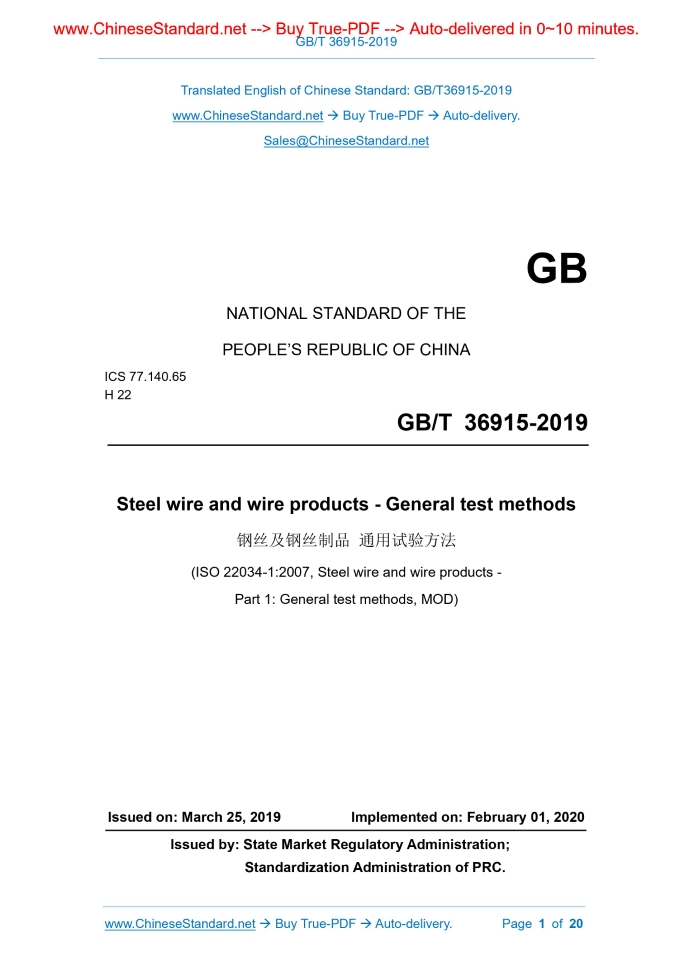 GB/T 36915-2019: Steel wire and wire products - General test methods Delivery: 9 seconds. True-PDF full-copy in English & invoice will be downloaded + auto-delivered via email. See step-by-step procedure Status: Valid