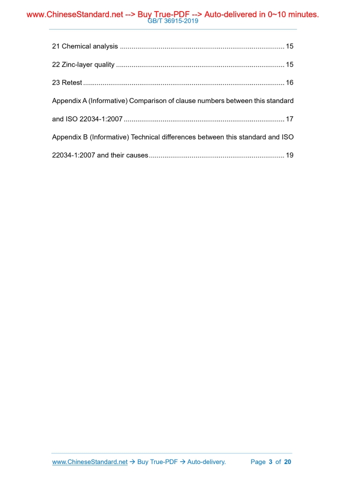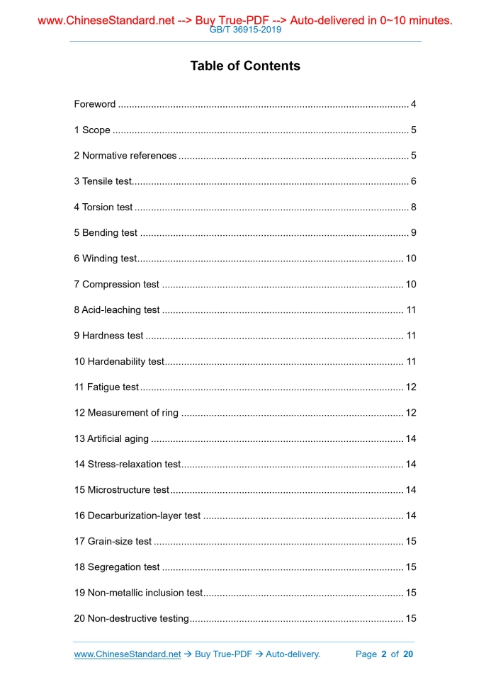 Similar standardsGB/T 36915-2019: Steel wire and wire products - General test methods---This is an excerpt. Full copy of true-PDF in English version (including equations, symbols, images, flow-chart, tables, and figures etc.), auto-downloaded/delivered in 9 seconds, can be purchased online: https://www.ChineseStandard.net/PDF.aspx/GBT36915-2019NATIONAL STANDARD OF THE PEOPLE’S REPUBLIC OF CHINA ICS 77.140.65 H 22 Steel wire and wire products - General test methods (ISO 22034-1:2007, Steel wire and wire products - Part 1: General test methods, MOD) ISSUED ON: MARCH 25, 2019 IMPLEMENTED ON: FEBRUARY 01, 2020 Issued by: State Market Regulatory Administration; Standardization Administration of PRC. Table of ContentsForeword ... 4 1 Scope ... 5 2 Normative references ... 5 3 Tensile test ... 6 4 Torsion test ... 8 5 Bending test ... 9 6 Winding test ... 10 7 Compression test ... 10 8 Acid-leaching test ... 11 9 Hardness test ... 11 10 Hardenability test ... 11 11 Fatigue test ... 12 12 Measurement of ring ... 12 13 Artificial aging ... 14 14 Stress-relaxation test ... 14 15 Microstructure test ... 14 16 Decarburization-layer test ... 14 17 Grain-size test ... 15 18 Segregation test ... 15 19 Non-metallic inclusion test ... 15 20 Non-destructive testing ... 15 21 Chemical analysis ... 15 22 Zinc-layer quality ... 15 23 Retest ... 16 Appendix A (Informative) Comparison of clause numbers between this standard and ISO 22034-1:2007 ... 17 Appendix B (Informative) Technical differences between this standard and ISO 22034-1:2007 and their causes ... 19ForewordThis standard was drafted in accordance with the rules given in GB/T 1.1-2009. This standard uses the redrafting method to modify and use ISO 22034-1:2007 “Steel wire and wire products - Part 1: General test methods”. As compared with ISO 22034-1:2007, this standard has structural adjustments. Appendix A lists the comparison of clause numbers between this standard and ISO 22034-1:2007. There are technical differences between this standard and ISO 22034-1:2007. The terms involved in these differences have been marked by a vertical single line (|) in the blank position of the outer margin. Appendix B gives the corresponding technical differences and their causes. This standard also made the following editorial changes: - CHANGE the standard name to “Steel wire and wire products - General test methods”. This standard was proposed by the China Iron and Steel Association. This standard shall be under the jurisdiction of the National Steel Standardization Technical Committee (SAC/TC 183). Drafting organizations of this standard: National Wire Rope Product Quality Supervision and Inspection Center, Guangdong Jianlang Hardware Products Co., Ltd., Jiangsu Shenyuan Group Co., Ltd., Shandong Daye Co., Ltd., Nantong Songcheng Industrial Co., Ltd., Metallurgical Industry Information Standards Institute. The main drafters of this standard: Chen Jianhao, Wu Peng, Ren Cuiying, Wang Lingjun, Han Kun, Zhang Guofu, Chen Ziwang, Li Wenjun, Lu Yafei, Tu Yuguo, Mao Liuquan, Leng Mingjian. Steel wire and wire products - General test methods1 ScopeThis standard specifies the tensile test, torsion test, bending test, winding test, compression test, acid-leaching test, hardness test, hardenability test, fatigue test, ring-shape measurement, artificial aging, stress-relaxation test, microstructure test, decarburization layer test, grain size test, segregation test, non-metallic inclusion test, non-destructive testing, chemical analysis, zinc- layer quality, retest, other general test methods of steel wire and wire products. This standard applies to cold-worked steel wire with constant cross-section (circular or profiled), annealed steel wire, quenched and tempered steel wire, coated steel wire, etc.2 Normative referencesThe following documents are essential to the application of this document. For the dated documents, only the versions with the dates indicated are applicable to this document; for the undated documents, only the latest version (including all the amendments) are applicable to this standard. GB/T 224 Determination of depth of decarburization of steels (GB/T 224- 2008, ISO 3887:2003, MOD) GB/T 228.1 Metallic materials - Tensile testing - Part 1: Method of test at room temperature (GB/T 228.1-2010, ISO 6892-1:2009, MOD) GB/T 230.1 Metallic materials - Rockwell hardness test - Part 1: Test method (GB/T 230.1-2018, ISO 6508-1:2016, MOD) GB/T 231.1 Metallic materials-Brinell hardness test - Part 1: Test method (GB/T 231.1-2018, ISO 6506-1:2014, MOD) GB/T 232 Metallic materials - Bend test (GB/T 232-2010, ISO 7438:2005, MOD) GB/T 238 Metallic materials - Wire - Reverse bend test (GB/T 238-2013, ISO 7801: 1984, MOD) GB/T 239.1 Metallic materials - Wire - Part 1: Simple torsion test (GB/T 239.1-2012, ISO 7800:2003, MOD) GB/T 239.2 Metallic materials - Wire - Part 2: Reverse torsion test (GB/T 239.2-2012, ISO 9649:1990, MOD) GB/T 1839 Test method for gravimetric determination of the mass per unit area of galvanized coatings on steel products (GB/T 1839-2008, ISO 1460:1992, MOD) GB/T 2103 General requirements for acceptance, packing, marking and quality certification of steel wire GB/T 2972 Test method for uniformity of zinc coating on zinc-coated steel wire by the copper sulphate dip (GB/T 2972-2016, ISO 7989-2:2007, NEQ) GB/T 2975 Steel and steel products - Location and preparation of samples and test pieces for mechanical testing (GB/T 2975-2018, ISO 377:2017, MOD) GB/T 2976 Metallic materials - Wire - Wrapping test (GB/T 2976-2004, ISO 7802:1983, IDT) GB/T 4337 Metallic materials - Fatigue testing - Rotating bar bending method (GB/T 4337-2015, ISO 1143:2010, MOD) GB/T 4340.1 Metallic materials - Vickers hardness test - Part 1: Test method (GB/T 4340.1-2009, ISO 6507-1: 2005, MOD) GB/T 6394 Metal - Methods for estimating the average grain size GB/T 10561 Steel - Determination of Content of Nonmetallic Inclusions - Micrographic Method Using Standards Diag