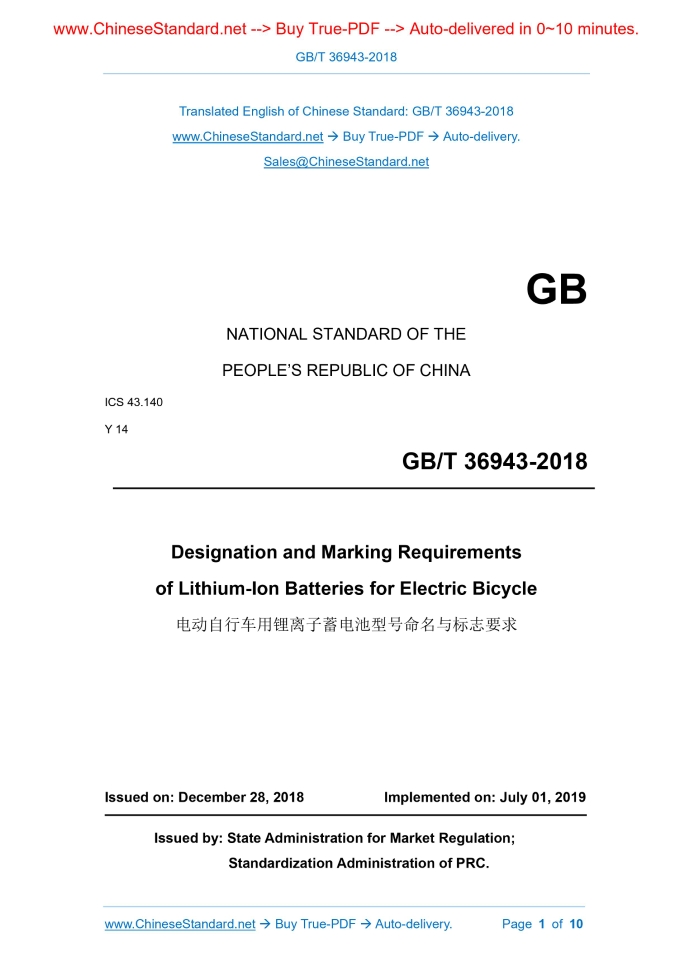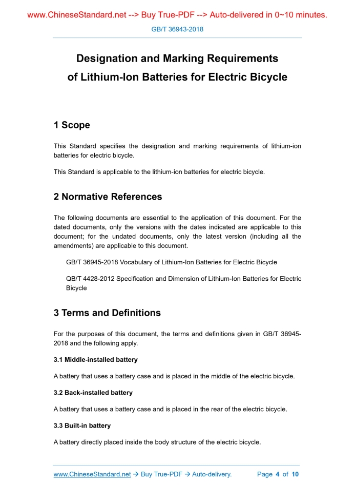 Similar standardsGB/T 36943-2018: Designation and Marking Requirements of Lithium-Ion Batteries for Electric Bicycle---This is an excerpt. Full copy of true-PDF in English version (including equations, symbols, images, flow-chart, tables, and figures etc.), auto-downloaded/delivered in 9 seconds, can be purchased online: https://www.ChineseStandard.net/PDF.aspx/GBT36943-2018 NATIONAL STANDARD OF THE PEOPLE’S REPUBLIC OF CHINA ICS 43.140 Y 14 Designation and Marking Requirements of Lithium-Ion Batteries for Electric Bicycle ISSUED ON: DECEMBER 28, 2018 IMPLEMENTED ON: JULY 01, 2019 Issued by: State Administration for Market Regulation; Standardization Administration of PRC. Table of ContentsForeword ... 3 1 Scope ... 4 2 Normative References ... 4 3 Terms and Definitions ... 4 4 Single Battery Model Naming and Compilation Method ... 5 5 Battery Pack Model Naming and Preparation Method ... 7 6 Marking ... 9 Designation and Marking Requirements of Lithium-Ion Batteries for Electric Bicycle1 ScopeThis Standard specifies the designation and marking requirements of lithium-ion batteries for electric bicycle. This Standard is applicable to the lithium-ion batteries for electric bicycle.2 Normative ReferencesThe following documents are essential to the application of this document. For the dated documents, only the versions with the dates indicated are applicable to this document; for the undated documents, only the latest version (including all the amendments) are applicable to this document. GB/T 36945-2018 Vocabulary of Lithium-Ion Batteries for Electric Bicycle QB/T 4428-2012 Specification and Dimension of Lithium-Ion Batteries for Electric Bicycle3 Terms and DefinitionsFor the purposes of this document, the terms and definitions given in GB/T 36945- 2018 and the following apply. 3.1 Middle-installed battery A battery that uses a battery case and is placed in the middle of the electric bicycle. 3.2 Back-installed battery A battery that uses a battery case and is placed in the rear of the electric bicycle. 3.3 Built-in battery A battery directly placed inside the body structure of the electric bicycle. Example 3: The model of square lithium-ion battery with thickness about 7mm, width about 34mm, height about 48mm, with embedded characteristic negative system and lithium iron phosphate anode shall be prepared as ITP7/34/48. Example 4: The model of square polymer lithium-ion battery with thickness about 2.4mm, width about 68mm, height about 70mm, with embedded characteristic negative system and manganese base anode shall be prepared as IMPt24/68/70.5 Battery Pack Model Naming and Preparation Method5.1 Model composition 5.1.1 General The model of battery pack consists of the battery pack’s usage code, nominal voltage code, rated capacity code, installation method (position) code, size additional number code, and positive system code. 5.1.2 Usage code The usage code of the battery pack uses two capital letters in English of DZ for electric bicycle. 5.1.3 Nominal voltage code and rated capacity code The nominal voltage code and rated capacity code of the battery pack separately consist of two Arabic numerals; when the integer is less than 10, then supplement “0” in the tens place. For example, if the nominal voltage of the battery pack is 24V, then its code is 24. If the rated capacity of the battery pack is 9Ah, then its code is 09, and so on. 5.1.4 Installation method (position) code If battery pack is installed at different positions of the electric bicycle, the installation size and method are different. The installation method code of the battery pack is indicated by a capital letter in English, as shown in Table 2. 5.2.2 Model preparation example The model of the battery pack shall be prepared as per the requirements of 5.2.1. Example 1: The model of lithium-ion battery adopting the external middle-installed mode, with nominal voltage 36V, rated capacity of 10Ah, adopting lithium iron phosphate as anode material, with the appearance size of the battery 375mm×135mm×90mm shall be prepared as DZ36Z-10AT. Example 2: The model of lithium-ion battery adopting the external back-installed mode, with nominal voltage 48V, rated capacity 12Ah, adopting ternary material as anode material, with the appearance size of battery 390mm×170mm×80mm shall be prepared as DZ48H-12BS.6 Marking6.1 General The outer surface of each single battery and battery pack shall have a clear, long- lasting and non-shedding marking. 6.2 Marking of single battery The single battery marking shall have the following information: a) Product name; b) Specification and model; c) Nominal voltage; d) Rated capacity; e) Polarity; f) Manufacture date or batch number; g) Name of manufacturer or producer. 6.3 Marking of battery pack The battery pack marking shall have the following Chinese information: a) Product name; ......Source: Above contents are excerpted from the full-copy PDF -- translated/reviewed by: www.ChineseStandard.net / Wayne Zheng et al. Tips & Frequently Asked Questions:Question 1: How long will the true-PDF of English version of GB/T 36943-2018 be delivered?Answer: The full copy PDF of English version of GB/T 36943-2018 can be downloaded in 9 seconds, and it will also be emailed to you in 9 seconds (double mechanisms to ensure the delivery reliably), with PDF-invoice.Question 2: Can I share the purchased PDF of GB/T 36943-2018_English with my colleagues?Answer: Yes. The purchased PDF of GB/T 36943-2018_English will be deemed to be sold to your employer/organization who actually paid for it, including your colleagues and your employer's intranet.Question 3: Does the price include tax/VAT?Answer: Yes. Our tax invoice, downloaded/delivered in 9 seconds, includes all tax/VAT and complies with 100+ countries' tax regulations (tax exempted in 100+ countries) -- See Avoidance of Double Taxation Agreements (DTAs): List of DTAs signed between Singapore and 100+ countriesQuestion 4: Do you accept my currency other than