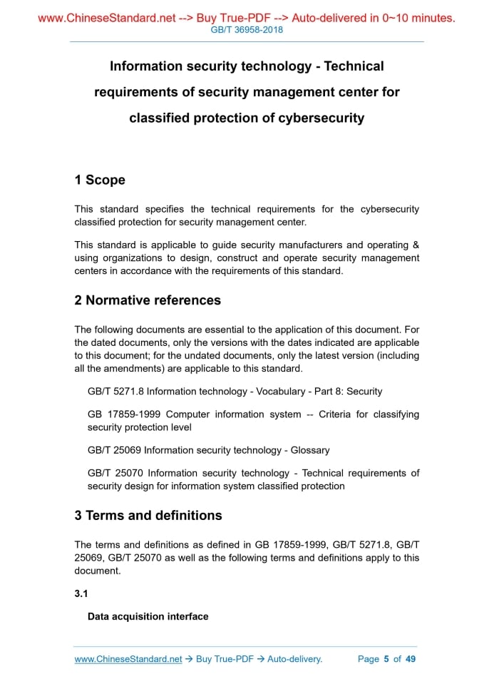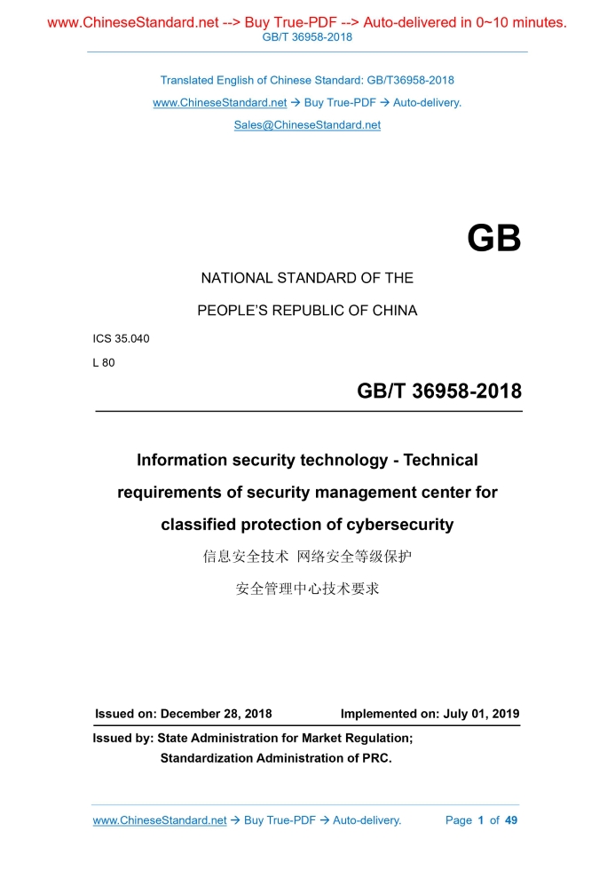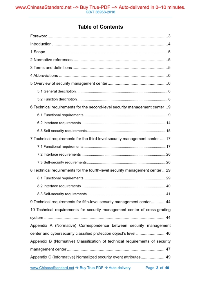 Similar standardsGB/T 36958-2018: Information security technology - Technical requirements of security management center for classified protection of cybersecurity---This is an excerpt. Full copy of true-PDF in English version (including equations, symbols, images, flow-chart, tables, and figures etc.), auto-downloaded/delivered in 9 seconds, can be purchased online: https://www.ChineseStandard.net/PDF.aspx/GBT36958-2018 GB NATIONAL STANDARD OF THE PEOPLE’S REPUBLIC OF CHINA ICS 35.040 L 80 Information security technology - Technical requirements of security management center for classified protection of cybersecurity Issued on. DECEMBER 28, 2018 Implemented on. JULY 01, 2019 Issued by. State Administration for Market Regulation; Standardization Administration of PRC. Table of ContentsForeword... 3 Introduction... 4 1 Scope... 5 2 Normative references... 5 3 Terms and definitions... 5 4 Abbreviations... 6 5 Overview of security management center... 6 6 Technical requirements for the second-level security management center... 9 7 Technical requirements for the third-level security management center... 17 8 Technical requirements for the fourth-level security management center... 29 9 Technical requirements for fifth-level security management center... 44 10 Technical requirements for security management center of cross-grading system... 44 Appendix A (Normative) Correspondence between security management center and cybersecurity classified protection object’s level... 46 Appendix B (Normative) Classification of technical requirements of security management center... 47 Appendix C (Informative) Normalized security event attributes... 49ForewordThis standard was drafted in accordance with the rules given in GB/T 1.1-2009. Please note that certain contents of this document may involve patents. The issuing agency of this document is not responsible for identifying these patents. This standard was proposed by and shall be under the jurisdiction of the National Information Security Standardization Technical Committee (SAC/TC 260). Drafting organizations of this standard. The 15th Research Institute of China Electronics Technology Group Corporation (Information Industry Information Security Evaluation Center), the Third Research Institute of the Ministry of Public Security, the First Research Institute of the Ministry of Public Security, Wangshen Information Technology (Beijing) Co., Ltd. The main drafters of this standard. Huo Shanshan, Ren Weihong, Liu Jian, Zhang Yi, Dong Jingjing, Liu Kaiming, Zheng Guogang, Tao Yuan, Chen Guangyong, Li Qiuxiang, Lu Qing, Wang Gang.1 ScopeThis standard specifies the technical requirements for the cybersecurity classified protection for security management center. This standard is applicable to guide security manufacturers and operating & using organizations to design, construct and operate security management centers in accordance with the requirements of this standard.2 Normative referencesThe following documents are essential to the application of this document. For the dated documents, only the versions with the dates indicated are applicable to this document; for the undated documents, only the latest version (including all the amendments) are applicable to this standard. GB/T 5271.8 Information technology - Vocabulary - Part 8.Security GB 17859-1999 Computer information system -- Criteria for classifying security protection level GB/T 25069 Information security technology - Glossary GB/T 25070 Information security technology - Technical requirements of security design for information system classified protection3 Terms and definitionsThe terms and definitions as defined in GB 17859-1999, GB/T 5271.8, GB/T 25069, GB/T 25070 as well as the following terms and definitions apply to this document. 3.1 Data acquisition interface An interface that collects security events, vulnerabilities, related configuration and status information on monitoring objects such as host operating systems, database systems, network devices, security devices in the network environment.4 AbbreviationsThe following abbreviations apply to this document. CPU. Central Processing Unit CVE. Common Vulnerabilities & Exposures DDoS. Distributed Denial of Service5 Overview of security management center5.1 General description The security management center, as a system platform for unified management of the security policies of the cybersecurity classified protection objects and the security mechanism of the secure computing environment, the security area boundary and the secure communication network, realizes unified management, unified monitoring, unified audit, comprehensive analysis, collaborative protection. 5.2 Function description System management mainly uses administrators to configure, control and manage system resources and operations, including user identity management, system resource configuration, system loading and startup, abnormal handling of system operation, support for managing local and remote disaster backup and recovery.6 Technical requirements for the second-level security management center6.1 Functional requirements 6.1.1 System management requirements 6.1.1.2 Data protection 6.1.1.2.1 Data confidentiality Data confidentiality shall meet the following requirements. 6.1.1.2.2 Data integrity Data integrity shall meet the following requirements. 6.1.1.2.3 Data backup and recovery Data backup and recovery shall meet the following requirements. 6.1.1.3 Security incident management 6.1.1.3.2 Security event alarm Security event alarms shall have an alarm function, which can generate alarms based on preset thresholds when abnormalities are found. 6.1.1.3.3 Security incident response Security incident response shall meet the following requirements. 6.1.1.4 Risk management 6.1.1.4.1 Asset management Asset management shall meet the following requirements. 6.1.1.4.2 Threat management Threat management shall meet the following requirements. 6.1.1.4.3 Vulnerability management