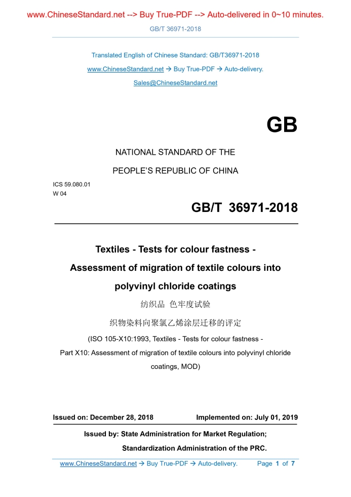 GB/T 36971-2018: Textiles -- Tests for colour fastness -- Assessment of migration of textile colours into polyvinyl chloride coatings Delivery: 9 seconds. True-PDF full-copy in English & invoice will be downloaded + auto-delivered via email. See step-by-step procedure Status: Valid