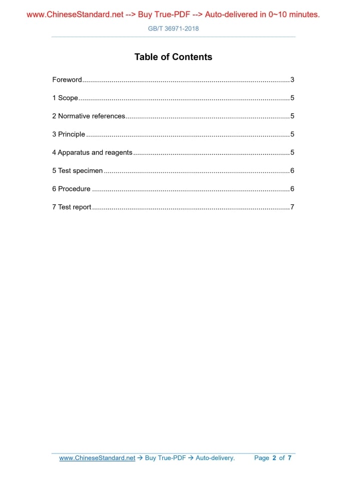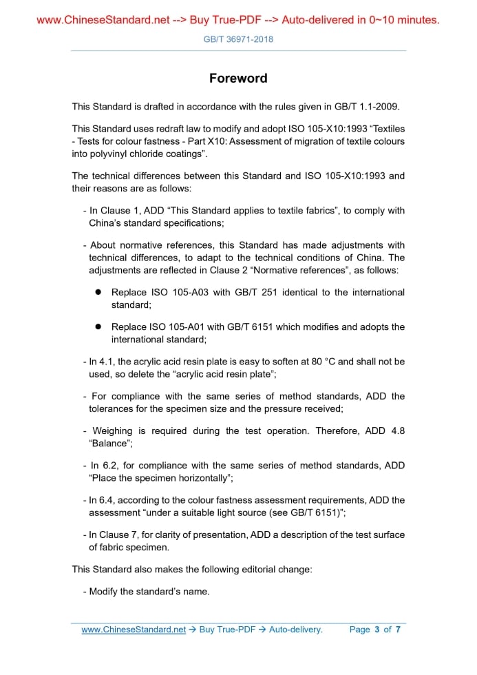 Similar standardsGB/T 36971-2018: Textiles -- Tests for colour fastness -- Assessment of migration of textile colours into polyvinyl chloride coatings---This is an excerpt. Full copy of true-PDF in English version (including equations, symbols, images, flow-chart, tables, and figures etc.), auto-downloaded/delivered in 9 seconds, can be purchased online: https://www.ChineseStandard.net/PDF.aspx/GBT36971-2018 GB NATIONAL STANDARD OF THE PEOPLE’S REPUBLIC OF CHINA ICS 59.080.01 W 04 Textiles - Tests for colour fastness - Assessment of migration of textile colours into polyvinyl chloride coatings (ISO 105-X10.1993, Textiles - Tests for colour fastness - Part X10. Assessment of migration of textile colours into polyvinyl chloride coatings, MOD) Issued on: DECEMBER 28, 2018 Implemented on: JULY 01, 2019 Issued by. State Administration for Market Regulation; Standardization Administration of the PRC. Table of ContentsForeword ... 3 1 Scope ... 5 2 Normative references ... 5 3 Principle ... 5 4 Apparatus and reagents ... 5 5 Test specimen ... 6 6 Procedure ... 6 7 Test report ... 7ForewordThis Standard is drafted in accordance with the rules given in GB/T 1.1-2009. This Standard uses redraft law to modify and adopt ISO 105-X10.1993 “Textiles - Tests for colour fastness - Part X10. Assessment of migration of textile colours into polyvinyl chloride coatings”. The technical differences between this Standard and ISO 105-X10.1993 and their reasons are as follows. - In Clause 1, ADD “This Standard applies to textile fabrics”, to comply with China’s standard specifications; - About normative references, this Standard has made adjustments with technical differences, to adapt to the technical conditions of China. The adjustments are reflected in Clause 2 “Normative references”, as follows. Replace ISO 105-A03 with GB/T 251 identical to the international standard; Replace ISO 105-A01 with GB/T 6151 which modifies and adopts the international standard; - In 4.1, the acrylic acid resin plate is easy to soften at 80 °C and shall not be used, so delete the “acrylic acid resin plate”; - For compliance with the same series of method standards, ADD the tolerances for the specimen size and the pressure received; - Weighing is required during the test operation. Therefore, ADD 4.8 “Balance”; - In 6.2, for compliance with the same series of method standards, ADD “Place the specimen horizontally”; - In 6.4, according to the colour fastness assessment requirements, ADD the assessment “under a suitable light source (see GB/T 6151)”; - In Clause 7, for clarity of presentation, ADD a description of the test surface of fabric specimen. This Standard also makes the following editorial change. - Modify the standard’s name. Textiles - Tests for colour fastness - Assessment of migration of textile colours into polyvinyl chloride coatings1 ScopeThis Standard specifies a method for determining the resistance of the colour in textile fabrics to migration into polyvinyl chloride (PVC) coating which contains plasticizer. This Standard applies to textile fabrics.2 Normative referencesThe following documents are indispensable for the application of this document. For the dated references, only the editions with the dates indicated are applicable to this document. For the undated references, the latest edition (including all the amendments) are applicable to this document. GB/T 251 Textiles - Tests for colour fastness - Grey scale for assessing staining (GB/T 251-2008, ISO 105-A03.1993, IDT) GB/T 6151 Textiles - Tests for colour fastness - General principle of testing (GB/T 6151-2016, ISO 105-A01.2010, MOD)3 PrincipleA specimen of a textile impregnated with plasticizer is brought into contact with a white polyvinyl chloride coating material; and under a certain pressure at 80 °C, kept for a certain period of time. Then the specimen is separated from the coating material. Excess plasticizer is removed from the coating material. USE the grey scale to assess the staining of the coating material.4 Apparatus and reagents4.1 Testing device, consisting of a frame of stainless steel into which a weight- piece of mass 5 kg and base 60 mm×115 mm is fitted, so that a pressure of ......Source: Above contents are excerpted from the full-copy PDF -- translated/reviewed by: www.ChineseStandard.net / Wayne Zheng et al. Tips & Frequently Asked Questions:Question 1: How long will the true-PDF of English version of GB/T 36971-2018 be delivered?Answer: The full copy PDF of English version of GB/T 36971-2018 can be downloaded in 9 seconds, and it will also be emailed to you in 9 seconds (double mechanisms to ensure the delivery reliably), with PDF-invoice.Question 2: Can I share the purchased PDF of GB/T 36971-2018_English with my colleagues?Answer: Yes. The purchased PDF of GB/T 36971-2018_English will be deemed to be sold to your employer/organization who actually paid for it, including your colleagues and your employer's intranet.Question 3: Does the price include tax/VAT?Answer: Yes. Our tax invoice, downloaded/delivered in 9 seconds, includes all tax/VAT and complies with 100+ countries' tax regulations (tax exempted in 100+ countries) -- See Avoidance of Double Taxation Agreements (DTAs): List of DTAs signed between Singapore and 100+ countriesQuestion 4: Do you accept my currency other than USD?Answer: Yes. www.ChineseStandard.us -- GB/T 36971-2018 -- Click this link and select your country/currency to pay, the exact amount in your currency will be printed on the invoice. Full PDF will also be downloaded/emailed in 9 seconds.How to buy and download a true PDF of English version of GB/T 36971-2018?A step-by-step guide to download PDF of GB/T 36971-2018_EnglishStep 1: Visit website https://www.ChineseStandard.net (Pay in USD), or https://www.ChineseStandard.us (Pay in any currencies such as Euro, KRW, JPY, AUD).Step 2: Search keyword "GB/T 36971-2018". Step 3: Click "Add to Cart". If multiple PDFs are required,
