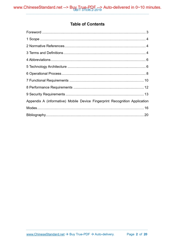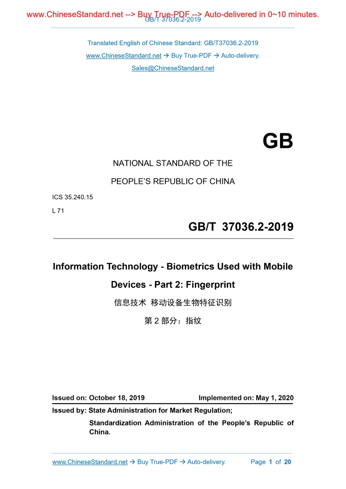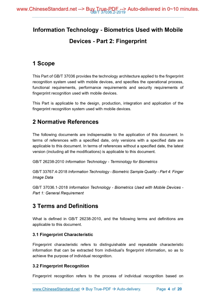 Similar standardsGB/T 37036.2-2019: Information Technology - Biometrics Used with Mobile Devices - Part 2: Fingerprint---This is an excerpt. Full copy of true-PDF in English version (including equations, symbols, images, flow-chart, tables, and figures etc.), auto-downloaded/delivered in 9 seconds, can be purchased online: https://www.ChineseStandard.net/PDF.aspx/GBT37036.2-2019 NATIONAL STANDARD OF THE PEOPLE’S REPUBLIC OF CHINA ICS 35.240.15 L 71 Information Technology - Biometrics Used with Mobile Devices - Part 2: Fingerprint ISSUED ON: OCTOBER 18, 2019 IMPLEMENTED ON: MAY 1, 2020 Issued by: State Administration for Market Regulation; Standardization Administration of the People’s Republic of China. Table of ContentsForeword ... 3 1 Scope ... 4 2 Normative References ... 4 3 Terms and Definitions ... 4 4 Abbreviations ... 6 5 Technology Architecture ... 6 6 Operational Process ... 8 7 Functional Requirements ... 10 8 Performance Requirements ... 12 9 Security Requirements ... 13 Appendix A (informative) Mobile Device Fingerprint Recognition Application Modes ... 16 Bibliography ... 20 Information Technology - Biometrics Used with Mobile Devices - Part 2: Fingerprint1 ScopeThis Part of GB/T 37036 provides the technology architecture applied to the fingerprint recognition system used with mobile devices, and specifies the operational process, functional requirements, performance requirements and security requirements of fingerprint recognition used with mobile devices. This Part is applicable to the design, production, integration and application of the fingerprint recognition system used with mobile devices.2 Normative ReferencesThe following documents are indispensable to the application of this document. In terms of references with a specified date, only versions with a specified date are applicable to this document. In terms of references without a specified date, the latest version (including all the modifications) is applicable to this document. GB/T 26238-2010 Information Technology - Terminology for Biometrics GB/T 33767.4-2018 Information Technology - Biometric Sample Quality - Part 4: Finger Image Data GB/T 37036.1-2018 Information Technology - Biometrics Used with Mobile Devices - Part 1: General Requirement3 Terms and DefinitionsWhat is defined in GB/T 26238-2010, and the following terms and definitions are applicable to this document. 3.1 Fingerprint Characteristic Fingerprint characteristic refers to distinguishable and repeatable characteristic information that can be extracted from individual’s fingerprint information, so as to achieve the purpose of individual recognition. 3.2 Fingerprint Recognition Fingerprint recognition refers to the process of individual recognition based on c) The main function of the presentation attach detection sub-function is to evaluate and judge the fingerprint samples; block the non-fingerprint samples; d) The main function of the fingerprint feature extraction sub-function is to extract fingerprint feature of fingerprint samples that have passed the quality judgment and presentation attack detection. The main function of the fingerprint characteristic storage module to form fingerprint template through fingerprint characteristic verified by the fingerprint characteristic capture module and store it on the physical chip. The main function of the fingerprint characteristic comparison module is to compare the fingerprint feature verified by the fingerprint characteristic capture module with the fingerprint template of the fingerprint characteristic storage module; output the comparison result to the mobile application. The server side includes the fingerprint characteristic storage module, the fingerprint characteristic comparison module and the three sub-functions (quality judgment, presentation attack detection and fingerprint feature extraction) in the fingerprint characteristic capture module. The functions of these functions and sub-functions are the same as the corresponding functions and sub-functions of the mobile device side. The application of biometrics in mobile devices may have multiple modes, which mainly include two modes: local recognition and remote recognition. The mode of local recognition means the fingerprint characteristic recognition process of mobile device is locally completed in the mobile device. In addition, the recognition result is output to the mobile application that calls the fingerprint recognition service. The mode of remote recognition means some functions (such as: fingerprint characteristic storage and / or fingerprint characteristic comparison functions) or sub- functions (such as: quality judgment, presentation attack detection and / or fingerprint feature extraction sub-functions) of fingerprint recognition are executed on the remote server. Generally speaking, the mode of local recognition is adopted. The specific recognition mode to be used depends on the application purpose and application environment of the biometric system used with mobile devices, as well as the overall design considerations. It is set in the recognition system solution. The description of the local recognition and remote recognition mode is shown in Appendix A.6 Operational ProcessThe operational process of fingerprint recognition used with mobile devices generally 3) End the fingerprint log-out process.7 Functional Requirements7.1 General Requirements 7.1.1 Basic functions It shall comply with the requirements of 6.1.1 in GB/T 37036.1-2018, which include, but are not limited to: a) Applicable to users of different races, different ages and different skin colors; b) Applicable to mobile device users and fingerprint recognition system administrators; c) Based on corresponding hardware and software conditions of the mobile device, it shall be able to support multi-modal or multi-factor fingerprint recognition. 7.1.2 Functional management It shall comply with the requirements of 6.1.2 in GB/T 37036.1-2018, which include, but