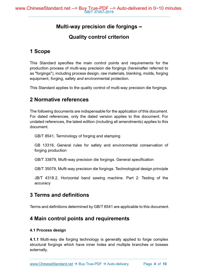 Similar standardsGB/T 37057-2019: Multi-way precision die forgings - Quality control criterion---This is an excerpt. Full copy of true-PDF in English version (including equations, symbols, images, flow-chart, tables, and figures etc.), auto-downloaded/delivered in 9 seconds, can be purchased online: https://www.ChineseStandard.net/PDF.aspx/GBT37057-2019NATIONAL STANDARD OF THE PEOPLE’S REPUBLIC OF CHINA ICS 77.140.85 J 32 Multi-way precision die forgings – Quality control criterion ISSUED ON: MARCH 25, 2019 IMPLEMENTED ON: OCTOBER 01, 2019 Issued by: State Administration for Market Regulation; Standardization Administration of the People’s Republic of China. Table of ContentsForeword ... 3 1 Scope ... 4 2 Normative references ... 4 3 Terms and definitions ... 4 4 Main control points and requirements ... 4 Multi-way precision die forgings – Quality control criterion1 ScopeThis Standard specifies the main control points and requirements for the production process of multi-way precision die forgings (hereinafter referred to as "forgings"), including process design, raw materials, blanking, molds, forging equipment, forging, safety and environmental protection. This Standard applies to the quality control of multi-way precision die forgings.2 Normative referencesThe following documents are indispensable for the application of this document. For dated references, only the dated version applies to this document. For undated references, the latest edition (including all amendments) applies to this document. GB/T 8541, Terminology of forging and stamping GB 13318, General rules for safety and environmental conservation of forging production GB/T 33879, Mufti-way precision die forgings. General specification GB/T 35079, Mufti-way precision die forgings. Technological design principle JB/T 4318.2, Horizontal band sawing machine. Part 2: Testing of the accuracy3 Terms and definitionsTerms and definitions determined by GB/T 8541 are applicable to this document.4 Main control points and requirements4.1 Process design 4.1.1 Multi-way die forging technology is generally applied to forge complex structural forgings which have inner holes and multiple branches or bosses externally. 4.1.2 Forging design shall minimize the surface machining allowance on the premise of satisfying the structural dimensions and mechanical properties of the part. The final forming part and cavity of the forging shall retain sufficient process margin; if necessary, the demander’s opinion shall be asked for the design result. 4.1.3 The process design process shall comply with the requirements that are specified in GB/T 35079; process specification (card) shall be prepared to guide the production process. The process specification (card) shall include at least the requirements and control methods for the processes such as cutting, heating, mold, forging, multi-way die-forging hydraulic machine control parameters, post-forging treatment. 4.1.4 For the process design process, numerical simulation technology should be used to optimize the process and process parameters. The forging steps should meet the requirements that are specified in GB/T 35079. 4.1.5 Each stage of the process design shall be reviewed; the design results shall also be reviewed by professionals of design, process, quality, and production; if necessary, demander’s opinion shall be asked for the design result. 4.2 Raw material 4.2.1 The raw materials shall have valid quality certification documents that are provided by the manufacturer; the chemical composition, appearance, size, mechanical properties and internal quality of the raw materials shall comply with the process requirements. 4.2.2 The raw materials shall be free of defects such as cracks, crusting, folding or inclusion on the surface. 4.2.3 After the raw materials are delivered to the factory, they shall be re- inspected by the quality inspection department. The items and requirements for re-inspection shall be implemented in accordance with GB/T 33879. 4.2.4 The raw materials shall be stored in sections according to materials, specifications, inspection status, and clearly marked. Materials and furnace batches shall be confirmed before the raw materials are shipped out, so as to prevent mixing. 4.3 Blanking 4.3.1 The raw materials should be sawed and blanked; the blanking shall meet the requirements of GB/T 35079. The precision of the sawing equipment shall meet the requirements of JB/T 4318.2. ......Source: Above contents are excerpted from the full-copy PDF -- translated/reviewed by: www.ChineseStandard.net / Wayne Zheng et al. Tips & Frequently Asked Questions:Question 1: How long will the true-PDF of English version of GB/T 37057-2019 be delivered?Answer: The full copy PDF of English version of GB/T 37057-2019 can be downloaded in 9 seconds, and it will also be emailed to you in 9 seconds (double mechanisms to ensure the delivery reliably), with PDF-invoice.Question 2: Can I share the purchased PDF of GB/T 37057-2019_English with my colleagues?Answer: Yes. The purchased PDF of GB/T 37057-2019_English will be deemed to be sold to your employer/organization who actually paid for it, including your colleagues and your employer's intranet.Question 3: Does the price include tax/VAT?Answer: Yes. Our tax invoice, downloaded/delivered in 9 seconds, includes all tax/VAT and complies with 100+ countries' tax regulations (tax exempted in 100+ countries) -- See Avoidance of Double Taxation Agreements (DTAs): List of DTAs signed between Singapore and 100+ countriesQuestion 4: Do you accept my currency other than USD?Answer: Yes. www.ChineseStandard.us -- GB/T 37057-2019 -- Click this link and select your country/currency to pay, the exact amount in your currency will be printed on the invoice. Full PDF will also be downloaded/emailed in 9 seconds.How to buy and download a true PDF of English version of GB/T 37057-2019?A step-by-step guide to download PDF of GB/T 37057-2019_EnglishStep 1: Visit websit
