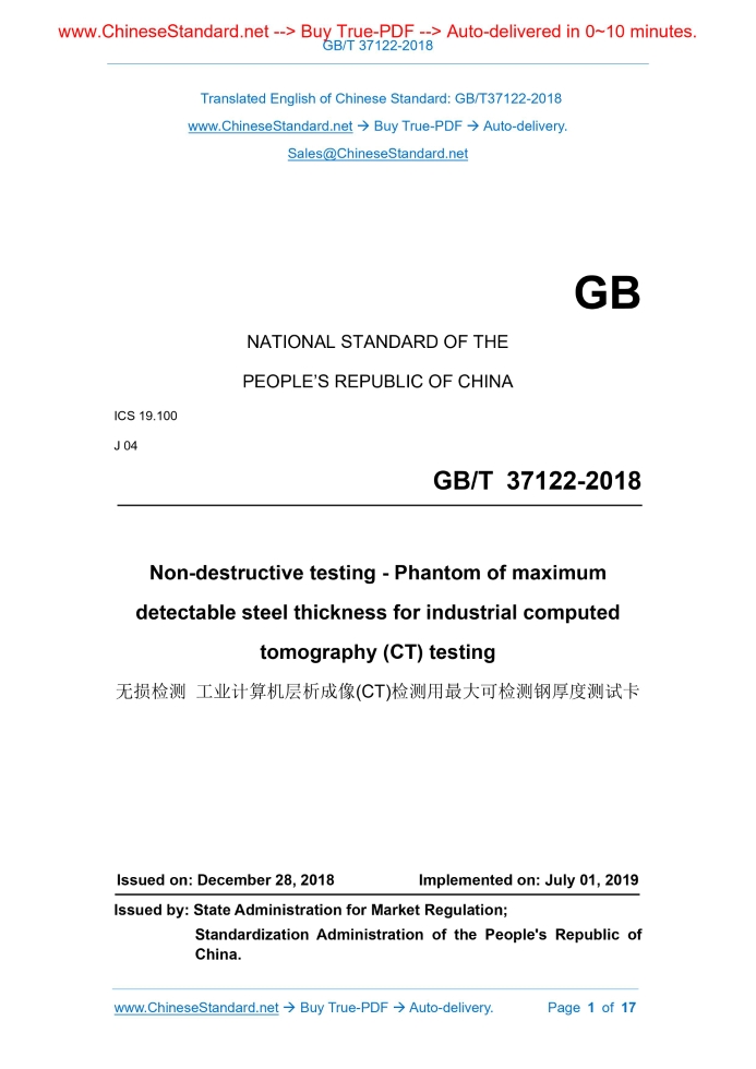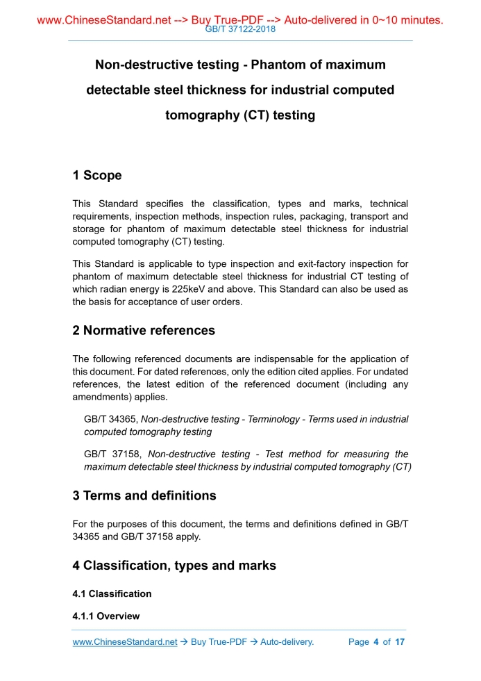 Similar standardsGB/T 37122-2018: Non-destructive testing - Phantom of maximum detectable steel thickness for industrial computed tomography (CT) testing---This is an excerpt. Full copy of true-PDF in English version (including equations, symbols, images, flow-chart, tables, and figures etc.), auto-downloaded/delivered in 9 seconds, can be purchased online: https://www.ChineseStandard.net/PDF.aspx/GBT37122-2018 NATIONAL STANDARD OF THE PEOPLE’S REPUBLIC OF CHINA ICS 19.100 J 04 Non-destructive testing - Phantom of maximum detectable steel thickness for industrial computed tomography (CT) testing ISSUED ON: DECEMBER 28, 2018 IMPLEMENTED ON: JULY 01, 2019 Issued by: State Administration for Market Regulation; Standardization Administration of the People's Republic of China. Table of ContentsForeword ... 3 1 Scope ... 4 2 Normative references ... 4 3 Terms and definitions ... 4 4 Classification, types and marks ... 4 5 Technical requirements ... 9 6 Inspection methods ... 13 7 Inspection rules ... 15 8 Marks and labels ... 17 9 Packaging, transport and storage ... 17 Non-destructive testing - Phantom of maximum detectable steel thickness for industrial computed tomography (CT) testing1 ScopeThis Standard specifies the classification, types and marks, technical requirements, inspection methods, inspection rules, packaging, transport and storage for phantom of maximum detectable steel thickness for industrial computed tomography (CT) testing. This Standard is applicable to type inspection and exit-factory inspection for phantom of maximum detectable steel thickness for industrial CT testing of which radian energy is 225keV and above. This Standard can also be used as the basis for acceptance of user orders.2 Normative referencesThe following referenced documents are indispensable for the application of this document. For dated references, only the edition cited applies. For undated references, the latest edition of the referenced document (including any amendments) applies. GB/T 34365, Non-destructive testing - Terminology - Terms used in industrial computed tomography testing GB/T 37158, Non-destructive testing - Test method for measuring the maximum detectable steel thickness by industrial computed tomography (CT)3 Terms and definitionsFor the purposes of this document, the terms and definitions defined in GB/T 34365 and GB/T 37158 apply.4 Classification, types and marks4.1 Classification 4.1.1 Overview provides marking pattern for ring of phantom of maximum detectable steel thickness. 4.3.2 Pattern 1: XD-I-0200 GB Where, XD - Line-pair phantom; I - I-type line-pair phantom; 0200 - Minimum sheet thickness is 0.20mm; GB - Comply with this Standard. 4.3.3 Pattern 2: YK-II-0400 GB Where, YK - Round-hole phantom; II - II-type round-hole phantom; 0400 - Minimum aperture is 0.40mm; GB - Comply with this Standard. 4.3.4 Pattern 3: YH-090-110 GB Where, YH - Ring; 090 - Inner diameter of ring is 90mm; 110 - Outer diameter of ring is 110mm; GB - Comply with this Standard.5 Technical requirements5.1 Ring 5.2.2.8 Tolerance of sheet thickness in line-pair phantom T does not exceed ±0.005mm. Tolerance of clearance width of adjacent sheets T is ±0.01mm. 5.2.2.9 Measured value of sheet length in line-pair phantom does not exceed ±0.05mm. 5.2.3 Materials 5.2.3.1 Substrate of line-pair phantom is made of No. 35 high-quality carbon structural steel or materials of equivalent performance. Substrate material of slot part of internal rectangle is transparent resin or air. 5.2.3.2 Sheet in line-pair pair is made of 65Mn or material of equivalent performance. 5.2.3.3 The material of line-pair phantom sealing cover is polymethyl methacrylate (plexiglass). Use glue to bond along with the edge of cylinder. Bonding shall not affect the transparency of the cover of substrate slot part. 5.3 Round-hole phantom 5.3.1 Appearance 5.3.1.1 Round-hole phantom shall use the upper and lower covers made of transparent material to bond, playing a role as sealing. There is no debris in the round hole. It shall mark testing position. 5.3.1.2 The marking content and position shall be correct. It shall use laser engravement in obvious places. The package does not block it. 5.3.1.3 The surface of round-hole phantom shall be clean, smooth and rust- proof. 5.3.2 Size 5.3.2.1 Outer diameter of round-hole phantom is D0. Tolerance is mm. 5.3.2.2 See Table 4 for models of round-hole phantom and corresponding outer diameter sizes. Table 4 -- Models of round-hole phantom and corresponding outer diameter sizes Model I-type II-type Outer diameter D0 mm 20 30 5.3.2.3 Thickness of sealing cover of round-hole phantom δ is 1mm. 6.2.1.2 For exit-factory inspection, it shall take three directions at an angle of 60° on the circumference of the ring to measure. 6.2.2 Inner diameter of ring d 6.2.2.1 Use an appropriate method of which error is not greater than 0.02mm to measure. 6.2.2.2 For exit-factory inspection, it shall take three directions at an angle of 60° on the circumference of the ring to measure. 6.3 Line-pair phantom 6.3.1 Sheet thickness T 6.3.1.1 Use an appropriate method of which error is not greater than 0.001mm to measure. 6.3.1.2 For type inspection, it shall appropriately select two points in upper and lower parts as measurement points on each metal sheet. And horizontally select three different positions at left, center and right at each measurement point. 6.3.1.3 For exit-factory inspection, it may measure the thickness of all metal sheets before line-pair phantom assembly. 6.3.2 Sheet spacing 2T 6.3.2.1 Use an appropriate method of which error is not greater than 0.005mm to measure. 6.3.2.2 For type inspection, it shall appropriately select two points in upper and lower parts as measurement points. And horizontally select three different positions at left, center and right at each measurement point. 6.3.2.3 For exit-factory inspection, it shall measure spacing of each two adjacent sheets. 6.3.3 Sheet length L 6.3.3.1 Use an